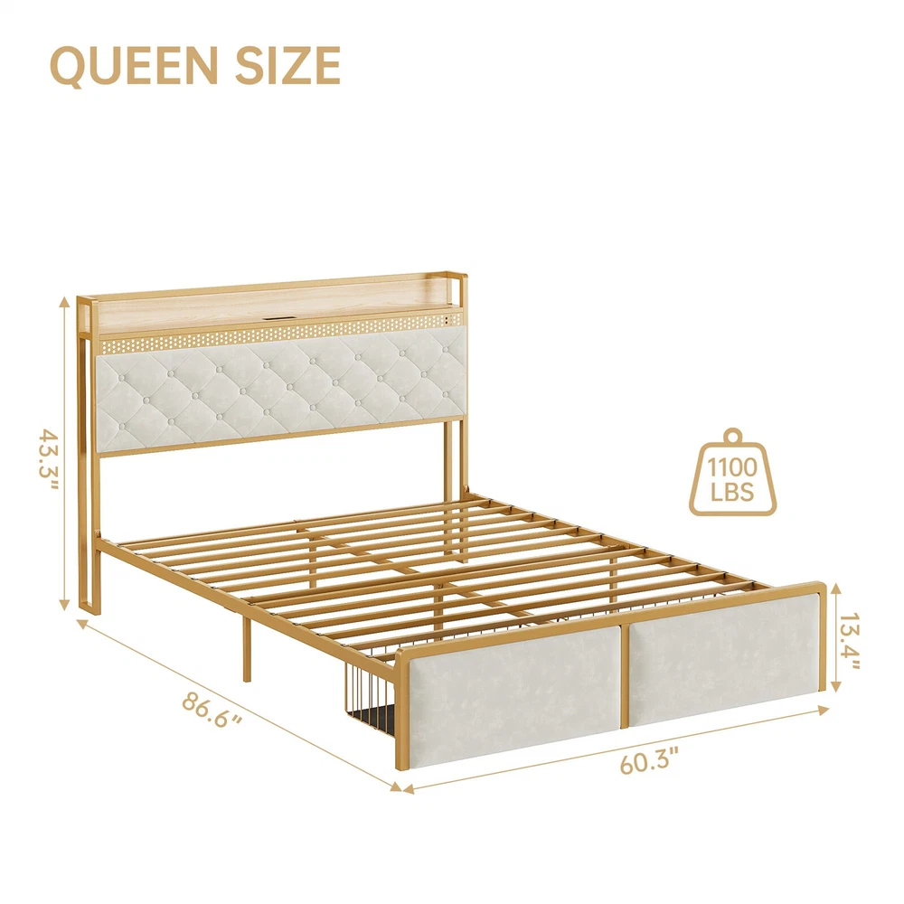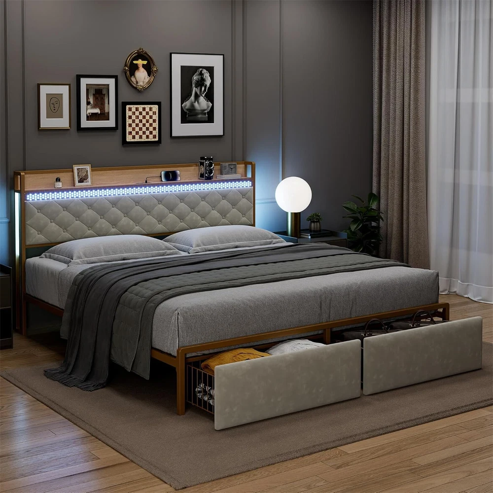 Queen Bed Frame with Storage Headboard and 2 Drawers LED Lights Metal Platform