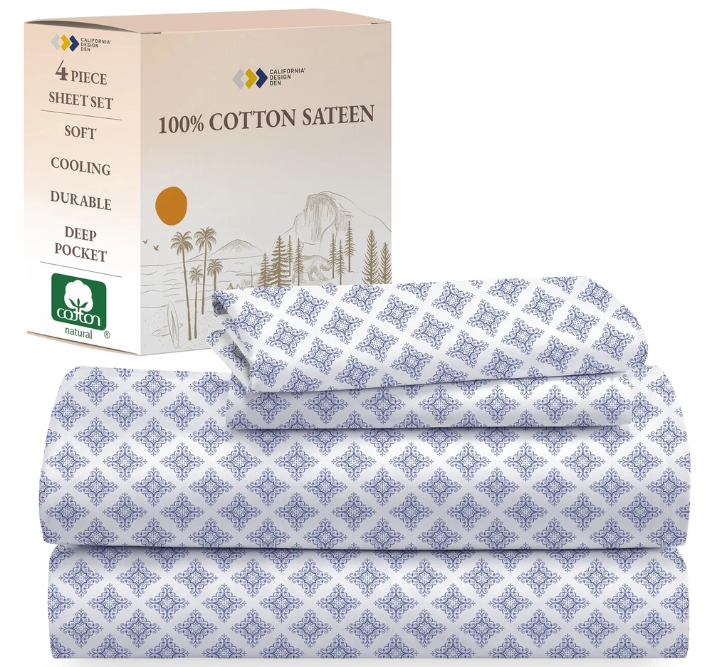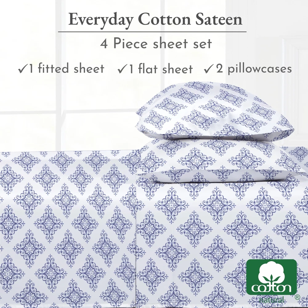 Discover the perfect blend of style and comfort with our printed sheet sets. If you're looking to add a pop of personality to your bedding, our 100% cotton sateen printed sheet sets are the perfect solution! Not only are these sheets incredibly comfortable, but the clear and well-defined prints allow you to express your personal style in a subtle yet impactful way. We believe that bedding should be both stylish and practical, which is why our printed sheets meet the highest standards of quality and durability. The naturally luxurious and soft fabric provides a comfortable night's sleep, while the vibrant, long-lasting colors resist fading with washing. Crafted from the finest sateen cotton, our printed sheet sets feature exceptional print quality. The tight weave of the fabric creates an ideal canvas for beautiful, balanced prints without any misprints or loud patterns. Our 4-piece printed sheet sets for Queen, King, and California King come with 14-inch deep pockets, fitting mattresses from 8 to 14 inches deep. The 3-piece printed sheet sets for Twin and Twin XL come with 12-inch deep pockets, fitting mattresses from 8 to 12 inches deep. The strong, secure elastic ensures that your sheets stay in place throughout the night, maintaining their fit even after years of use. Elevate your bedding with our printed sheets, featuring a variety of fun florals and stripes. Showcase your personality and add a pop of color to your bedroom with these stylish and practical sheet sets. TIMELESS ELEGANCE, COZY COMFORT: Luxuriate in our 100% cotton Soft 100% Cotton Sateen printed filigree sheet set. Premium long staple cotton ensures lasting softness. Vibrant colors endure wash after wash. Reminiscent of traditional craftsmanship, the intricate filigree pattern adds exquisite charm to your bedroom aesthetic. CRAFTED TO FIT: Our 4-piece queen bed sheets set boasts quality stitching and 14-inch deep pockets, accommodating mattresses from 8-14 inches deep. Pillowcases feature envelope closure for a tidy appearance. The fitted sheet of this queen sheet set deep pocket has all-around elastic and a head side / foot side indicator for effortless bed-making. DURABLE & LOW MAINTENANCE: Our cooling sheets for hot sleepers are machine washable and dryable at a normal setting, maintaining their quality for years. With no linting, wrinkles, or pilling, these deep-pocket queen sheets retain their color and size wash after wash. PERSONALIZED COMFORT & WELL-BEING: Upgrade your bedroom decor effortlessly with our 100% cotton sheet set, featuring classic stripes to chic florals. Crafted from long staple cotton, each set ensures comfort and well-being. OUR COMMITMENT: In 2022 & 2023, we donated over 22,000 pieces of bedding to local charities in USA. Our packaging is plastic-free, and our sheets are crafted in our family-owned factory in India. We ensure quality and provide a hassle-free 30-day return policy, even for used products.
