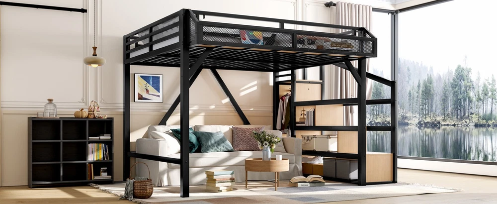 Queen Loft Bed with Storage Stairs, Shelves & Built-in Wardrobe, Metal Loft Bed Features 【Maximized Storage with Built-in Wardrobe & Shelves】This queen loft bed with storage is designed for organization and function. It includes a built-in wardrobe, open shelving, and storage stairs — perfect for storing clothes, books, toys, or essentials while saving space in your bedroom. 【Convenient USB Ports & LED Light Strip Included】More than just a bed — this metal loft bed features built-in USB ports and LED lighting, making it ideal for late-night reading, studying, or charging devices without leaving your bed. A great choice for teens, students, or dorm living. 【Safe Climb Design with Full-Length Guardrails】Stay secure with full-length guardrails on the top bunk and sturdy stairs that double as storage. This loft bed with stairs offers both safe access and added functionality, giving you peace of mind for older kids or young adults. 【Sturdy Metal Frame with Noise-Reducing Structure】Crafted with a heavy-duty metal frame, this queen loft bed is reinforced with premium hardware for durability and stability. Special noise-reducing connectors help minimize squeaking, offering a smoother, quieter sleeping experience. 【Easy Assembly with Complete Kit Included】This space-saving loft bed includes all necessary tools and a detailed illustrated manual for hassle-free setup. Whether you’re a DIY beginner or experienced, you can assemble it confidently and quickly without professional help. Descriptions Description Upgrade your bedroom with this all-in-one Queen Loft Bed with Storage and Built-in Features, designed to maximize space while offering convenience, safety, and style. Ideal for teens, students, or anyone in need of vertical storage, this space-saving loft bed turns your sleeping area into a multifunctional living solution. Built with a durable metal frame, this loft bed features a smart layout that includes storage stairs, open shelves, and a built-in wardrobe — perfect for organizing clothes, books, toys, and essentials without taking up extra room. It’s a complete storage solution built right into your bed. Designed for modern living, the bed comes equipped with USB charging ports and LED strip lighting, making it easy to charge your devices or read at night without needing extra furniture or cords. Convenience and style come together in one streamlined setup. Weight & Dimensions Product Type Metal Loft Bed Color Natural Wood Size Queen Material Metal+MDF Overall Product Dimension 96.85”L*62.9’W*63.39”H Overall Product Weight 164.24 LBS Weight Capacity 350LBS Recommend Mattress Thickness 6'' Number of Package 2 Package Dimension & Weight Please refer to the Specification Level of Assembly Full Assembly Needed Eligible for Hardware Packs Yes Country of Origin China Note All the pictures are taken by actual samples, slight chromatic aberration may occur due to lighting or display.
