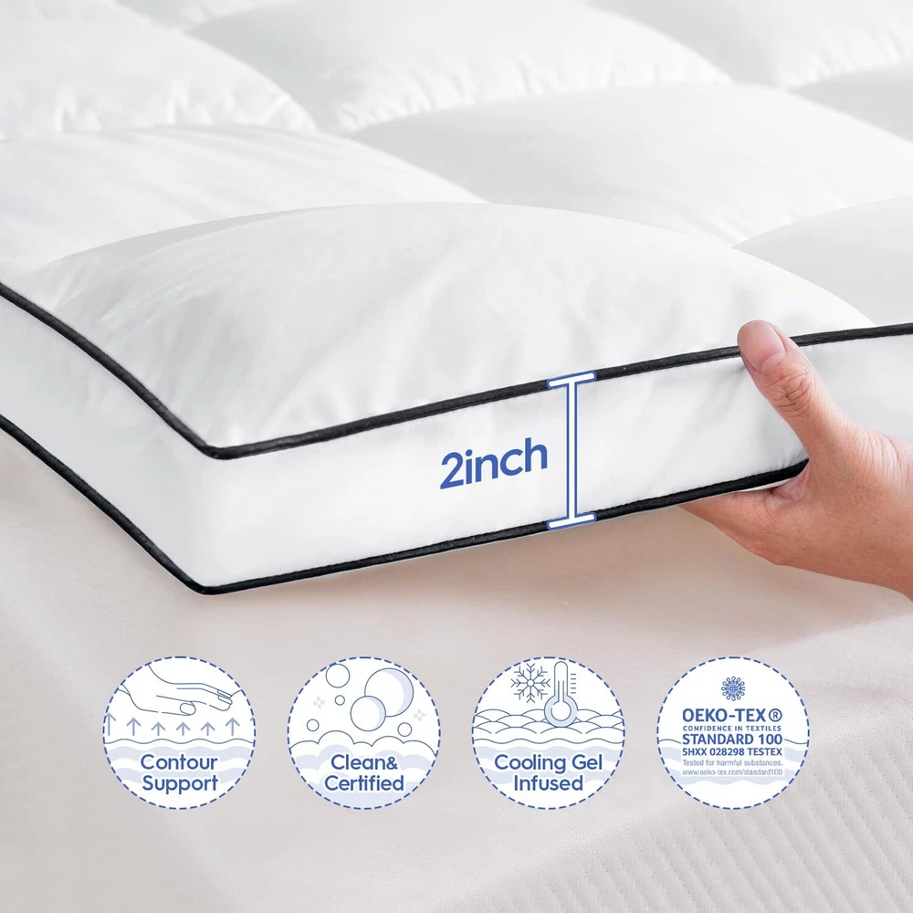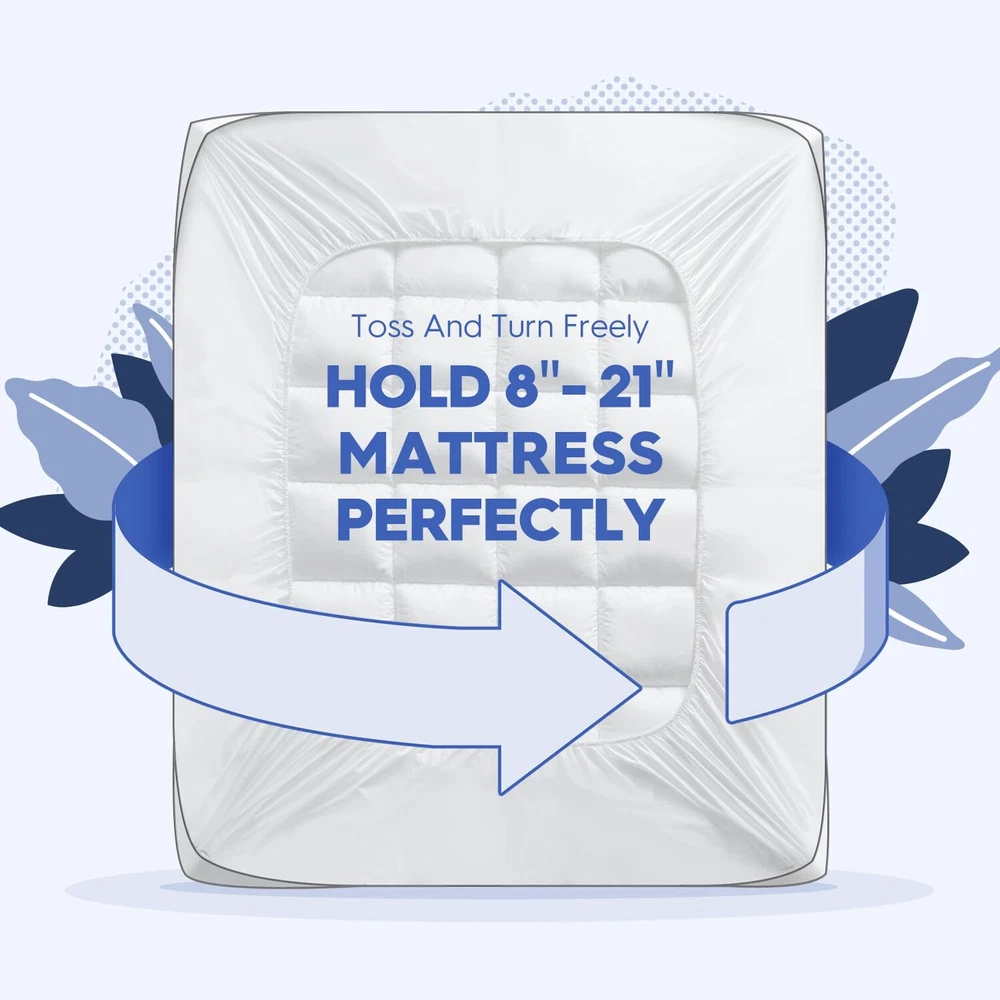 【REFRESH YOUR OLD MATTRESS】mattress topper filled with 6D snow down alternative fill, a state-of-the-art fiberfill that has the feel of authentic goose and down without the feathers and poking. Overfilled with 900GSM, the mattress topper is extra thick providing unbeatable comfort and it is like sleeping on a cloud. This premium topper has a layer that balances temperature control and ensures you stay cool in summer and warm in winter to enjoy optimal relaxation, reading, and sleeping. 【RELIEVE PAIN & IMPROVE SLEEP】This mattress topper has thick buffer space that gives you ergonomic support from head to toe, easily conforms to the curves and shape of your body so that your shoulder, neck, back, and spine can be in the most relaxed state to relieve pain. The medium firm design completely changes the firmness of your bed from way too soft or too firm to just right, instantly elevating your sleep into a delicious bliss. 【8-21 INCH DEEP POCKET & ALL-ROUND PROTECTION】Equipped with an all-around elastic skirt to protect your mattress from dirt. The skirt is made of the same fabric as the mattress topper for double-sided use and increased durability. Depth of 8-21 inches, allowing you to toss and turn freely on sleepy nights. Great gifts for men and women, moms and dads, Valentine's Day - Mother's Day - Father's Day - Thanksgiving and Christmas. 【EXCELLENT HAND-MADE QUALITY & MACHINE WASHABLE TIPS】Purely handmade, more delicate, and more sustainable than machine sewing. Certified STANDARD100 by OEKO-TEX with full protection. Due to the professional compressed vacuum packaging, the mattress topper may be slightly lumpy when you first open it, which is normal, please tap hard to make the filling even and leave for 24-48 hours to let the air in to make it fully fluffed. Machine washable, gentle cycle with cold water, tumble dry low. 【CHANCE TO EXPERIENCE A LUXURIOUS SLEEP】invites you to experience the luxury, craftsmanship, performance, and commitment to providing you with exclusive, comfort-oriented creations. Each mattress topper is designed for unparalleled comfort, seamlessly transforming your bed into a luxurious, hotel-quality comfort bed. promises a 30-day no-questions-asked money-back !