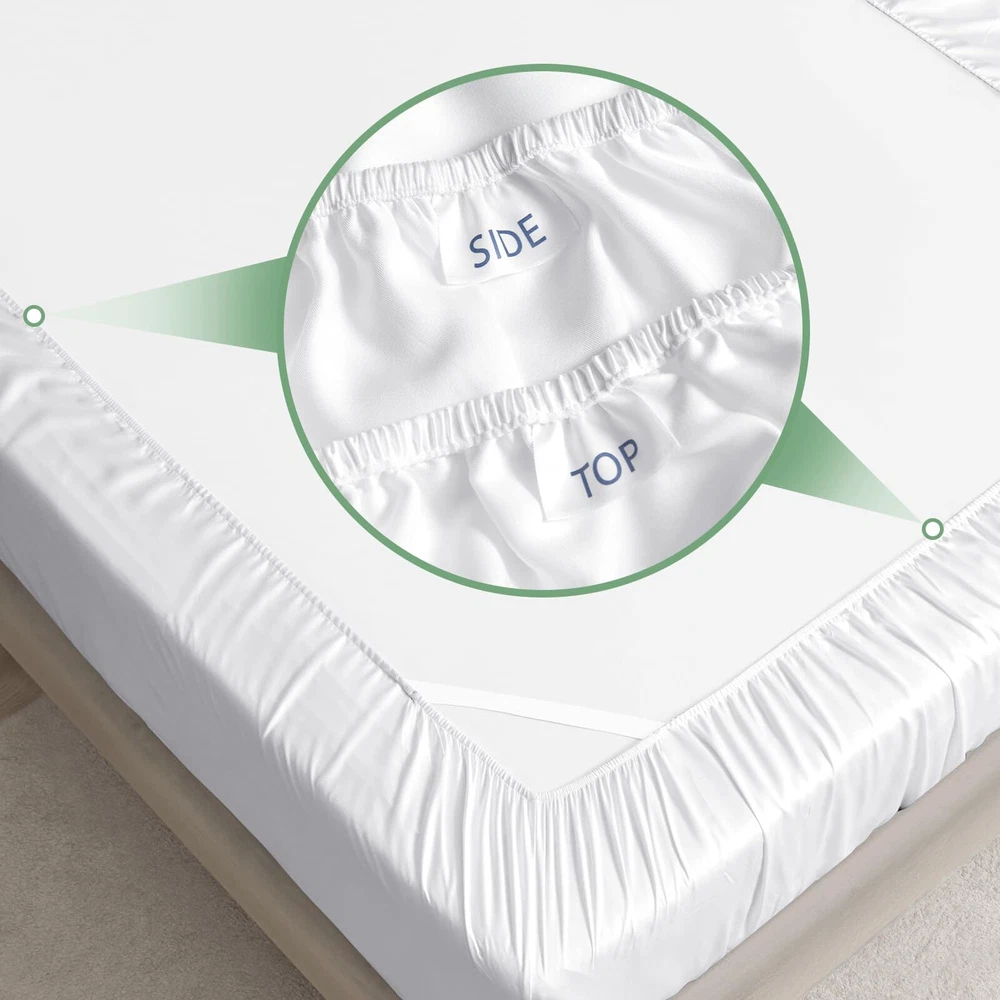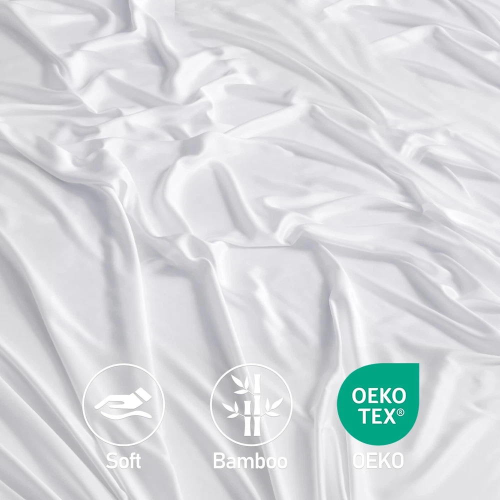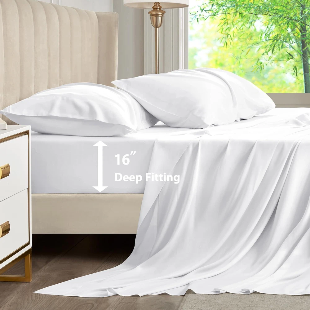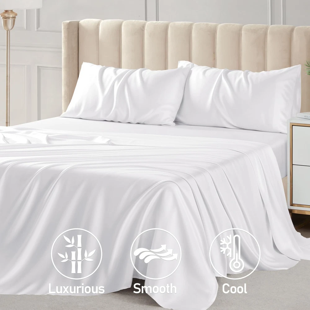 4 Piece Queen Sheet Set: Includes 1 deep pocket fitted sheet(60x80 IN), 1silky sateen weave sheets flat sheet(90x102 IN) and 2 envelope-style pillowcases(20x30 IN) with overlapping closure Cool & Breathable: Rayon Derived from Bamboo sheets have natural heat dissipation and a cool and comfortable surface. Using advanced breathable weaving technology, the unique mesh structure allows air to flow freely between the sheets and the body, helping to quickly dissipate heat, regulate body temperature, and improve sleep quality throughout the night Silky & Soft: Our luxury sheets set are made from 100% Rayon Derived from Bamboo, it has a delicate and soft texture, feels silky and smooth, and brings a refreshing skin experience. Its natural material is not only gentle and skin-friendly, but also effectively reduces friction, and is particularly friendly to hair, reducing the trouble of hair tangling after getting up in the morning Practical Design: The cooling sheets are designed to be both stylish and functional, with "TOP" and "SIDE" labels to guide placement, and 16-inch elastic straps to keep the sheet securely in place. Each sheet set also includes two envelope-style pillowcases, which prevent hair from being pressed down while sleeping, and keep the pillow insert from slipping out Easy to Care: The bed sheet set design is convenient and easy to take, and daily care is easy and quick. It is machine washable and supports low-temperature ironing, ensuring a fresh touch every time you use it. More importantly, the sheets set are not easy to fade or stain, Suitable for most users Helps Sleep: This sheet set has excellent texture and feels smoother and softer than cotton sheet set. Compared with polyester, it has better breathability and stays dry and comfortable. These good properties make it more suitable for improving sleep quality, providing you with a more comfortable sleeping environment, and helping you enjoy a good night's sleep