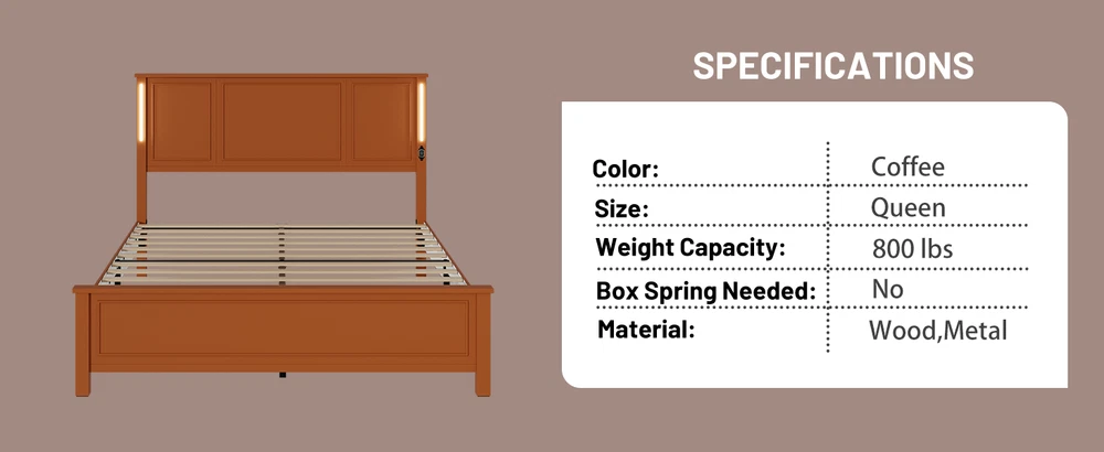 Brand Unbranded Item Length 64.37 Item Width 22.44 Item Height 4.92 Color Antique brown Frame Material MDF Metal Type BED FRAME Compatible Mattress Size As described Diamond-ring-1 Simple life Queen Size Bed Frame, Platform Bed Frame with Wood Headboard and Footboard,Charging Station and LED Lights, 12 Wood Slats Support, No Box Spring Needed , Brown Modern Design Style: This wood bed with headboard combines clean lines design to deliver a natural freshness in your bedroom. Antique White headboard of wooden bed frame adds a luxurious and sophisticated feel to your bedroom. Sturdy wooden structure: Platform bed frame is constructed of durable MDF, bringing the beauty of natural wood grain into your home. Comfortable Design:Coated with a natural and exquisite wear-resistant finish, the bed frame is easy to clean, and brings a comfortable atmosphere and feeling to your sleeping space. No box spring needed: Solid and narrow-spaced wooden slats support this queen size bed frame to work with the mattress eliminating the need for a box spring. The storage headboard of this bed features 1 USB ports & 1 Type C, Easily charge your devices, bed frame boasts an impressive Smart LED light bar headboard,Finger touch the light bar, the light bar full light, finger long press the light bar, the light bar brightness can be adjusted. Noise-Free & Easy Assembly: The innovative design of this platform bed frame ensures a quiet environment, free from pesky, squeaky noises, allowing you to enjoy uninterrupted sleep. With detailed illustrated instructions, numbered parts, and all necessary tools included in the package, assembly is straightforward and requires no professional skills Item Specifics Brand Unbranded Item Length 64.37 Item Width 22.44 Item Height 4.92 Color Antique brown Frame Material MDF Metal Type BED FRAME Compatible Mattress Size As described Payment Returns Diamond-ring-1 Simple life DESCRIPTION PAYMENT SHIPPING RETURN POLICY CONTACT US Shop Category Store Home Other Hot Item Delivery New List Item Help & Info Payment Policy Shipping Policy Return Policy FAQ About Us Queen Size Bed Frame, Platform Bed Frame with Wood Headboard and Footboard,Charging Station and LED Lights, 12 Wood Slats Support, No Box Spring Needed , Brown Modern Design Style: This wood bed with headboard combines clean lines design to deliver a natural freshness in your bedroom. Antique White headboard of wooden bed frame adds a luxurious and sophisticated feel to your bedroom. Sturdy wooden structure: Platform bed frame is constructed of durable MDF, bringing the beauty of natural wood grain into your home. Comfortable Design:Coated with a natural and exquisite wear-resistant finish, the bed frame is easy to clean, and brings a comfortable atmosphere and feeling to your sleeping space. No box spring needed: Solid and narrow-spaced wooden slats support this queen size bed frame to work with the mattress eliminating the need for a box spring. The storage headboard of this bed features 1 USB ports & 1 Type C, Easily charge your devices, bed frame boasts an impressive Smart LED light bar headboard,Finger touch the light bar, the light bar full light, finger long press the light bar, the light bar brightness can be adjusted. Noise-Free & Easy Assembly: The innovative design of this platform bed frame ensures a quiet environment, free from pesky, squeaky noises, allowing you to enjoy uninterrupted sleep. With detailed illustrated instructions, numbered parts, and all necessary tools included in the package, assembly is straightforward and requires no professional skills Item Specifics Brand : Unbranded Item Length : 64.37 Item Width : 22.44 Item Height : 4.92 Color : Antique brown Frame Material : MDF Metal Type : BED FRAME Compatible Mattress Size : As described Payment Returns All rights reserved.