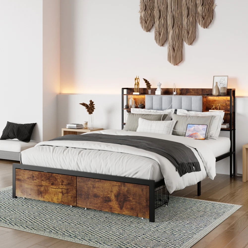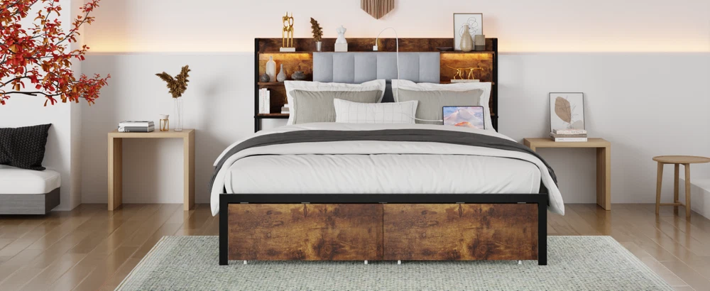 Brand Unbranded Item Length 62.5 Item Width 16.50 Item Height 7.40 Color Dark Brown Frame Material MDF Metal Type BED FRAME Compatible Mattress Size As described Diamond-ring-1 Simple life Queen Size Bed Frame with 2 Storage Drawers and LED Lights Headboard, Upholstered king Bed Frame with Charging Station, No Box Spring Needed, Easy Assembly Queen Size Bed Frame with 2 Storage Drawers - This king size bed frame is equipped with 2 wire netting storage drawers. These 2 storage drawers are attached to the bed frame and easily slide in and out, which provides convenient storage space for keeping your off-season clothing organized. 【Multifunctional Smart RGB LED Lights】The queen size bed frame comes with RGB led lights . It is built in music sync function, 60000 colors, multiple dynamic modes, turn on/off and timing setting function by IR remote control for convenient daily use. You can use it as reading light, night light or set a comforting mood for sleep or relax. It gives off a great vibe for the room. 【Sturdy, Stable and Well-built】The heavy duty metal frame is very sturdy and well-built. It is strong enough to hold up a memory foam mattress, a gel pad and also 2 persons on it.This queen bed frame is steady and firm with no wobbles or shakes. It also doesn’t make noise getting in and out of bed. You are able to get rid of your box spring and ensure a comfortable night’s sleep with this frame. 【Quick & Easy to Assemble】The assembly process is a breeze. The step-by-step guidance is easy to follow, and all the pieces were numbered. The platform bed frame is easy to setup and install. 【Great Storage Space】The headboard offers extra storage space but they don’t take any space at all. It’s convenient to store your phone, an alarm, water and photos if you are lacking a nightstand. The queen size platform bed frame has perfect height off the ground to store boxes, shoes, toys, books under the bed without being too obvious. It is easy to clean under and has enough room for a robot vacuum to get under. Item Specifics Brand Unbranded Item Length 62.5 Item Width 16.50 Item Height 7.40 Color Dark Brown Frame Material MDF Metal Type BED FRAME Compatible Mattress Size As described Payment Returns Diamond-ring-1 Simple life DESCRIPTION PAYMENT SHIPPING RETURN POLICY CONTACT US Shop Category Store Home Other Hot Item Delivery New List Item Help & Info Payment Policy Shipping Policy Return Policy FAQ About Us Queen Size Bed Frame with 2 Storage Drawers and LED Lights Headboard, Upholstered king Bed Frame with Charging Station, No Box Spring Needed, Easy Assembly Queen Size Bed Frame with 2 Storage Drawers - This king size bed frame is equipped with 2 wire netting storage drawers. These 2 storage drawers are attached to the bed frame and easily slide in and out, which provides convenient storage space for keeping your off-season clothing organized. 【Multifunctional Smart RGB LED Lights】The queen size bed frame comes with RGB led lights . It is built in music sync function, 60000 colors, multiple dynamic modes, turn on/off and timing setting function by IR remote control for convenient daily use. You can use it as reading light, night light or set a comforting mood for sleep or relax. It gives off a great vibe for the room. 【Sturdy, Stable and Well-built】The heavy duty metal frame is very sturdy and well-built. It is strong enough to hold up a memory foam mattress, a gel pad and also 2 persons on it.This queen bed frame is steady and firm with no wobbles or shakes. It also doesn’t make noise getting in and out of bed. You are able to get rid of your box spring and ensure a comfortable night’s sleep with this frame. 【Quick & Easy to Assemble】The assembly process is a breeze. The step-by-step guidance is easy to follow, and all the pieces were numbered. The platform bed frame is easy to setup and install. 【Great Storage Space】The headboard offers extra storage space but they don’t take any space at all. It’s convenient to store your phone, an alarm, water and photos if you are lacking a nightstand. The queen size platform bed frame has perfect height off the ground to store boxes, shoes, toys, books under the bed without being too obvious. It is easy to clean under and has enough room for a robot vacuum to get under. Item Specifics Brand : Unbranded Item Length : 62.5 Item Width : 16.50 Item Height : 7.40 Color : Dark Brown Frame Material : MDF Metal Type : BED FRAME Compatible Mattress Size : As described Payment Returns All rights reserved.