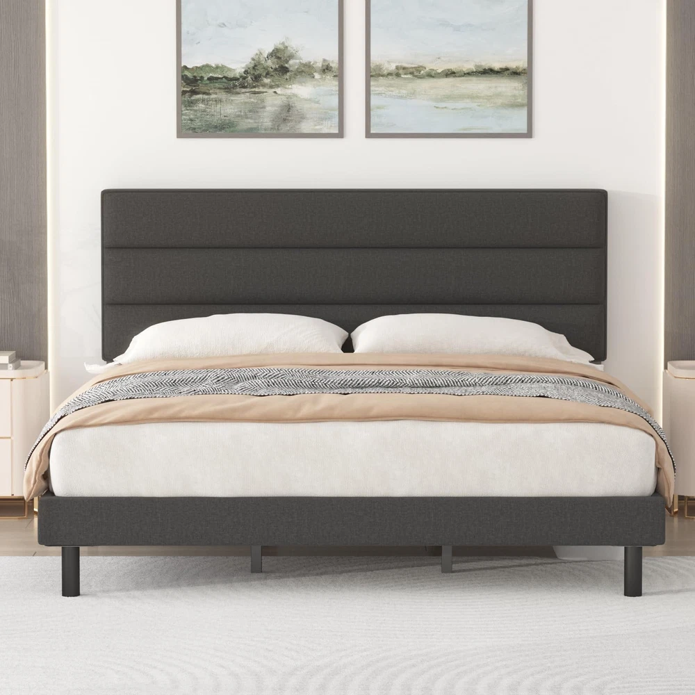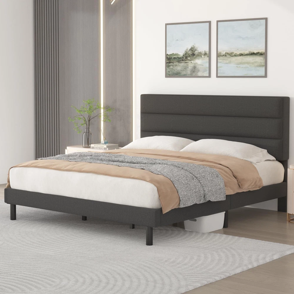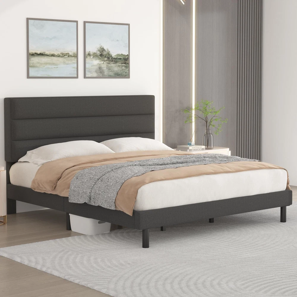 Modern Design:The queen bed frames comes with an upholstered headboard so you can relax or read with your back to the headboard Sturdy Metals Support:The queen size bed Frames is constructed from high-hardness Metals, ensuring exceptional stability; A central leg support system helps prevent sagging No Spring Box Needed:The Bed Frames queen size include sturdy slats that allow the mattress to be placed directly on top of the bed slats,no need for a spring box Easy Assembly:All the parts needed for assembly are stored inside the headboard and each part is clearly labeled for easy identification;You can assemble it in about 30 minutes Adhesion: The feet of the bed frames have non-slip pads to protect the floor and reduce the sound of friction