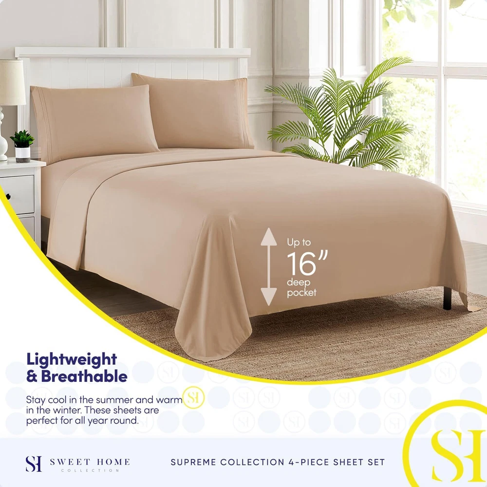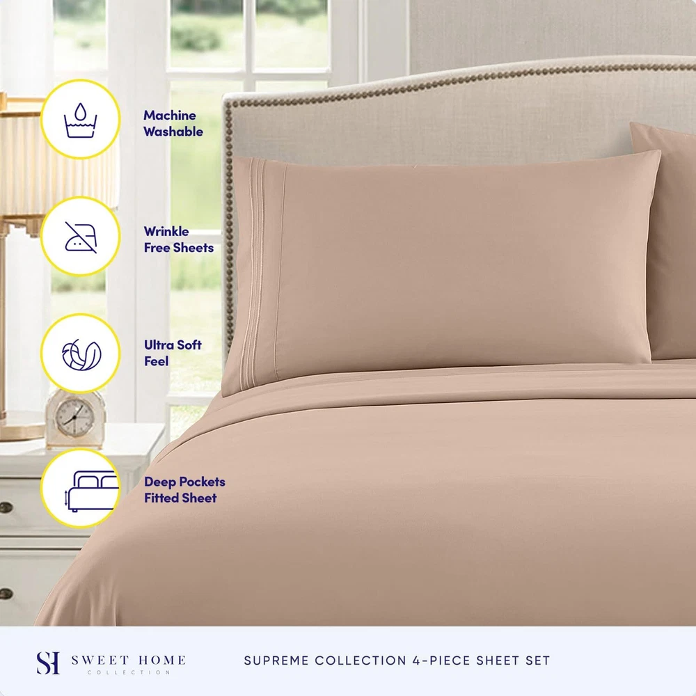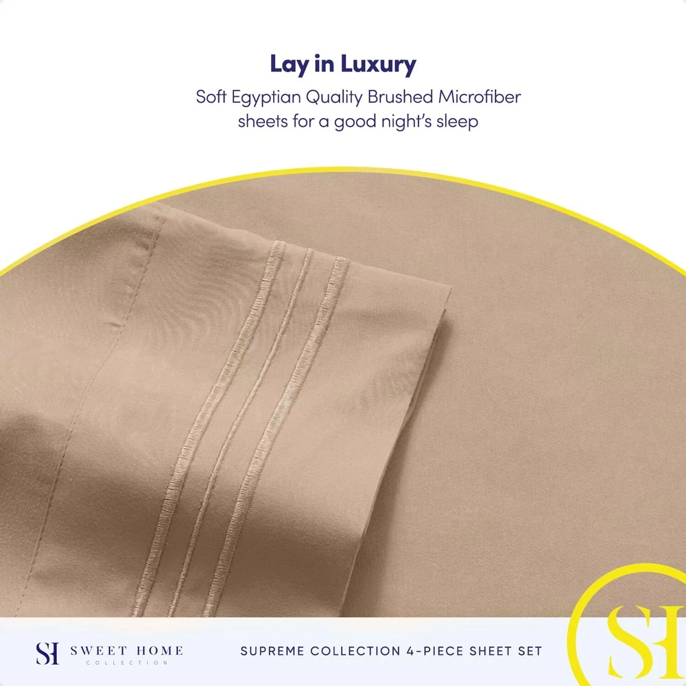 Good rest comes cheap! Cheap sheets are usually itchy, uncomfortable, and the enemy of good sleep. Not ’s luxury sheet set, though! Our brushed microfiber 1800 Supreme Collection Sheets are cooling, comfortable, and luxurious at an affordable price! No more dreading lying down on scratchy sheets. These soft luxury bed sheets promise rest and relaxation so you get the shuteye you need to start every day fully charged. No matter what you sleep on, we have the sheets for you! Ill-fitting sheets make for an unsatisfying night’s sleep. Whatever size your mattress is, has the perfectly fitted sheet set for you! Our sheet sets come in twin, twin XL, full, queen, king, and California king sizes to give everyone in the family a good night’s rest. Here are the measurements for the different bed sizes: Twin Sheets Flat: 66”x96” Fitted: 39”x75” Twin Bedding XL Flat: 102”x66” Fitted: 80”x39” Bedding Sets Full Flat: 81”x96” Fitted: 54”x75” Queen Sheets Flat: 92”x102” Fitted: 60”x80” RV Short Queen Bedding Flat: 90”x99” Fitted: 60”x75” King Bedding Flat: 102”x105” Fitted: 78”x80” Split King Size Bedding Flat: 108”x102” Fitted: 80”x39” each California King Sheets Flat: 102”x108” Fitted: 72”x84” *All of our sets come with 2 pillow cases, except the bed linens twin size, which comes with . The king linens come with 20”x40” king sized pillow cases, while the rest comes with standard size 20”x30”. Fitted sheets that fit your needs! Don’t buy sheets in colors that put you to sleep! Choose from 40 color choices with ’s sheet sets. Whether you need deep pocket queen sheets to go along with your white bedding for your clean and crisp bedroom, or you need pink girls bedding, find it all with ! Our colors include: beige, black, brown, burgundy, camel, gray, lavender, light blue, mint, mocha, navy, olive, pink, purple, red, royal blue, rust, sage, silver, strawberry pink, taupe, white, and yellow. Sleep satisfied! We want you to get the best night’s sleep and the best . If you don’t love your sheets on the first night you sleep on them, let us know, and we’ll help to make things right. There’s no need to sleep on it! Add ’s 1800 Thread Count Collection bed sheets to your cart today! Sweet dreams! ELASTIC CORNERS BUILT IN - What separates our bed sheets from the rest are the special elastic sheet straps built in. These elastic corners keep your fitted sheet secure to the bed and come on all of our sheets. LAY IN LUXURY – No more sleepless nights on uncomfortably itchy sheets! Sleep soundly on the softest 1800 Supreme Collection sheets. Be warned, though: You may never be an early bird again! SUPERB SHEET SET – Each luxurious set has 1 fitted, 1 flat sheet, and 2 pillowcases (NOTE: Twin & Twin XL sizes include 1 pillowcase). Deep pockets, thick elastic, and BUILT IN SHEET STRAPS make your new soft sheets stay in place! STAY CLEANER, LONGER – Who has time to wash their sheets every few nights? When it’s time for a wash, machine wash cold, and tumble dry low. PERFECT FIT FOR ANY BED – Sleep soundly for years to come! Your deep pocket sheets are fade, shrink, and resistant. We’ve got you (and your bed) covered.