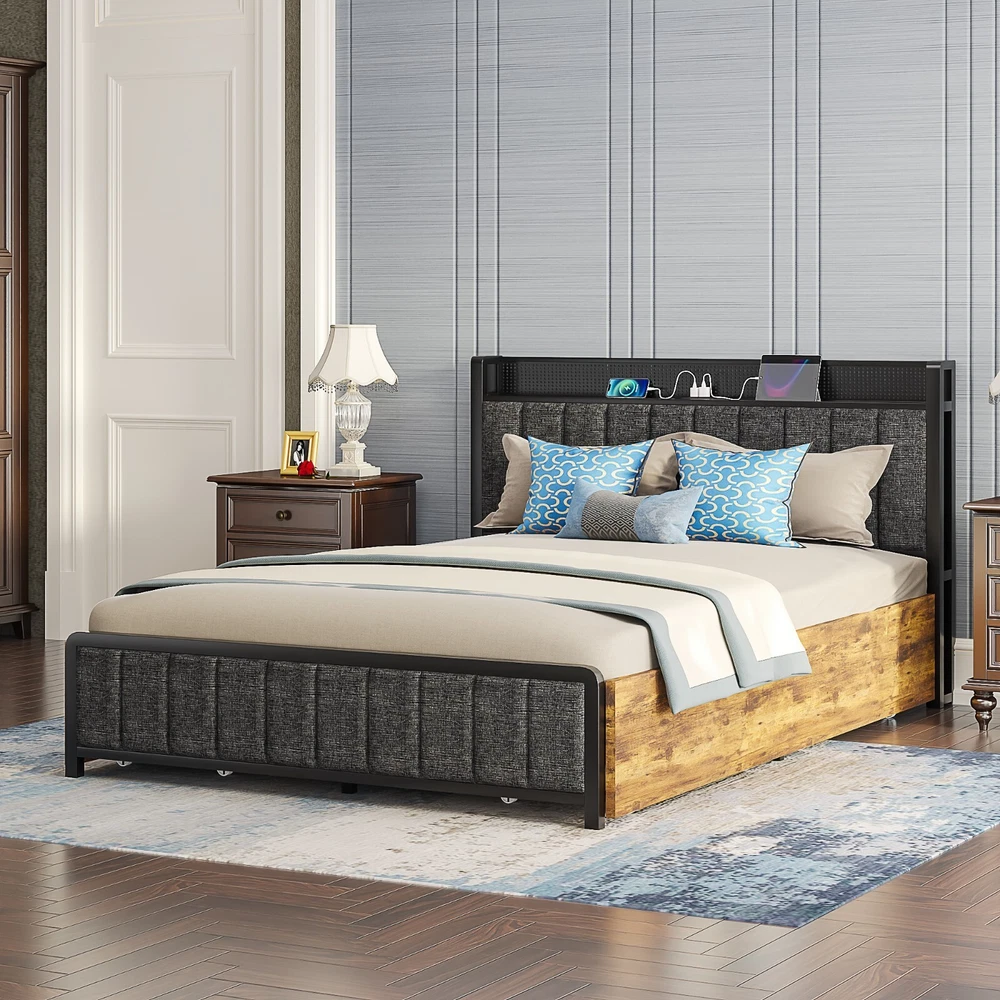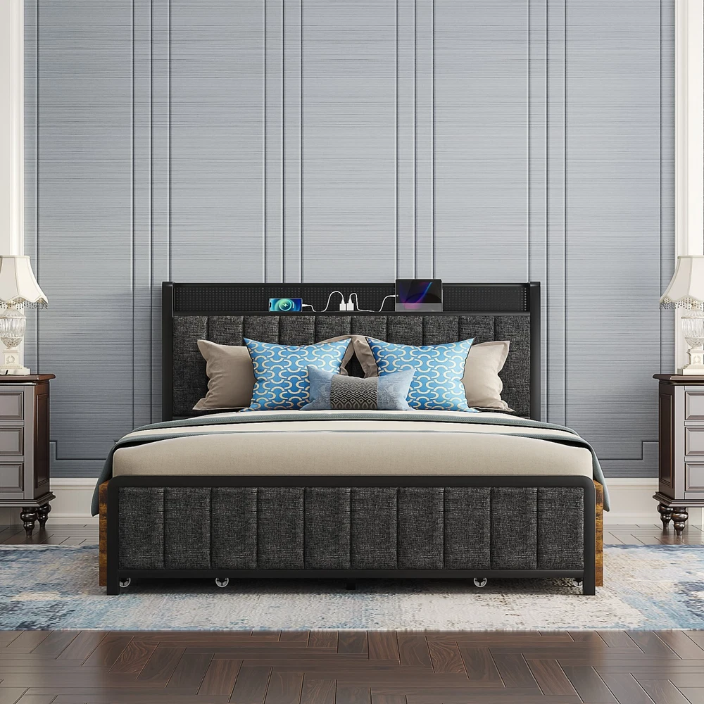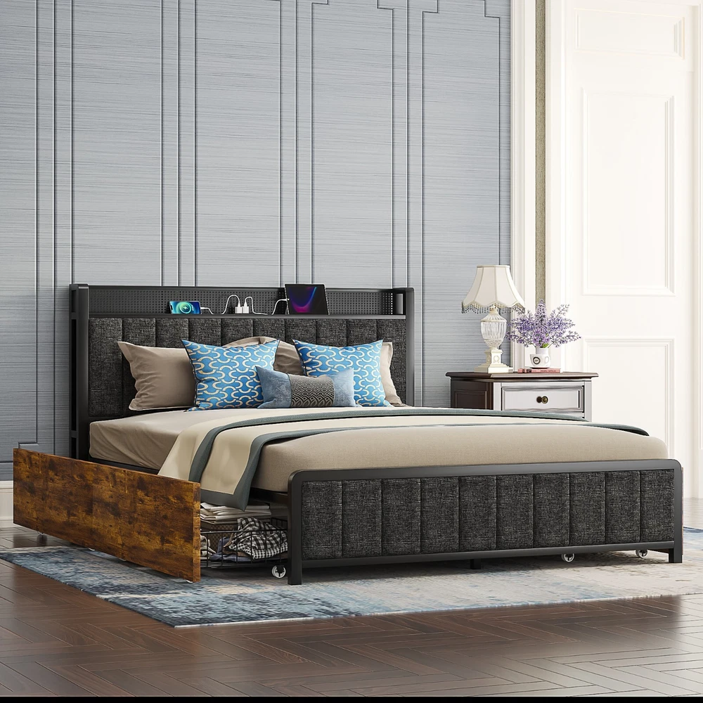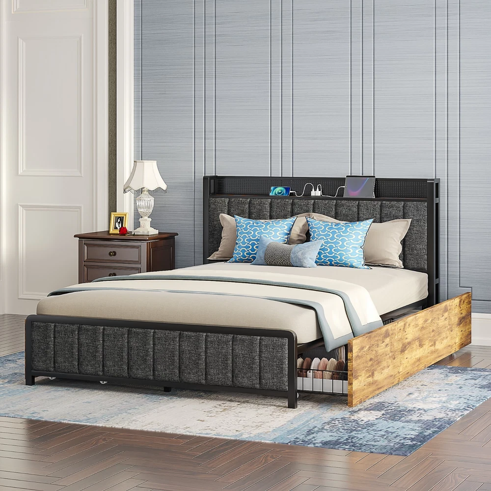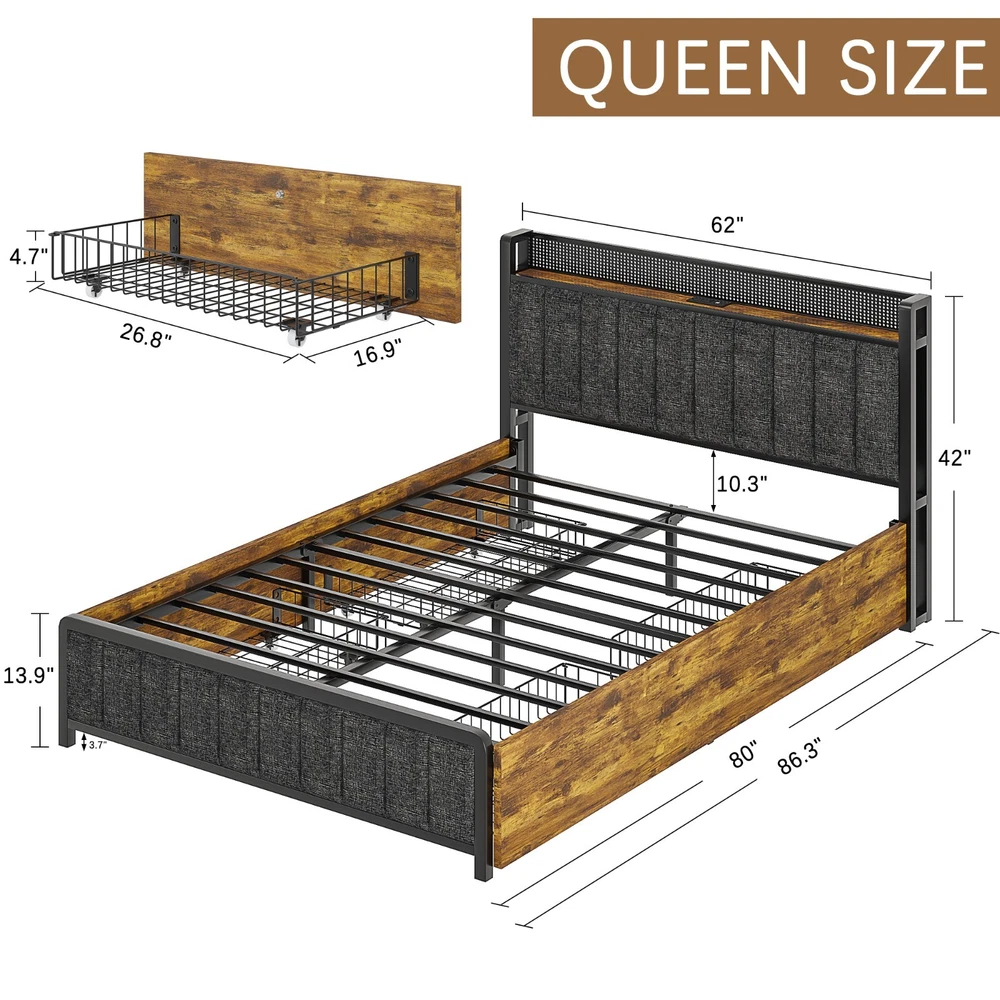 Featu res: 💡[Modern and Elegant Style] The simple and atmospheric decorative design style of the padded headboard is not only comfortable, but also brings you a warm and soft atmosphere. The elegant and classic design can be perfectly matched with various home decorations. It is a must-have for bedroom decoration. 💡 [Sturdy Structure] The metal frame and wooden slats and leg support platform can extend the life of the mattress and provide strong support for various types of mattresses. No spring box is required. 💡 [Space-saving Drawers] There are 4 steel drawers under our storage bed, providing enough storage space for your bedding, clothes, etc. With wheels, it can slide in and out quickly for easy access. 💡 [ Box Spring Free ] The metal frame and wooden strips support the platform to extend the life of the mattress, this upholstered bed frame is suitable for all kinds of mattresses, box springs, memory foam, latex or hybrid mattresses. 💡 [ Built-in Charging Station ] This platform bed frame comes with 2 standard sockets and 2 USB ports for efficient charging. Whether you are resting or reading, you can always charge your devices without moving. 💡 [ Easy to Assemble ] This bed can be quickly assembled, all parts, tools and assembly instructions are included. Just follow the pictures step by step. If you have any questions, please contact us. Specifications of Queen Size: Material: Metal Frame ; Wood Slats; MDF;Fabric Overall dimensions: 86 "L x 62"W x 4 2 "H Maximum weight capacity: 800 lb Queen weight : 92 lb Packing list: 1 x Bed Frame 1 x Installation instructions (all accessories included, no need to prepare your own tools ) Note: 1. Please allow ±1/0.5'' error due to manual measurement. 2.When viewing the color of the product on your monitor, it may differ from the actual color of the item. 3. Mattress, box spring, and bedding (comforter, sheets, pillows, etc.) are NOT included.