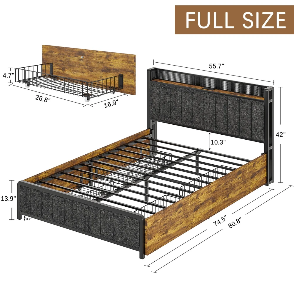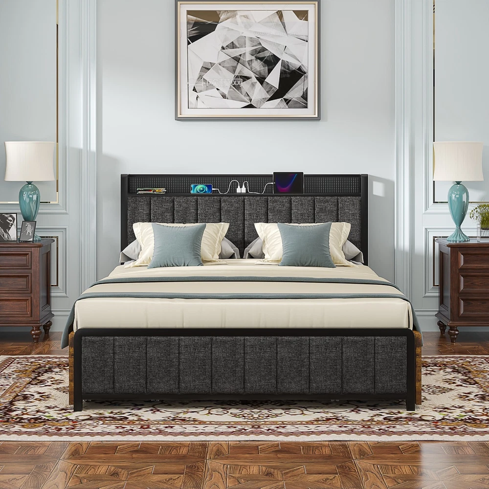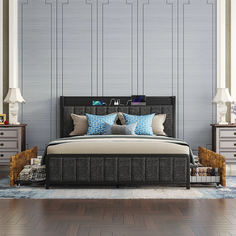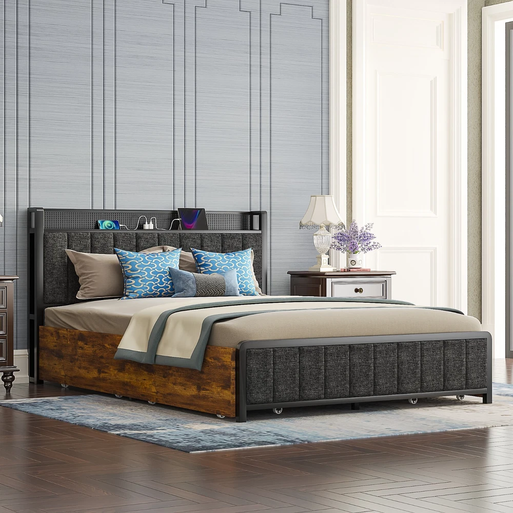 Featu res: 💡[Modern and Elegant Style] The simple and atmospheric decorative design style of the padded headboard is not only comfortable, but also brings you a warm and soft atmosphere. The elegant and classic design can be perfectly matched with various home decorations. It is a must-have for bedroom decoration. 💡 [Sturdy Structure] The metal frame and wooden slats and leg support platform can extend the life of the mattress and provide strong support for various types of mattresses. No spring box is required. 💡 [Space-saving Drawers] There are 4 steel drawers under our storage bed, providing enough storage space for your bedding, clothes, etc. With wheels, it can slide in and out quickly for easy access. 💡 [ Box Spring Free ] The metal frame and wooden strips support the platform to extend the life of the mattress, this upholstered bed frame is suitable for all kinds of mattresses, box springs, memory foam, latex or hybrid mattresses. 💡 [ Built-in Charging Station ] This platform bed frame comes with 2 standard sockets and 2 USB ports for efficient charging. Whether you are resting or reading, you can always charge your devices without moving. 💡 [ Easy to Assemble ] This bed can be quickly assembled, all parts, tools and assembly instructions are included. Just follow the pictures step by step. If you have any questions, please contact us. Specifications of Queen Size: Material: Metal Frame ; Wood Slats; MDF;Fabric Overall dimensions: 86 "L x 62"W x 4 2 "H Maximum weight capacity: 800 lb Queen weight : 92 lb Packing list: 1 x Bed Frame 1 x Installation instructions (all accessories included, no need to prepare your own tools ) Note: 1. Please allow ±1/0.5'' error due to manual measurement. 2.When viewing the color of the product on your monitor, it may differ from the actual color of the item. 3. Mattress, box spring, and bedding (comforter, sheets, pillows, etc.) are NOT included.