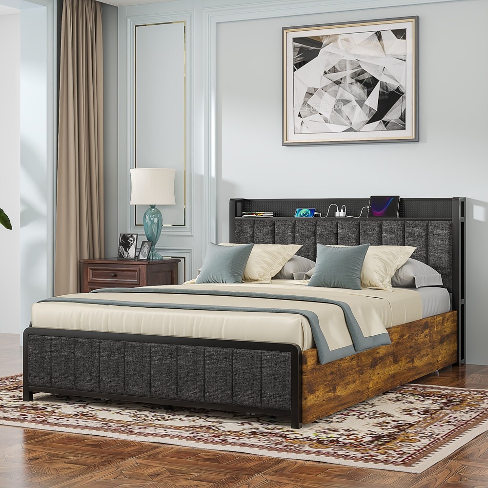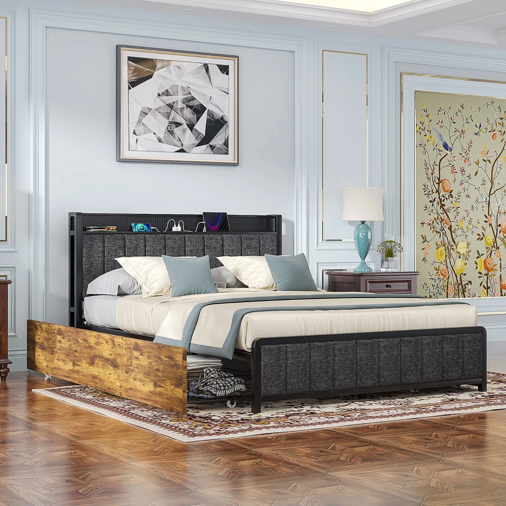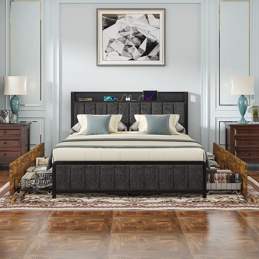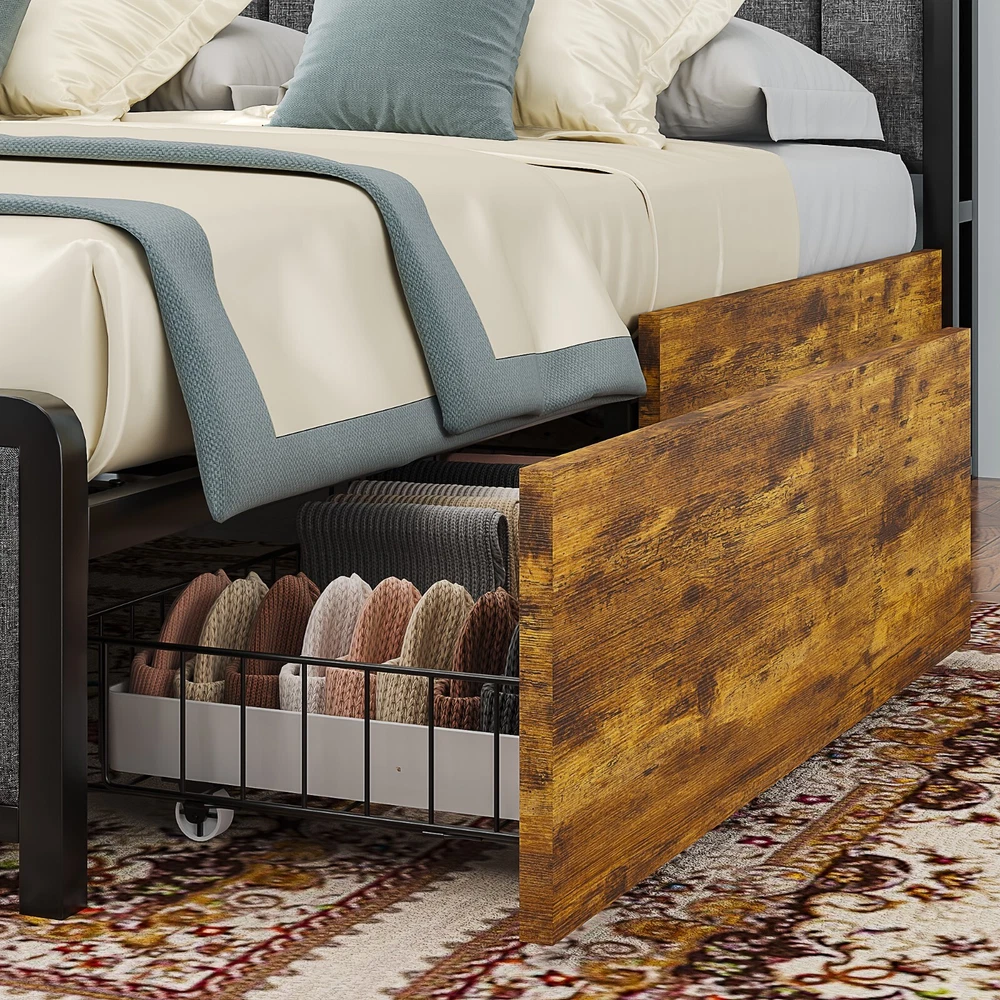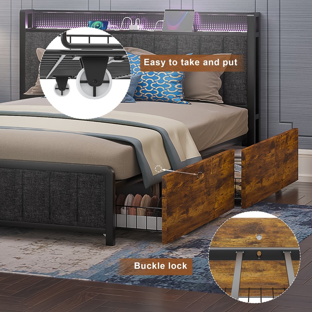 Featu res: 💡[Modern and Elegant Style] The simple and atmospheric decorative design style of the padded headboard is not only comfortable, but also brings you a warm and soft atmosphere. The elegant and classic design can be perfectly matched with various home decorations. It is a must-have for bedroom decoration. 💡 [Sturdy Structure] The metal frame and wooden slats and leg support platform can extend the life of the mattress and provide strong support for various types of mattresses. No spring box is required. 💡 [Space-saving Drawers] There are 4 steel drawers under our storage bed, providing enough storage space for your bedding, clothes, etc. With wheels, it can slide in and out quickly for easy access. 💡 [ Box Spring Free ] The metal frame and wooden strips support the platform to extend the life of the mattress, this upholstered bed frame is suitable for all kinds of mattresses, box springs, memory foam, latex or hybrid mattresses. 💡 [ Built-in Charging Station ] This platform bed frame comes with 2 standard sockets and 2 USB ports for efficient charging. Whether you are resting or reading, you can always charge your devices without moving. 💡 [ Easy to Assemble ] This bed can be quickly assembled, all parts, tools and assembly instructions are included. Just follow the pictures step by step. If you have any questions, please contact us. Specifications of Queen Size: Material: Metal Frame ; Wood Slats; MDF;Fabric Overall dimensions: 86 "L x 62"W x 4 2 "H Maximum weight capacity: 800 lb Queen weight : 92 lb Packing list: 1 x Bed Frame 1 x Installation instructions (all accessories included, no need to prepare your own tools ) Note: 1. Please allow ±1/0.5'' error due to manual measurement. 2.When viewing the color of the product on your monitor, it may differ from the actual color of the item. 3. Mattress, box spring, and bedding (comforter, sheets, pillows, etc.) are NOT included.