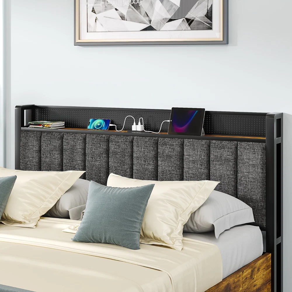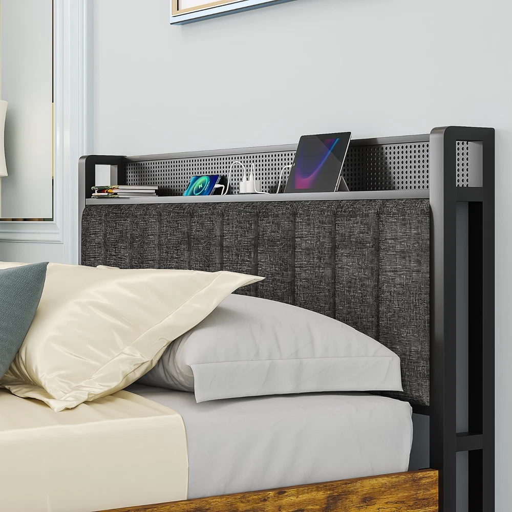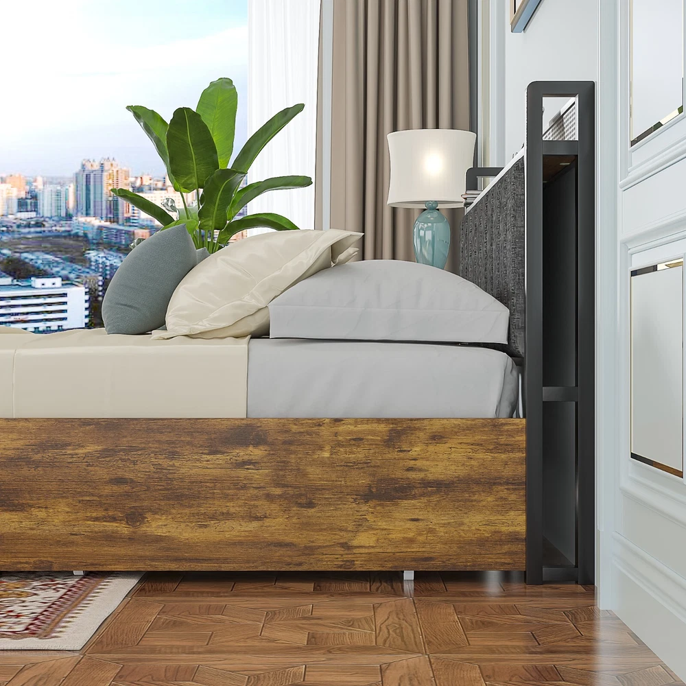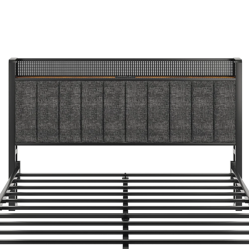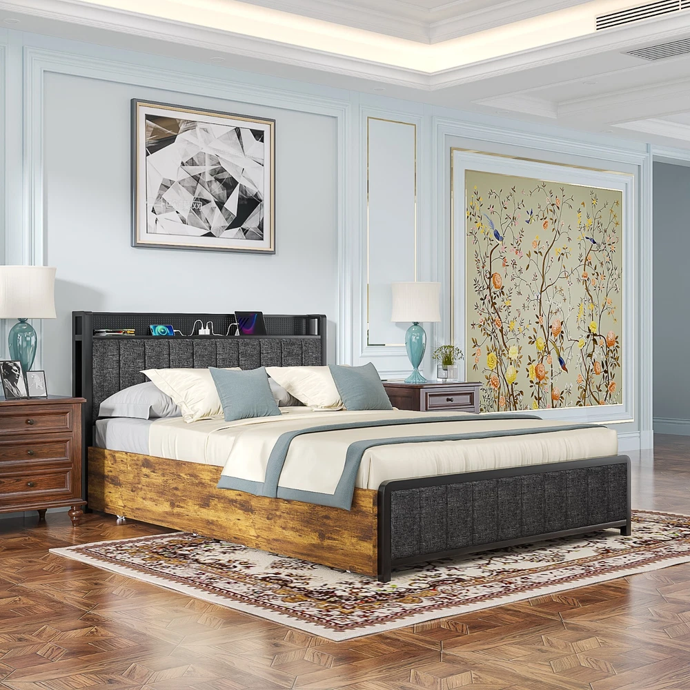 Featu res: 💡[Modern and Elegant Style] The simple and atmospheric decorative design style of the padded headboard is not only comfortable, but also brings you a warm and soft atmosphere. The elegant and classic design can be perfectly matched with various home decorations. It is a must-have for bedroom decoration. 💡 [Sturdy Structure] The metal frame and wooden slats and leg support platform can extend the life of the mattress and provide strong support for various types of mattresses. No spring box is required. 💡 [Space-saving Drawers] There are 4 steel drawers under our storage bed, providing enough storage space for your bedding, clothes, etc. With wheels, it can slide in and out quickly for easy access. 💡 [ Box Spring Free ] The metal frame and wooden strips support the platform to extend the life of the mattress, this upholstered bed frame is suitable for all kinds of mattresses, box springs, memory foam, latex or hybrid mattresses. 💡 [ Built-in Charging Station ] This platform bed frame comes with 2 standard sockets and 2 USB ports for efficient charging. Whether you are resting or reading, you can always charge your devices without moving. 💡 [ Easy to Assemble ] This bed can be quickly assembled, all parts, tools and assembly instructions are included. Just follow the pictures step by step. If you have any questions, please contact us. Specifications of Queen Size: Material: Metal Frame ; Wood Slats; MDF;Fabric Overall dimensions: 86 "L x 62"W x 4 2 "H Maximum weight capacity: 800 lb Queen weight : 92 lb Packing list: 1 x Bed Frame 1 x Installation instructions (all accessories included, no need to prepare your own tools ) Note: 1. Please allow ±1/0.5'' error due to manual measurement. 2.When viewing the color of the product on your monitor, it may differ from the actual color of the item. 3. Mattress, box spring, and bedding (comforter, sheets, pillows, etc.) are NOT included.