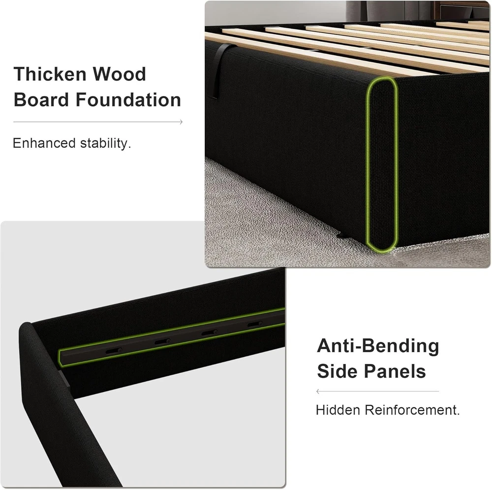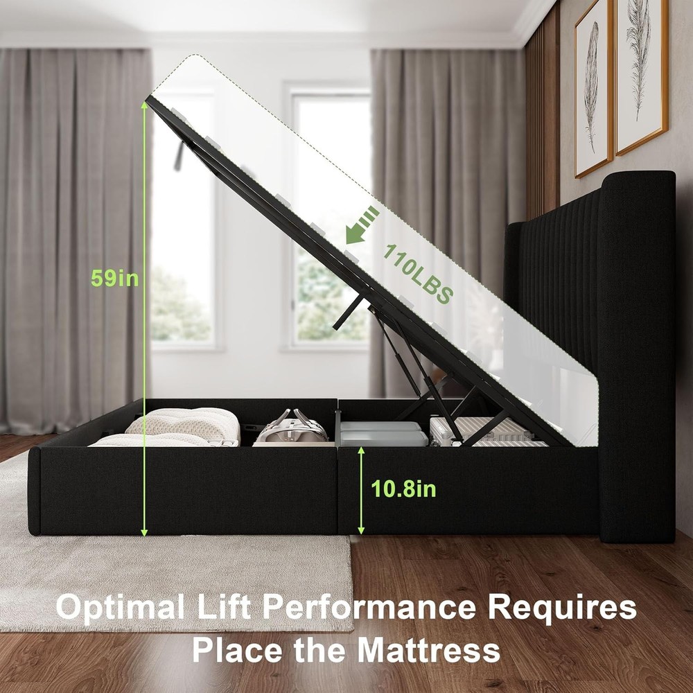 About this item Note: The hydraulic rods feature a load-bearing optimization design for effortless operation under full bed capacity. Always place the mattress on the frame after installation—operating the mechanism with an empty bed may compromise lifting functionality Adaptive Hydraulic Lift: Precision-engineered hydraulics deliver gravity-defying control—smooth lifting, adaptive resistance when empty, and effortless lowering under load Cavernous Underbed Vault: Maximizes space with a seamless under-bed compartment. Hydraulic lift system conceals bulky seasonal gear, luggage, or linens—ideal for compact living or minimalist design Tactile Linen Elegance: Breathable linen fabric with cloud-like cushioning meets ergonomic wingback headboard support. Merges sculptural wingback support and lounging luxury for timeless bedroom refinement Rock-solid Stability: 1000lbs static load capacity via reinforced construction. No box spring required; Reinforced joints and solid legs ensure silent stability for any mattress type Zero-Noise & Easy Assembly: Designed for quiet operation, eliminating the annoying noises common in traditional platform beds for truly peaceful sleep. Simplified assembly features—get set up hassle-free with no extra tools required The Queen Size Lift up Storage Bed Frame is a modern and stylish platform bed made with a dark gray linen upholstery. It features a rectangular shape with dimensions of 83.5"L x 62"W x 42.5"H, making it the perfect size for a Queen mattress. This lift-up storage bed frame comes with an assembly kit, hydraulic lift system, slats, and instructions for easy assembly. With a weight limit of 1000 pounds, this bed is designed to support adults and their belongings with its hydraulic support and noise-free operation. Made in the United States, this bed frame offers both functionality and style for a modern bedroom setting.