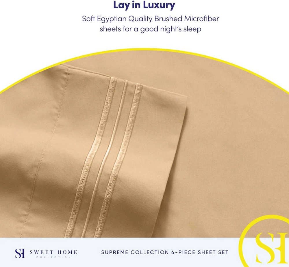 Fast Shipping Great Customer Support Satisfaction Guaranteed DESCRIPTION Shipping Shipping Shipping All domestic packages are shipped for Free (Unless other shipping method was selected during the checkout) Most items ship and arrive much sooner than the estimate delivery date. Usually within 2-3 days from payment. However, we have longer estimates to compensate for the occasional delay or supply chain breakdown. We do not accept P.O. BOXES - PLEASE PROVIDE A PHYSICAL ADDRESS Return Return Return In the event that you would like to return your purchase, we allow returns that are processed within the defined return date (the return date is to be found in the return policy/shipping and handling section) Please contact us for a return authorization and the return shipping address. Payment Payment Payment PayPal is our preferred method of payments it's the quickest, easiest and most secure way to pay for your goods or services online. PayPal offers buyer and seller protection should there be a problem. If you do not have a PayPal account, to get started and buy your first item with us is very easy. Simply click on the 'Buy It Now' button and follow the eBay checkout steps. Select PayPal as the payment method you then will be given the chance to enter your card details in to PayPal's secure checkout in order to pay for your order. Once the payment has been made, you will then be given the opportunity to make your own PayPal account to make paying for your items in the future very easy. Should there be a problem with payment please do let us know. Feedback Feedback Feedback Customer satisfaction is very important to us. If you have any problem with your order,please contact us and we will do our best to make you satisfied, please do not leave a negative feedback before we resolve your problem. We guarantee that your issue will be solved quickly. As long as you are happy with your purchase of , please leave us a positive feedback. Your feedback is very important to us it affects our search placement on eBay. We will leave a positive feedback for you in return automatically once we receive your feedback. Contact Us Contact Us Contact Us If you have any queries, please contact us via ebay. We usually respond within 24 hours on weekdays. Thank you for visiting our ebay store! ELASTIC CORNERS BUILT IN - What separates our bed sheets from the rest are the special elastic sheet straps built in. These elastic corners keep your fitted sheet secure to the bed and come on all of our sheets. LAY IN LUXURY – No more sleepless nights on uncomfortably itchy sheets! Sleep soundly on the softest 1800 Supreme Collection sheets. Be warned, though: You may never be an early bird again! SUPERB SHEET SET – Each luxurious set has 1 fitted, 1 flat sheet, and 2 pillowcases (NOTE: Twin & Twin XL sizes include 1 pillowcase). Deep pockets, thick elastic, and BUILT IN SHEET STRAPS make your new soft sheets stay in place! STAY CLEANER, LONGER – Who has time to wash their sheets every few nights? When it’s time for a wash, machine wash cold, and tumble dry low. PERFECT FIT FOR ANY BED – Sleep soundly for years to come! Your deep pocket sheets are fade, shrink, and wrinkle resistant. We’ve got you (and your bed) covered. Good rest comes cheap! Cheap sheets are usually itchy, uncomfortable, and the enemy of good sleep. Not Sweet Home Collection’s luxury sheet set, though! Our brushed microfiber 1800 Supreme Collection Sheets are cooling, comfortable, and luxurious at an affordable price! No more dreading lying down on scratchy sheets. These soft luxury bed sheets promise rest and relaxation so you get the shuteye you need to start every day fully charged. No matter what you sleep on, we have the sheets for you! Ill-fitting sheets make for an unsatisfying night’s sleep. Whatever size your mattress is, Sweet Home Collection has the perfectly fitted sheet set for you! Our sheet sets come in twin, twin XL, full, queen, king, and California king sizes to give everyone in the family a good night’s rest. Here are the measurements for the different bed sizes: Twin Sheets Queen Size Luxury Breathable Bed Sheets Set - 1800 Supreme Extra Soft Camel Click here to see description Fast Shipping Great Customer Support Satisfaction Guaranteed DESCRIPTION Shipping All domestic packages are shipped for Free (Unless other shipping method was selected during the checkout) We ship within two business days of payment, usually sooner Standard FREE shipping takes between 3-5 business days Expedited shipping takes between 2-3 business days Overnight shipping takes between 1-2 business days We do not accept P.O. BOXES - PLEASE PROVIDE A PHYSICAL ADDRESS We Ship Globally using ebay's GSP, the item is sent to a logistic center in KY and shipped from there to the rest of the world. International customers are responsible for all duties and taxes Contact your local authority for questions related to the amount of duties or taxes you will be responsible for Return In the event that you would like to return your purchase, we allow returns that are processed within the defined return date (the return date is to be found in the return policy/shipping and handling section) Please contact us for a return authorization and the return shipping address. Please contact us for a Return Merchandise Authorization (RMA) number. We advise you to use a reputable carrier service when returning your goods. Please pack all returns appropriately. We ship globally Via eBay's global shipping program (GSP). Thus we don't cover returns for items shipped globally. Buyers returning such items will be refunded ONLY for the item's cost and not for the shipping. please check the Voltage information and make sure it matches the one in your country. In case it's not stated in the description, do ask us. Payment PayPal is our preferred method of payments it's the quickest, easiest and most secure way to pay for your goods or services online. PayPal offers buyer and sel