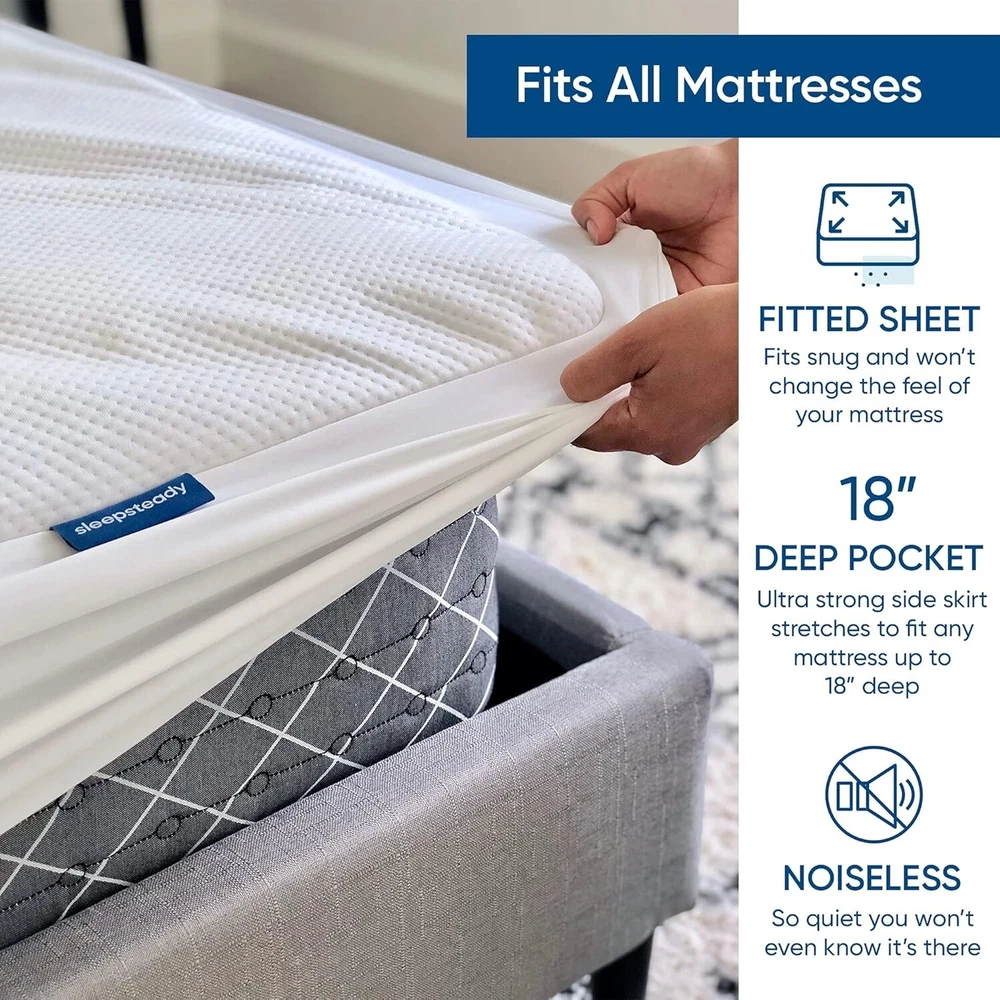 PROTECT YOUR MATTRESS INVESTMENT: Accidents happen! Don't let it ruin your mattress. Our 100% waterproof mattress protector will protect your mattress from all spills, stains & accidents. Simply throw it in the wash for an effortless cleanup. EXPERIENCE THE LUXURY OF TENCEL: Not all mattress protectors are created equal. Most are made with cheap cotton fabric. Our top layer is made up of ultra soft 100% Tencel fibres. Tencel is 10 times softer than cotton, and more breathable and cooling than other natural fabrics. HOT SLEEPERS STAY COOL: You deserve a deep, restful sleep. Luxury Tencel top layer is comfortable and cooling against your skin. Designed to wick away moisture from the body, keeping you cool and dry all night long. No more sweaty sleep, and no more tossing and turning. FOR EVERY BED IN THE HOUSE: Our protector fits snug and tight around all mattress types - without any slipping or bunching. Ultra strong side skirt is 50% thicker than competitors, guaranteed not to rip or tear, and stretches to fit any deep pocket mattress up to 18" deep.