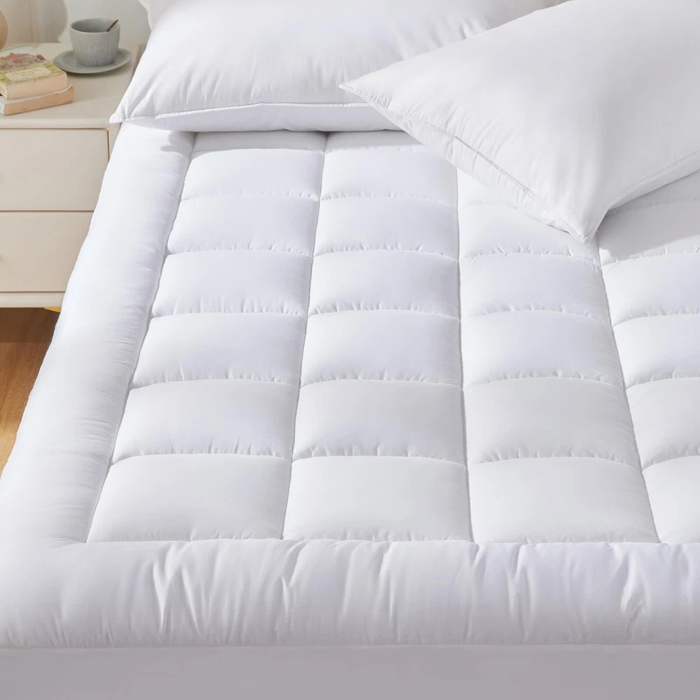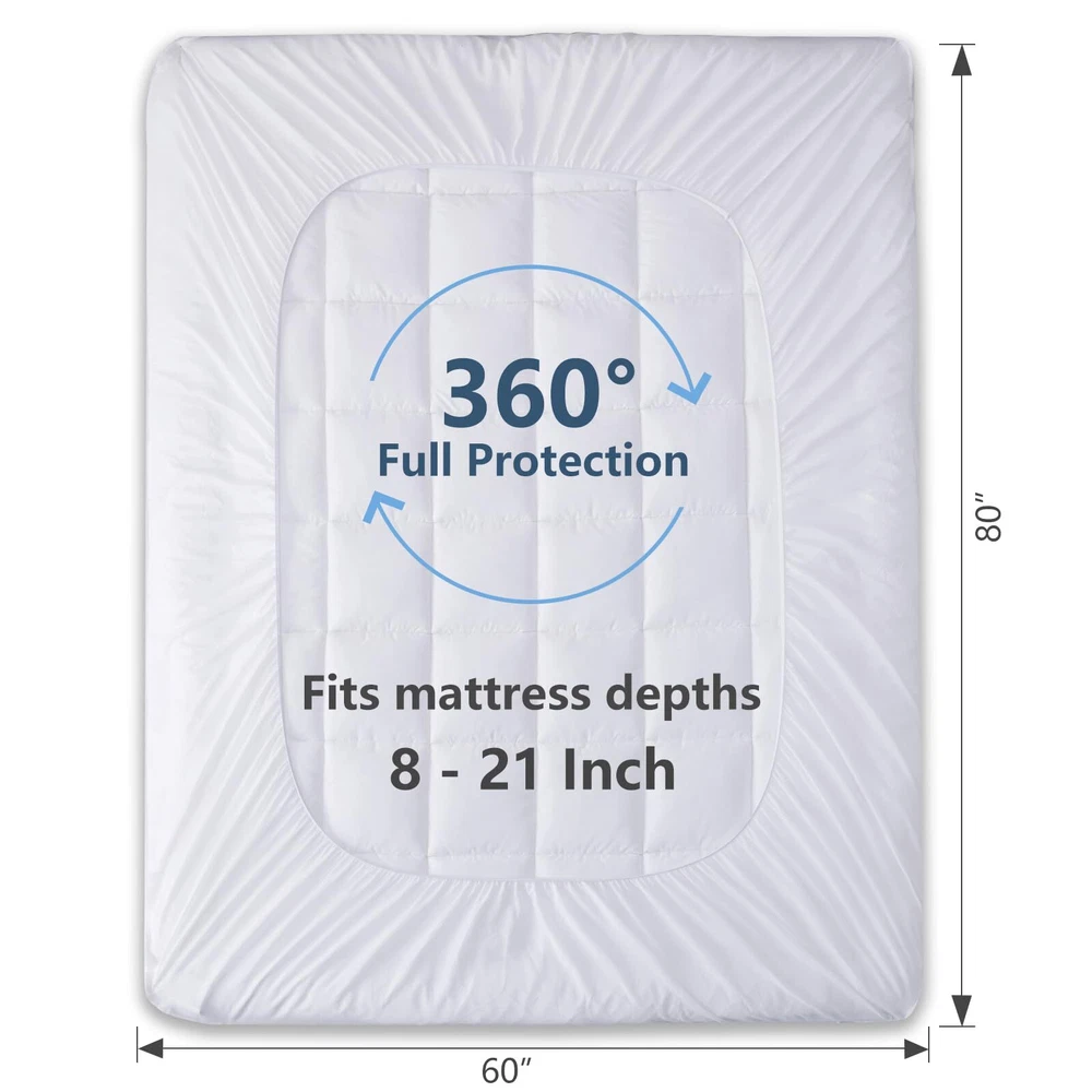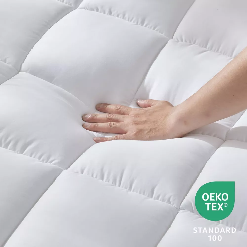 100% Cotton Top & Down Alternative Fill Soft and Breathable: The queen mattress pad has premium organic cotton fabric, breathable and sweat-absorbent. And also the quilted pad is filled with extremely soft down alternative polyester which is friendly to those sneezing with goose down and feather bedding; Moderate thickness is also suitable for side sleepers Safe & Sound: Our product has been certified according to rigorous OEKO-TEX Standard 100 requirements that mean the product satisfies the highest criterion of testing for harmful chemicals and has been found to be harmless for humans. Elaborate design: Mattress topper is equipped with a 360° elastic skirt that wraps tightly around the mattress. Elastic deep pocket stretches to fit up to 21" deep mattress, which can always stay non-slip no matter how you twist and turn in your bed. Easy Care: The mattress pad/cover are machine washable which can save you more time and energy. For year round softness and prevent pilling up, it's highly recommend to wash it in the gentle cycle with cold water, sun-dry or tumble dry in low when needed. Let our cotton mattress pads keep providing you and your family with cozy sleeping