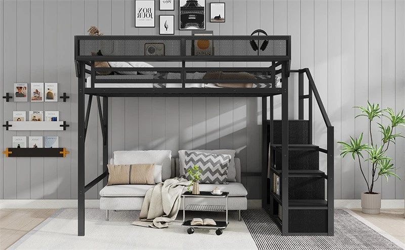 Queen Size Metal High Loft Bed w/Storage Shelves,Storage Stairs & Wardrobe,Black Features 【Queen Loft Bed with Storage Shelves for Upper】The queen metal loft bed features a storage shelf next to the upper bed, providing extra storage space. This shelf is perfect for keeping books, gadgets, or small items within easy reach. The shelf have mesh around which prevent thing falling down. It adds functionality without compromising space. Metal queen Loft Bed with Staircase】The metal queen size loft bed come with staircase includes built-in storage compartments, making it easy to store items like shoes, toys, or blankets. The steps ensure safe and convenient access to the upper bed, enhancing both practicality and safety. The stairs can be installed on either right side or left side. 【Under Space of Metal Loft Bed】54.3 inch under the queen loft bed creates extra space for multi-functional use. You can place storage cabinets, a small sofa, or a desk underneath, maximizing the use of limited space and creating a versatile living area. 【Metal Loft Bed with Wardrobe】The staircase features a built-in wardrobe function, providing additional storage for clothes and accessories. This clever design adds more functionality to the metal queen loft bed, making it a perfect solution for small bedrooms. 【Durable and Sturdy Construction】The queen size metal loft bed made from high-quality metal, this loft bed is durable and sturdy. The metal material ensures long-lasting use and stability, while also offering a sleek and modern look that fits well in any bedroom.Weight capacity is 400LBS. Descriptions Queen Size Loft Bed with Stairs, Metal Queen Loft Bed with Storage Shelves This queen size loft bed features built-in storage shelves next to the upper bed. Come with staircase and wardrobe. The sturdy metal design ensures stability and durability, making your bedtime routine more organized and efficient. Description & Dimensions Color: Black Material: Metal Overall Dimensions: 99.4” x 63.4”x 73.4” (L x W x H) Size: Queen Size Height of Upper Guardrail: 11.3" Clearance Under the Bed 54.3" Recommended Mattress Thickness 6”(not included) Weight Capacity: 400LBS Net Weight: 168.3 lbs Gross Weight 182.82 lbs Box Spring Required No Country of Origin China