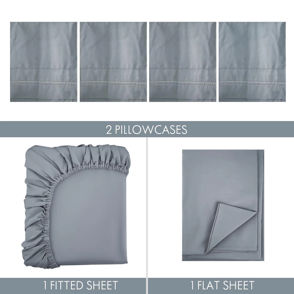 Unique Embroidery Elegance: Delight in our pillowcases' exclusive embroidery design, promising a luxury bedding journey like no other! Deep Pocket Sheet Set: Slumber in luxury with our elasticized deep-pocket fitted sheet, fitting up to 16" mattresses. Envelope pillowcases ensure style and snug fit for pillows. Ultra Soft Bed Sheets: Wrap yourself in the exquisite comfort of our microfiber sheets set that promises relentless smoothness, unwavering durability, and fade-resistant brilliance. CERTIFIED SAFETY:OEKO-TEX Standard 100 approved, ensuring bedsheets free from harmful chemicals. Cold wash, gentle cycle, no bleach or fabric softener. WHAT YOU GET: This 6-piece Queen Sheet Set includes 4 Pillowcases (20" x 30"), 1 Flat Sheet (90" x 102"), and 1 Fitted Sheet (60" x 80") with Exquisite Packaging