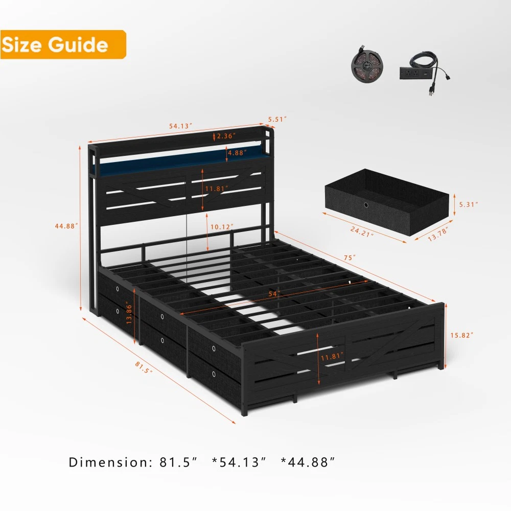 Queen Size Bed Frame with Storage Headboard - 12 Drawers, LED Lights & Charging Station, Noiseless Metal Platform, Black Elevate your bedroom with a functional and stylish queen-size bed frame that blends ample storage, modern convenience, and sturdy construction. Featuring a storage-integrated headboard, 12 fabric drawers, built-in LED lights, and a charging station, this black bed frame maximizes space efficiency while enhancing your daily routine. The noiseless, anti-slip metal platform and slat support eliminate the need for a box spring, delivering reliable comfort and durability for years to come. 🔍 Core Product Details - Color : Sleek Black (versatile finish that complements modern, minimalist, or industrial decor) - Materials : Durable MDF + Heavy-Duty Metal (sturdy frame for long-lasting stability) - Bed Size : Queen (perfect for standard queen-size mattresses) - Overall Dimensions : 86.50”L × 60.19”W × 44.88”H - Product Weight : 95.90 lbs - Package Dimensions : 62.99”L × 15.35”W × 8.27”H - Package Weight : 103.64 lbs - Key Features : 12 fabric storage drawers | Storage-integrated headboard | Built-in charging station | LED light strips | Noiseless metal platform | Anti-slip mattress support | Sturdy metal slat base | No box spring required | Easy assembly | Customization available - Customization Service : Yes, customization is supported. Please contact the seller for details. - Assembly : Required (includes detailed instructions and all necessary hardware; 1–2 adults recommended) ✨ Standout Features for Style & Functionality 🗄️ 12 Drawers + Storage Headboard - Maximize Space Efficiency Say goodbye to cluttered bedrooms with this bed frame’s abundant storage solutions. The 12 fabric drawers are designed for classified storage of lightweight daily items (like socks, underwear, or accessories) and bedding essentials (such as sheets, pillowcases, or blankets). The integrated bedside storage headboard provides convenient stowage for books, phones, or nighttime essentials—all within arm’s reach. This thoughtful design maximizes space efficiency, making it ideal for small bedrooms, apartments, or anyone seeking a tidy living environment. 🔌 Built-In Charging Station & LED Lights - Modern Convenience Stay connected and safe with the integrated charging station, which eliminates the need for messy extension cords or power banks in bed—reducing tripping hazards. The built-in LED light strips offer soft auxiliary lighting, perfect for nighttime activities like reading, watching movies, or navigating the room without bright overhead lights. The gentle glow creates a cozy ambiance while enhancing convenience, making your bedtime routine more enjoyable. 🔇 Noiseless & Anti-Slip Metal Platform - Stable Comfort Crafted with a heavy-duty metal platform and sturdy metal slat support, this bed frame delivers exceptional stability with zero noise during use. The anti-slip design keeps your mattress securely in place, preventing shifting or sliding. No box spring is required—simply place your queen-size mattress directly on the metal slats (mattress not included), saving you extra cost and ensuring even weight distribution for comfortable sleep. 💪 Sturdy Construction - Long-Lasting Durability Combining durable MDF and heavy-duty metal, the bed frame is built to withstand daily use for years to come. The robust frame resists wobbling or sagging, even with regular use, and the high-quality fabric drawers are tear-resistant and easy to slide in and out. This bed frame balances strength and style, making it a reliable addition to any bedroom. 🔧 Easy & Quick Assembly Assembly is a breeze with detailed instructions and all necessary hardware included. Most users can complete setup in 2–3 hours with basic tools, and 1–2 adults are recommended for lifting and positioning heavy components. The clear labeling of parts ensures a smooth assembly process, so you can enjoy your new bed frame in no time. 🏡 Perfect for Every Bedroom This queen-size bed frame shines in: - Master Bedrooms : Offers ample storage and modern convenience for a luxurious nightly routine. - Guest Bedrooms : Keeps bedding and guest essentials organized, ensuring a comfortable stay for visitors. - Small Bedrooms/Apartments : Maximizes space with integrated storage, eliminating the need for extra dressers or storage boxes. - Teen Bedrooms : Provides classified storage for personal items and modern features (charging station, LED lights) that suit teen lifestyles. 🛠️ Assembly & Care Guidelines Assembly Tips 1. Lay out all parts and hardware according to the instruction manual to confirm nothing is missing. 2. Assemble the frame first, ensuring all metal connections are tightened securely. 3. Attach the storage headboard and install the fabric drawers. 4. Mount the LED light strips and charging station (follow wiring instructions carefully). 5. Place your mattress on the metal slats and adjust as needed. Care Instructions - Wipe the MDF and metal frame with a soft, damp cloth to remove dust and debris—avoid harsh chemicals that may damage the black finish. - Clean the fabric drawers with a lint roller or vacuum to remove dust; spot-clean with mild detergent for stains. - Tighten hardware periodically (especially after the first few months of use) to maintain stability and prevent noise. - Keep the charging station and LED light strips dry to avoid electrical hazards; avoid spilling liquids near these components. 🛡️ Risk-Free Purchase Guarantee We stand behind the quality and functionality of this queen-size bed frame with: - 1-Year Warranty : Covers manufacturing defects in MDF panels, metal frame, metal slats, fabric drawers, LED light strips, and charging station (does not cover damage from improper assembly, misuse, or accidental impacts). - 30-Day Free Return & Exchange : If you’re not 100% satisfied with your purchase, return the bed frame for a full refund or replaceme