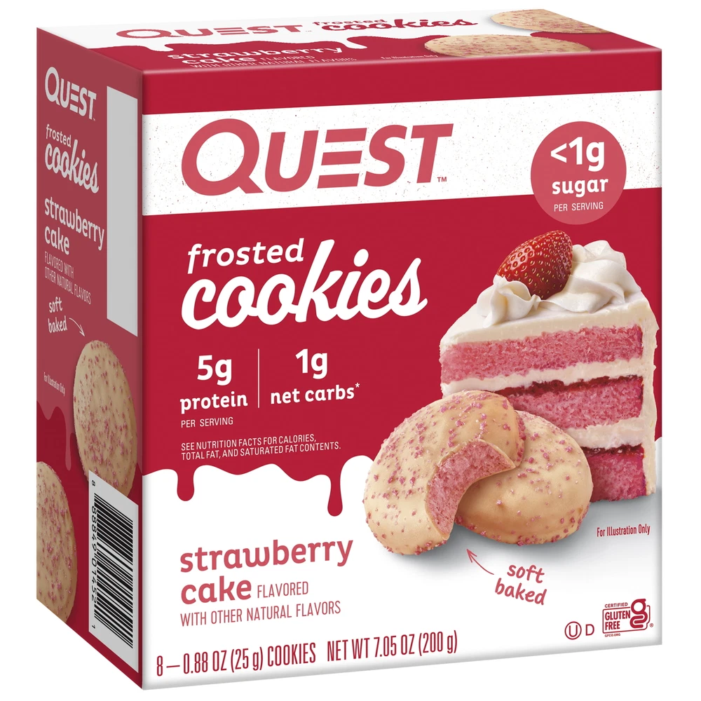 Quest Strawberry Cake Frosted Cookies feature a sweet coating around a soft-baked fruit flavored center. Quest Frosted Cookies provide the sweet satisfaction of a sugary bakery cookie with less than 1g of sugar, 5g of protein, and 1g of net carbs per serving*. Sounds too good to be true? Taste them Quest frosted cookies for yourself! Perfect for an on the go dessert treat, shareable celebration, or anytime the cravings hit for a soft and chewy frosted strawberry cookie. FROSTED COOKIES. Enjoy the berry yummy flavor of Strawberry Cake in this soft baked, fruit flavored cookie enrobed in a sweet frosted coating with less than 1g of sugar, 5g of protein, and 1g of net carbs per serving*. ON A QUEST. Our soft & chewy frosted cookies are just the right amount of sweet to keep you satisfied when it’s snack time, making them a great low sugar*, low carb* protein snack. ON THE MOVE. Enjoy a sweet & satisfying cookie that fits right into your busy schedule. Hint: This protein cookie makes for an enjoyable afternoon snack or late night low carb* snack! QUALITY INGREDIENTS: Delight in the satisfying flavors and nutrients of Quest Frosted Cookies made with quality ingredients. SERVING SIZE: Offered in 8ct cartons containing individually wrapped 0.88oz cookies. ALL TASTE. NO COMPROMISE. Give your body the nutrients it needs without sacrificing your favorite flavors. Our cookies have all the sweetness you want in a snack without compromise.*See Nutrition Facts for Calories, Total Fat and Saturated Fat Contents. Total Carbohydrates, 1g Net Carbs per serving. (Net carbs = Total Carbs - Dietary Fiber - Sugar Alcohols)