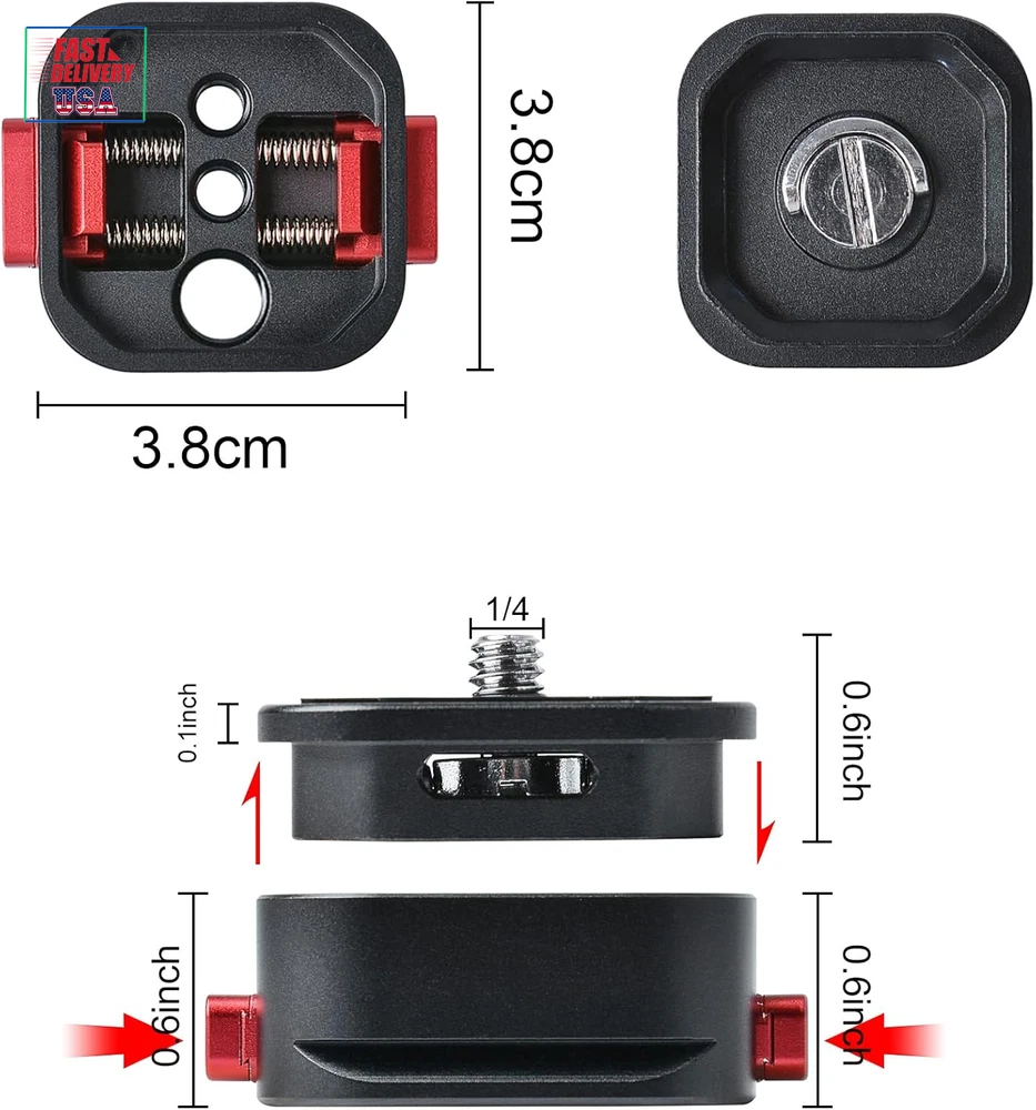 Store New Arrivals Add to Favorite View Feedback Contact Quick Release Plate, Camera Tripod Mount Arca Swiss QR Plate Fast Claw Clamp Compatible with Canon Sony Nikon Pentax Dslr/Slr/Zhiyun/Feiyu/Dji/Moza Stabilizer, Tripod Slider Gimbal Description Color Red Product Dimensions 0.98"D x 1.5"W x 0.98"H Country of Origin China Compatible Devices Cellphone, Camera Maximum Weight Recommendation 110 Pounds Item Weight 1.41 ounces 1 Press to set your camera free, super fast to change your camera/smartphone/action camera between different mounts. A quickness plate to improve the efficiency of photo taking and video recording Solid Quick Release Camera Mount built with sturdy aluminum mechanism, durable for years. It’s small but can support up to 110lbs. The quick release set combines a plate and a receiver. The top plate features 1/4 thread for universal camera, and the receiver features of acra swiss dovetail grooves and both 1/4 and 3/8 screw sockets to provide a variety of tripod, bracket, gimbal, camera rig mounting options. Safe and Security, it locks automatically when you press the plate onto the receiver, and the plate top anti-slip pad will prevent your camera slippage or rotation. Warranty: we offer 12 months warranty for this QR set. Please feel free to email us if any questions. Why you should try this Quick Release Plate System? -It has high expandability, compatible with almost all kinds of camera, smartphones, instant camera, sports camera, video camera…..and all mounts like tripod, monopod, gimbal, camera rig.. -Quick Disassembly, plate clamp in, locked, and press the two red buttons will unlock. -Anti-slip pad, protect your camera from scratch and slip. -Compact, ultra lightweight weighs only about 0.13lbs, size: 45x38*25mm, but can support up to 110lbs. -Arca Swiss dovetail grooves for fast mount the receiver to Acra Swiss tripod. Specifications: Size: 45x38x25mm Weight: 0.13lbs Material: Aluminum Top Screw:1/4” Bottom Screw: 6 x 1/4 screw threads and 1 x 3/8 screw threads Package: 1 x Quick Release Camera Mount ABOUT US We offer the best prices around on high quality products. Our E-store includes media such as books, movies, music and games while offering electronics, toys, sporting apparel, clothing, tools, general home, garden items and more. SHIPPING We are always working hard to ensure your package arrives as soon as possible. Please understand that some factors like weather, high postal traffic, and the performance of shipping companies are outside of our control. We offer free shipping to the lower 48 states and ship within 2 business days of payment, usually sooner. We do not accept P.O. Boxes. Please provide a physical address. For shipping outside of the continental USA, we only use eBay's Global Shipping Program.The item is shipped to KY and then sent to the rest of the world. International customers are responsible for all duties and taxes. Continue to check out in order to calculate costs for shipping the item to your country. Messages regarding eBay's Global Shipping Program MUST be directed at eBay EXCLUSIVELY. RETURNS We offer a 30-Day Return Policy on items which you are not completely satisfied with. You have the option for a full-refund or an exchange of the item. No returns are available on items shipped outside of the USA. PAYMENT We accept PayPal. CONTACT US This page content is yet to come Please ad us to your favorite seller and visit again later Thank You CUSTOMER SATISFACTION We try our very best to make sure every customer is completely satisfied. If there's a problem, message us! We're happy to help. WE ACCEPT Copyright © 2021 AutoDS. | All Rights Reserved