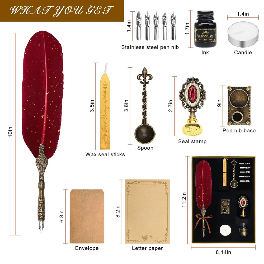 What You Get : Feather calligraphy pen set included 1 wax seal stamp, 1 ink, 1 wax seal stick, 5 different size nibs, 1 spoon, 1 envelope, and 1 letter paper, 1 white wax, all-in-feather quill set is the best gift for friends and family Choicest Quality : Quill pen made of natural feathers and brass, beautiful and durable, weighs 0.05 lbs, and its stability and smoothness provide you with a wonderful writing experience 5 Nibs : Feather pen and ink set has 5 different size nibs made from premium metal, you can replace the nibs as your writing needs. don’t forget! there are an envelope and letter paper for a gift in the vintage ink pen package Privacy Wax Stamp : Wax seal stamp of harry potter quill and ink set exquisitely carved from metal, vintage crown jewel style, beautiful and premium, the envelope is sealed with wax for privacy, which can protect your envelope from being opened Perfect Gift : Calligraphy pens quill package size is 8 X 11in, exquisite packaging and high-end quality make it of the most popular gifts at the moment, especially for children and friends' birthdays