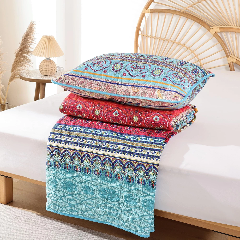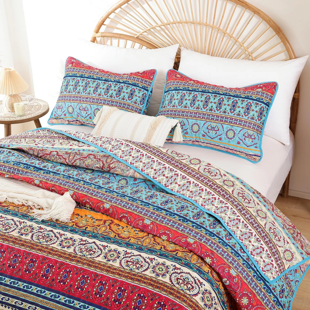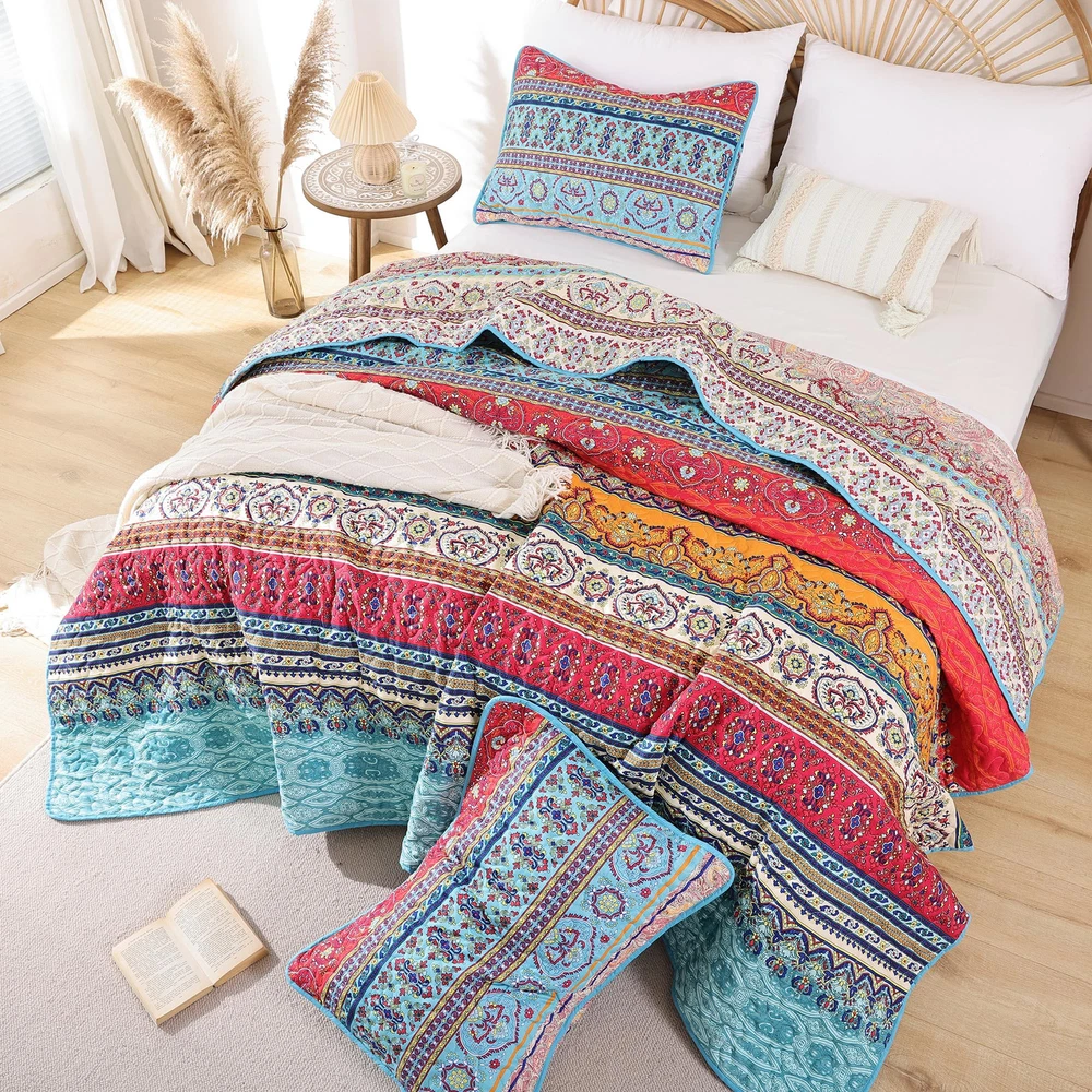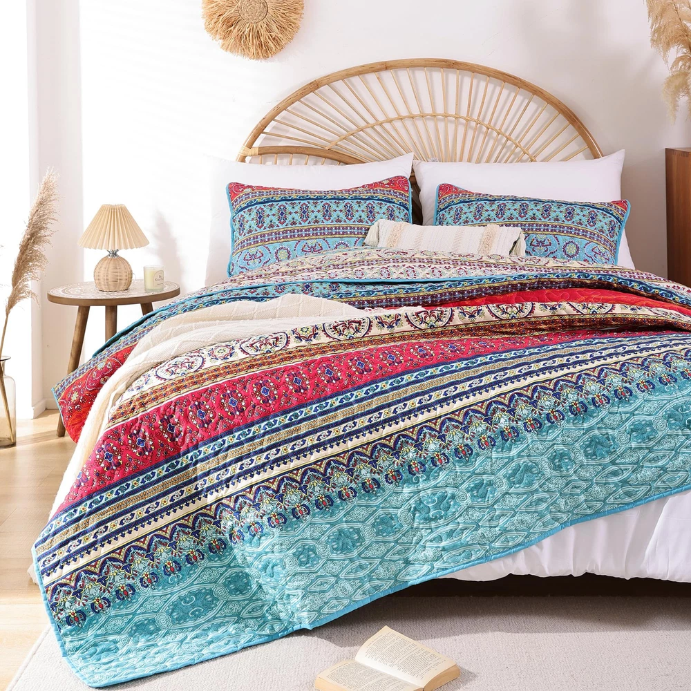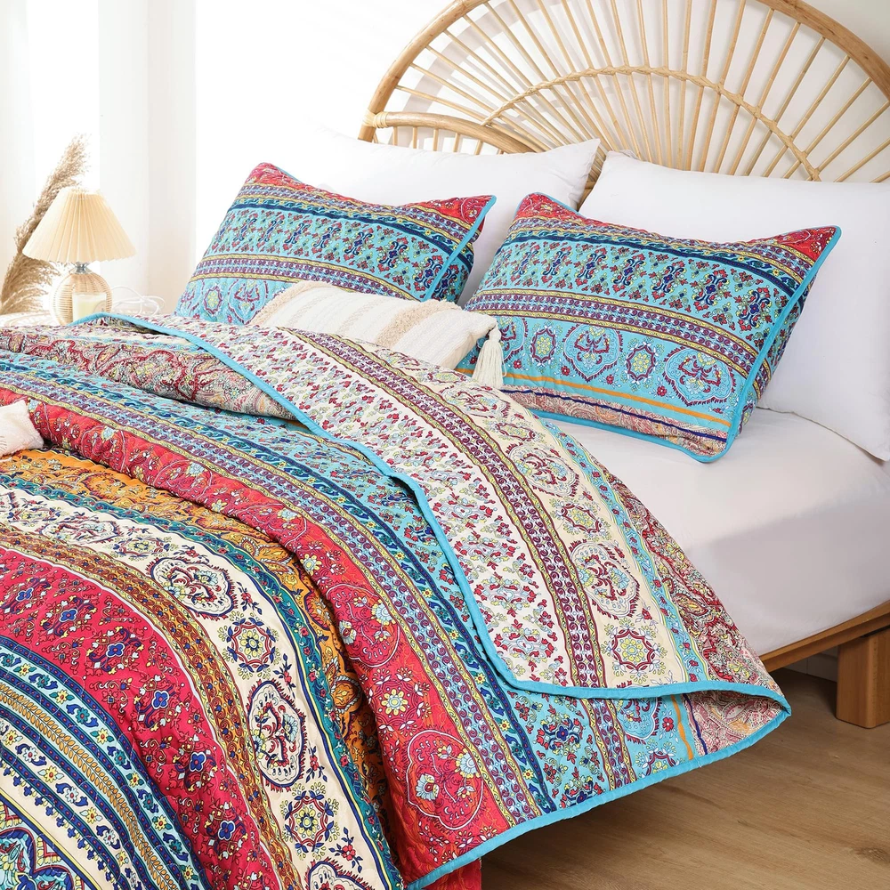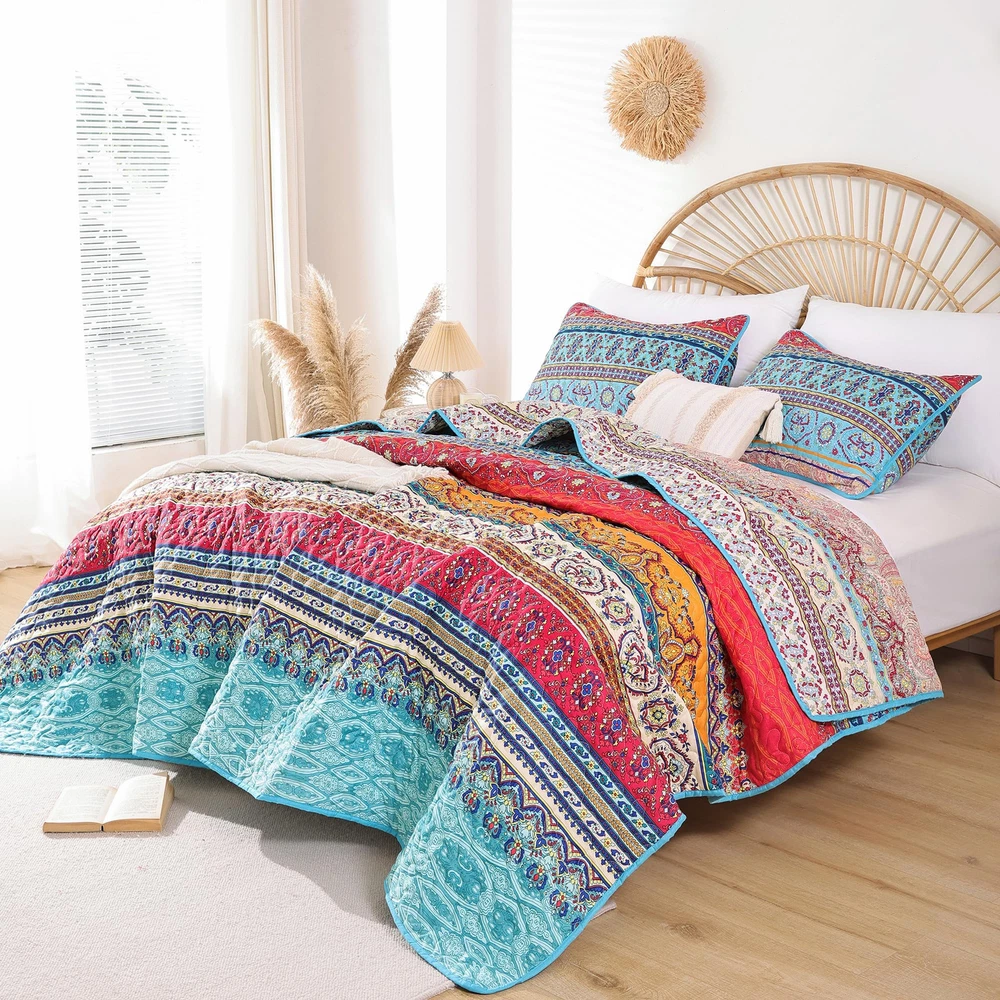 BOHO QUILT SET : This summer bedding include:1*Quilt (90" x 90"inches) and 2*Pillow Cases (26" x 20"inches). Made of Microfiber Polyester. Soft, lightweight and durable. High quality material has the features of non-fading, anti - pilling and stains resistant for increasing using longevity.(Notice: Pillow cases is randomly tailored from the whole fabric to match the duvet cover, maybe not totally same as the pictures.Please kindly understand pillow cases design are different.) SOFT WARM & COMFORTABLE DESIGN: Boho quilt set is reversible, both sides could be used individually. Cozy and breathable to keep you extremely comfortable all night long. Durable bed cover provide warmth and softness for you and your family. Beautiful versatile quilt creats a comfortable sleeping environment for good night rest. BOHO STYLE: The queen quilt bedding set is designed with multiple elements and vibrant colors, creating a lively atmosphere for your bedroom or guest room. Ideal for birthdays, wedding, holidays, Christmas and more. Durable bedspread sets are perfect for family with pets or . MULTI-PURPOSE ALL SEASON USAGE: This quilt designed for all season. Perfect thickness coverlet quilt for summer. As well as a blanket for winter, enough filling to keep warm. Use it as quilt,bedspread, blanket or bed cover. EASY CARE: Machine wash cold, gentle cycle, tumble dry low. Tightly stitching on the edging of quilt set will hold up well through repeatly washing.