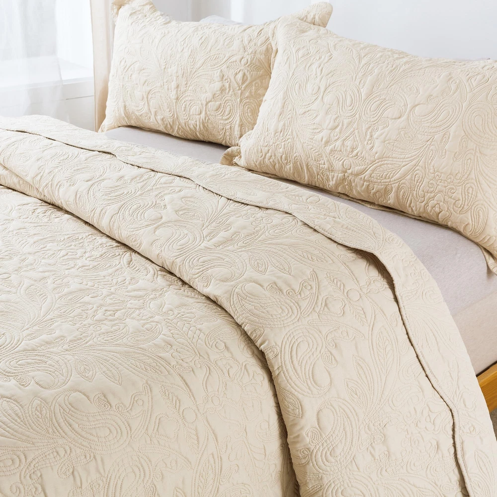 🌲🌲Aesthetic & Functional🌲🌲Rustic Quilt Sets have the following advantages,Classical Paisley Pattern Desigh,Embroidered bedspread sets sewed with neat stitches, Pair with delicate and lovely fan edge, enhance your bedroom neatly and attractively 🌲🌲Premium Material Quality🌲🌲Quilt Sets utilize 100% brushed microfiber as outer fabric,and Polyester/ Cotton Fabric as filler.Microfiber quilt will never bunch as time went - long lasting softness, fade & stain resistance better than cotton 🌲🌲Multipurpose & Lightweight🌲🌲Lightweight Quilt Set is good idea for a summer quilt, a nice underneath for spring & fall and winter,soft and romantic color & pattern,not only practical but also aesthetic 🌲🌲Care Instructions🌲🌲We Prewash Every Quilt to pursuing Softness.Microfiber Quilt is Machine washable, reduced your chores time.Wash separately in cold water, gentle cycle, tumble dry on low or dry naturally, do not bleach 🌲🌲Packaging & Dimensions🌲🌲King Quilt Bedding Set packaging include: 1 x King Quilt (106x96 inch) & 2 x Pillow Cases (20x36 inch)
