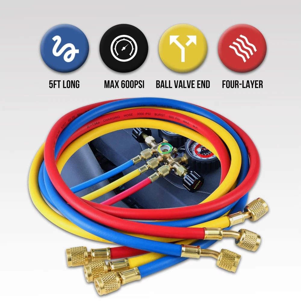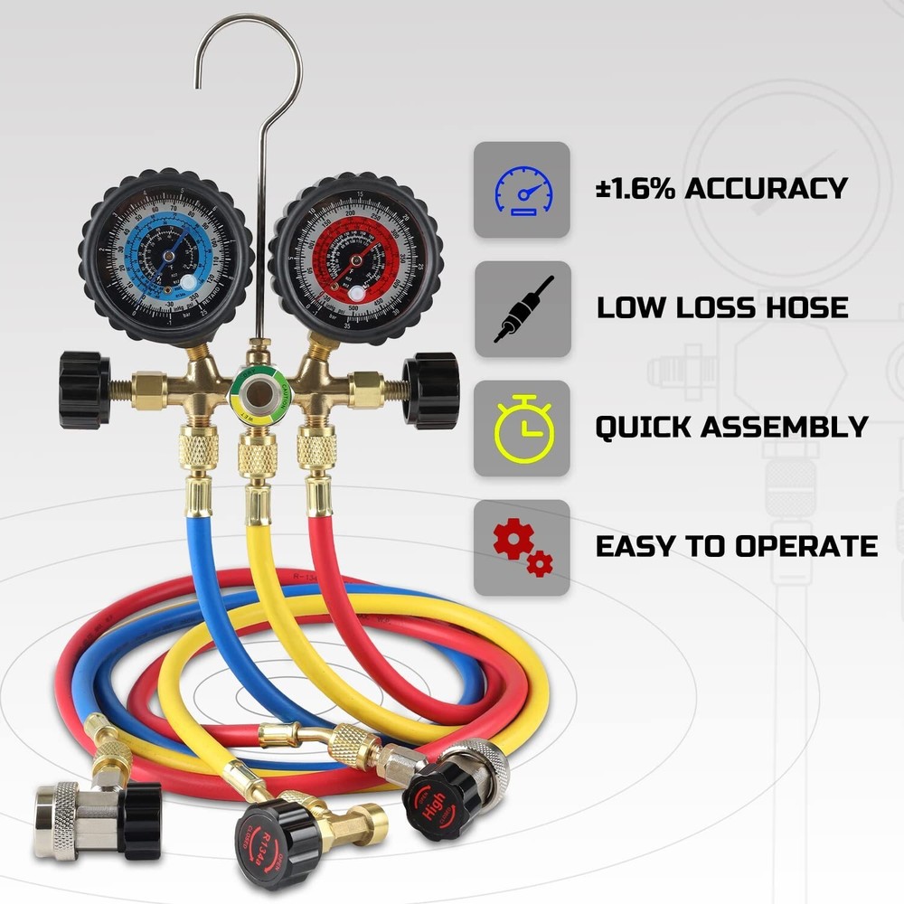 AC R134a R22 R12 R502 A/C Diagnostic Manifold Gauge Set with 5FT Hose, Couplers Puncture and Self Sealing Can Tap, Classic MULTIFUNCTIONAL AIR CONDITIONER GAUGE KIT: Professional 3 way automotive air conditioning diagnostic manifold gauge set will compatible with R134A R12 R22 R502 refrigerants, perfect for AC freon charging, evacuation, diagnostic check and recovery work CLEAR DIALS: Extra large and colored dials with fahrenheit degree unit is easy to read, gauge rated 500 psi (red) and 350 psi (blue) max pressure. Sight glass design will help you see the flowing liquid refrigerant, when charging the refrigerant HIGH QUALITY HOSE: Include 4 pieces extra long 5 FT and high impact hose, thickening hose body with precise valve core depressor and 45 degree bend on one end for convenient access. Hose rated 600 psi max max working pressure and 3000 psi burst pressure COMPACT ACCESSORIES: Precise movement with upgraded gauge shell, stands up to heavy use and accidental drops, all metal parts made from durable brass and aluminum materials. Great for your home garage or mechanic shop PRODUCT INCLUDES: 3 way gauge, 3 pcs hoses, 2 pcs Adjustable R134A Adapters, 2 pcs puncture and self sealing can taps, acme adapter, valve core remover, gloves