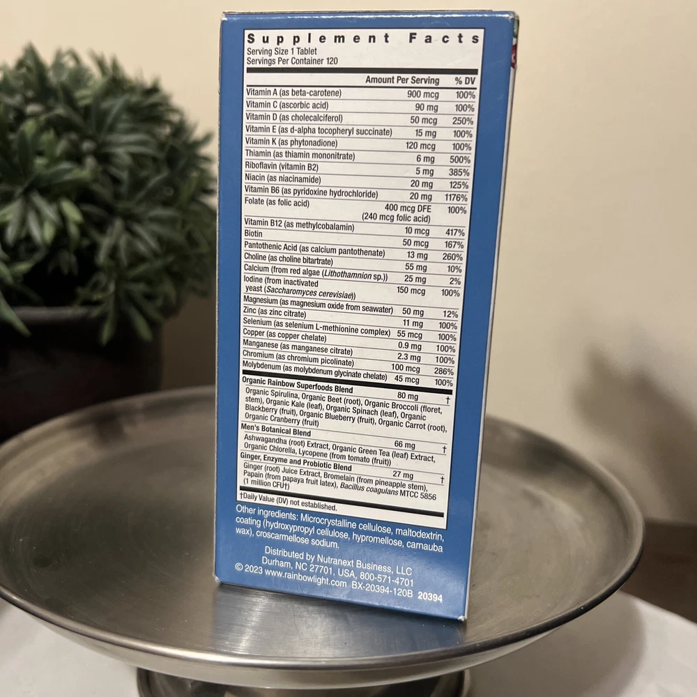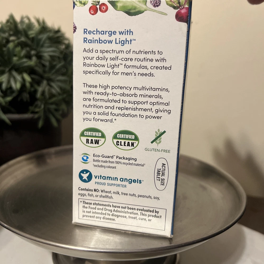 Number of Pills:60 EachBrand:Rainbow LightMain Purpose:Men's HealthMPN:N/AExpiration Date:5/26Type:Vitamingtin13:021888217137Department:MenIngredients:MultivitaminFormulation:TabletDosage:1 tablet per dayFlavor:NeutralUPC:021888217137