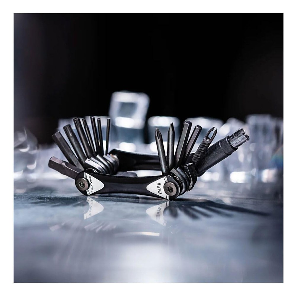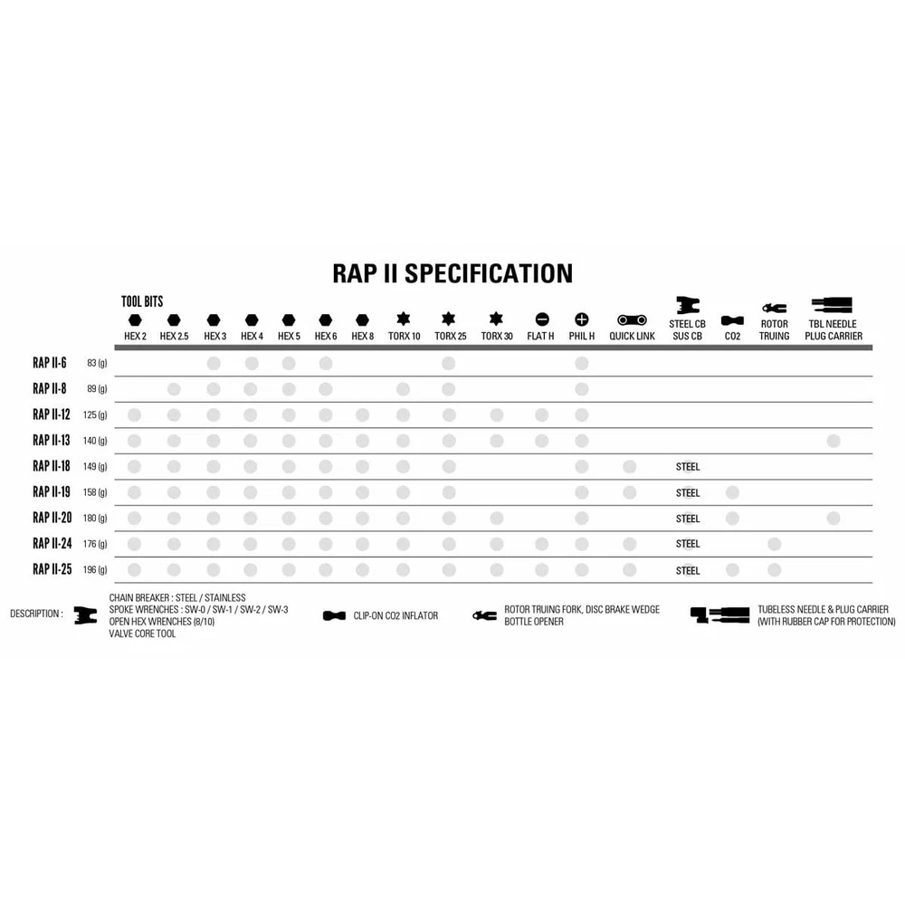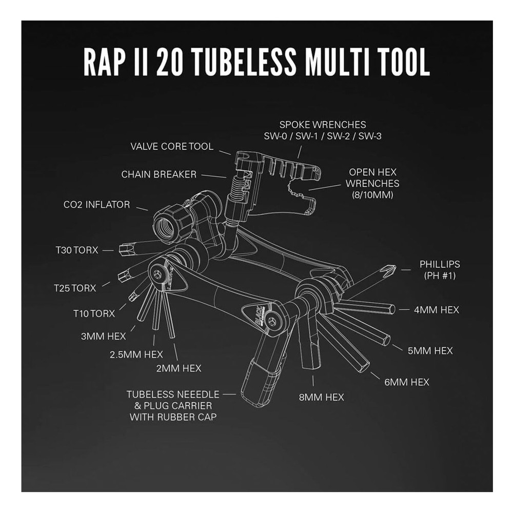 Combining undeniable style with precision engineering, the RAP II series of cycling multi-tools provide unmatched performance. Designed, engineered, and manufactured in-house, each and every RAP II tool is brimming with innovative features—from lightweight, ergonomic machined-aluminum side plates with integrated magnetic quick-link holders to longer hardened steel tool bits for easier access to hard-to-reach-bolts. The steel tool bits are made with our Black Anti-Corrosion Technology for increased corrosion resistance. Compact and versatile, these multi-tools are built to last and designed to efficiently get riders back on the road or trail RAP II 20 Tubeless: Hex 2/2.5/3/4/5/6/8mm, Torx T10/T25/T30, Cross-head, Chain Breaker, 8/10MM Wrench, 4 Spoke Black Anti-Corrosion technology, which provides superior corrosion resistance. Compact and versatile, these mini tools are built to last and designed to efficiently get riders back on the road or trail. The ergonomic side-plates are machined from lightweight aluminum, anodized black and offer a custom magnetic holder for an emergency quick-link. Combining style, technology, and ultimate value, the Rap II series bike multi-tools provide unmatched performance at their price points. Engineered and manufactured in-house, these multi-tools feature several innovative features.Includes Silicone Tool Retention Strap. Tubeless Tire Plug Kit includes Reamer/Plug Installation tool and 2 Tubeless Plugs