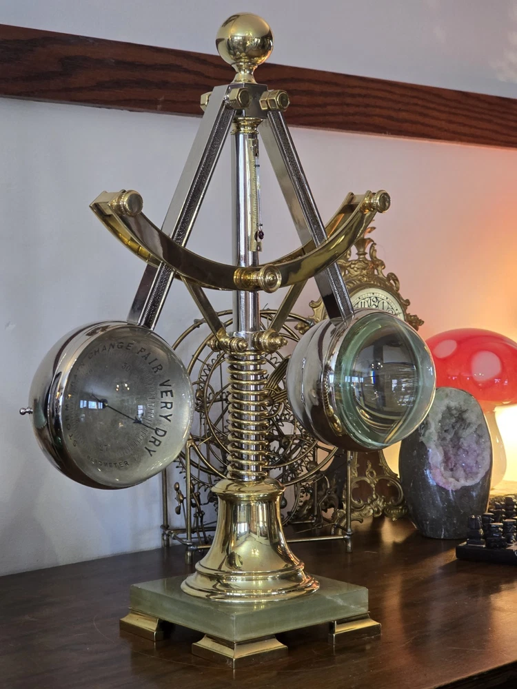 Antique French Industrial Clock – Late Victorian Era – Professionally Restored This lot features a rare late Victorian-era industrial clock, crafted in France with exceptional quality. The clock’s functional governor balls move up and down, controlled by a central spring retainer. The large glass globes over each dial magnify the silvered faces, enhancing its striking visual appeal. The case has undergone a full professional restoration. The brass has been carefully polished and waxed, while the nickel plating was expertly redone by a piano restoration specialist to ensure authentic, period-correct craftsmanship. The original dents and dings were intentionally preserved to maintain the clock’s historical integrity. The movement is an 8-day, time-only, lever-action mechanism. However, the barometer movement is missing, and while we have attempted to source a period-appropriate replacement, we have not yet found one. There are some chips to the edges of the glass, but they do not detract from the overall presentation. A rare and exceptional find, especially in this condition. Condition & Sale Terms: This clock is being sold for decorative purposes only. Mechanical functionality is not guaranteed, and it is sold As-Is, with no warranties or guarantees. Clock Measurements: "L x "W x "T Feel free to reach out with any questions before purchasing INTERNATIONAL SHIPPING NOTE: eBay requires signature confirmation on all purchases over $750, unfortunately due to USPS regulations signature cannot be done on international orders. Any international buyers will need to confirm in writing there approval to send without signature confirmation via ebay messages