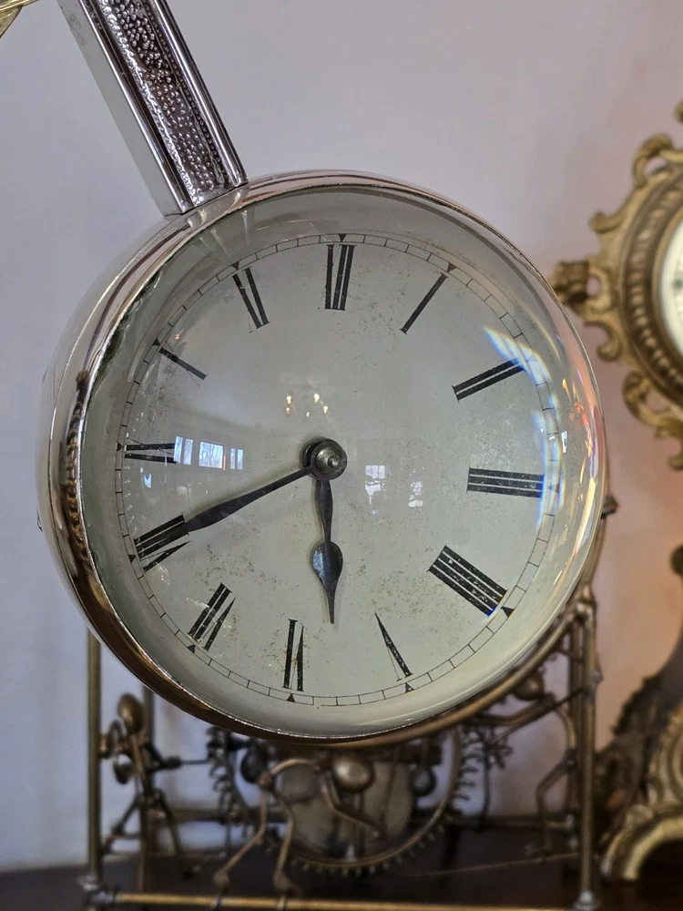 Antique French Industrial Clock – Late Victorian Era – Professionally Restored This lot features a rare late Victorian-era industrial clock, crafted in France with exceptional quality. The clock’s functional governor balls move up and down, controlled by a central spring retainer. The large glass globes over each dial magnify the silvered faces, enhancing its striking visual appeal. The case has undergone a full professional restoration. The brass has been carefully polished and waxed, while the nickel plating was expertly redone by a piano restoration specialist to ensure authentic, period-correct craftsmanship. The original dents and dings were intentionally preserved to maintain the clock’s historical integrity. The movement is an 8-day, time-only, lever-action mechanism. However, the barometer movement is missing, and while we have attempted to source a period-appropriate replacement, we have not yet found one. There are some chips to the edges of the glass, but they do not detract from the overall presentation. A rare and exceptional find, especially in this condition. Condition & Sale Terms: This clock is being sold for decorative purposes only. Mechanical functionality is not guaranteed, and it is sold As-Is, with no warranties or guarantees. Clock Measurements: "L x "W x "T Feel free to reach out with any questions before purchasing INTERNATIONAL SHIPPING NOTE: eBay requires signature confirmation on all purchases over $750, unfortunately due to USPS regulations signature cannot be done on international orders. Any international buyers will need to confirm in writing there approval to send without signature confirmation via ebay messages