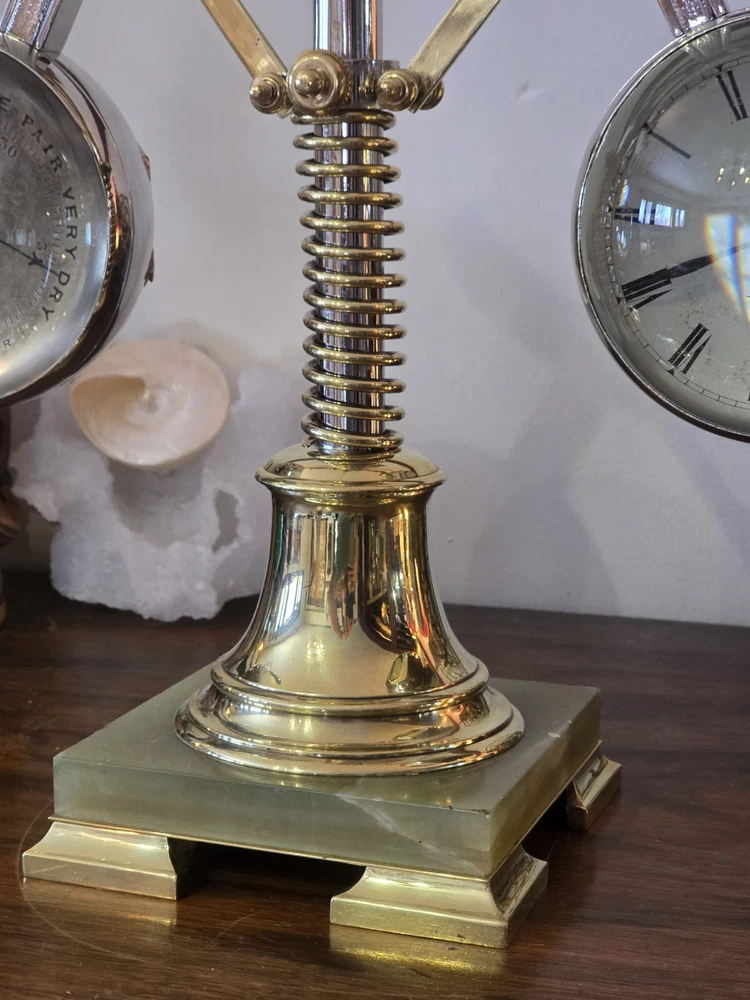 Antique French Industrial Clock – Late Victorian Era – Professionally Restored This lot features a rare late Victorian-era industrial clock, crafted in France with exceptional quality. The clock’s functional governor balls move up and down, controlled by a central spring retainer. The large glass globes over each dial magnify the silvered faces, enhancing its striking visual appeal. The case has undergone a full professional restoration. The brass has been carefully polished and waxed, while the nickel plating was expertly redone by a piano restoration specialist to ensure authentic, period-correct craftsmanship. The original dents and dings were intentionally preserved to maintain the clock’s historical integrity. The movement is an 8-day, time-only, lever-action mechanism. However, the barometer movement is missing, and while we have attempted to source a period-appropriate replacement, we have not yet found one. There are some chips to the edges of the glass, but they do not detract from the overall presentation. A rare and exceptional find, especially in this condition. Condition & Sale Terms: This clock is being sold for decorative purposes only. Mechanical functionality is not guaranteed, and it is sold As-Is, with no warranties or guarantees. Clock Measurements: "L x "W x "T Feel free to reach out with any questions before purchasing INTERNATIONAL SHIPPING NOTE: eBay requires signature confirmation on all purchases over $750, unfortunately due to USPS regulations signature cannot be done on international orders. Any international buyers will need to confirm in writing there approval to send without signature confirmation via ebay messages