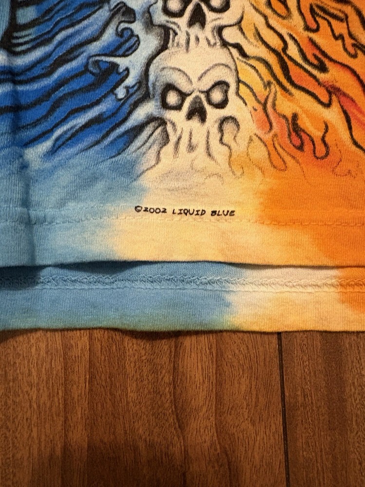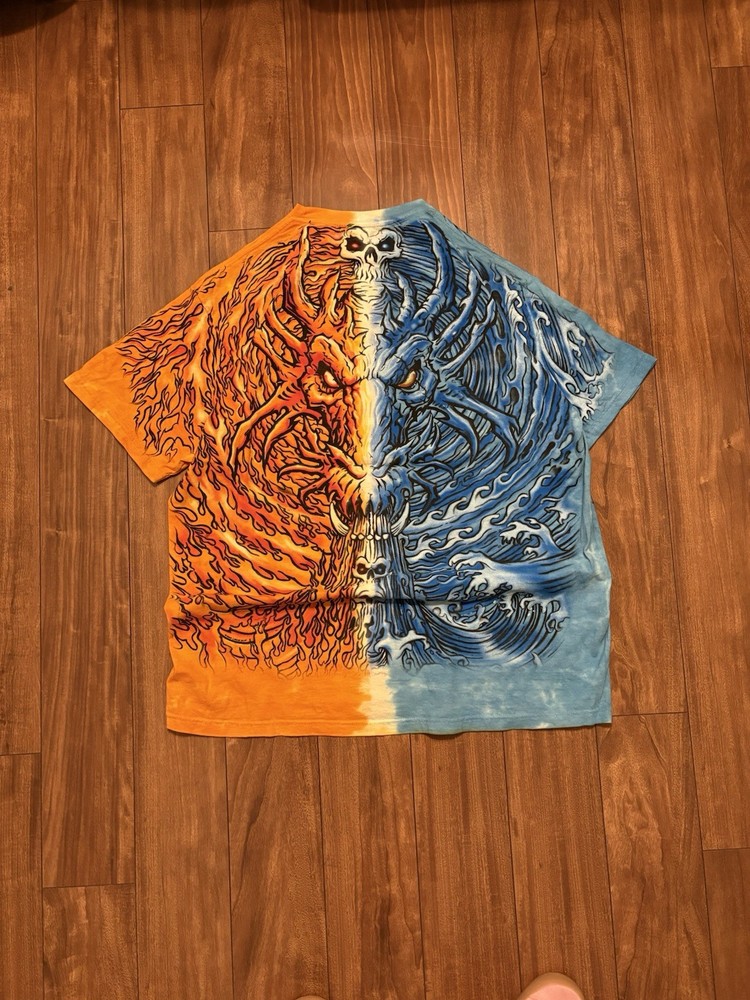 Insane vintage Liquid Blue all-over print featuring the iconic split Fire vs. Ice dragon design with skull details. Vibrant colors on both sides. Classic late-90s / early-2000s Liquid Blue style. Size: • Tagged XL Condition: Great vintage condition overall. No major flaws seen. Normal light wear from age but colors remain super vibrant. (If there’s anything specific you want added like tiny marks, let me know.) Details: • Authentic Liquid Blue tag • Made in Mexico • Full AOP double-sided graphic • Fire & Ice dragon / skull artwork • Collectible LB piece Perfect for collectors, metal/grunge fans, or anyone who loves bold Liquid Blue prints.