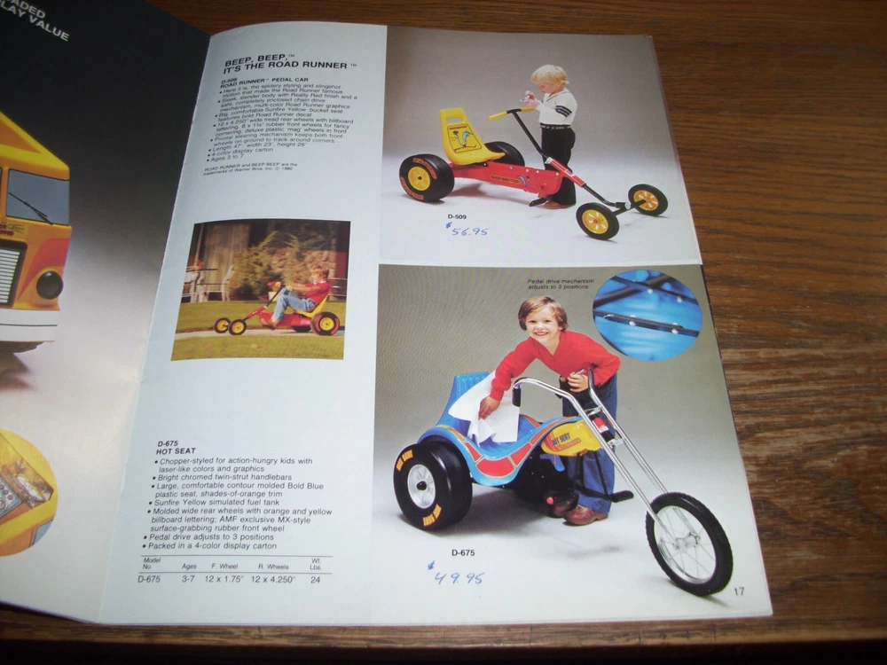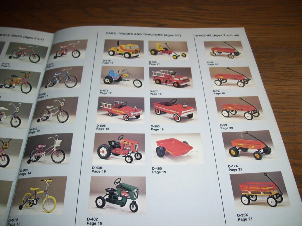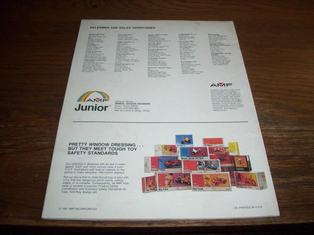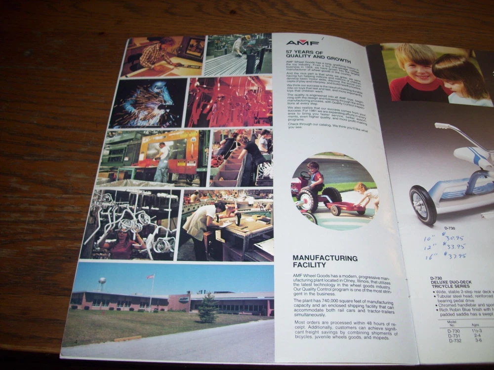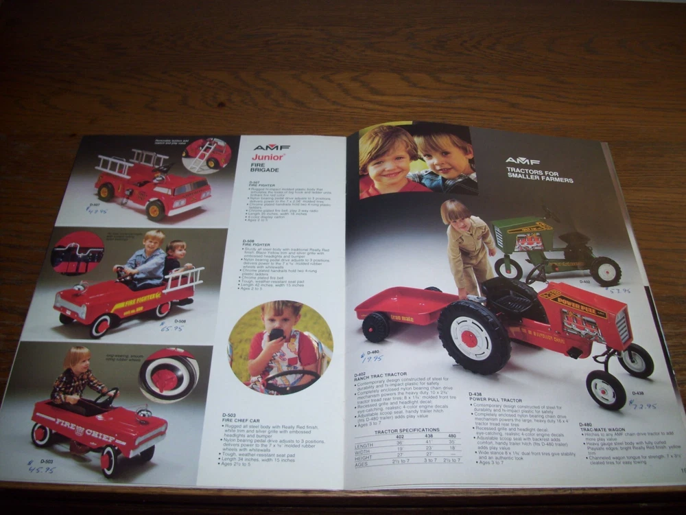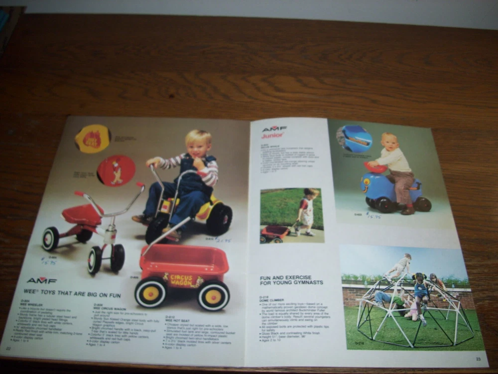 THIS IS A RARE VINTAGE 1981 AMF DEALER BICYCLE AND PEDAL CAR CATALOG WITH "WONDER WOMAN," "SPIDERMAN," "ROADRUNNER," AND BMX BICYCLES, METAL PEDAL CARS, PEDAL FIRE TRUCKS, PEDAL TRACTORS, PEDAL CHOPPERS, METAL WAGONS, AND TRICYCLES SHOWN. THE CATALOG INCLUDES LARGE FULL-PAGE COLOR PHOTOS AND DESCRIPTIONS. THERE ARE ALSO SMALLER COLOR PHOTOS OF ALL THE AMF ITEMS IN THE CATALOG ON TWO-PAGES IN THE FRONT OF THE CATALOG. OTHER RARE AMF BRAND BICYCLES, PEDAL CARS, PEDAL FIRE TRUCKS, PEDAL TRACTORS, TRICYCLES, WAGONS, PLAYGROUND EQUIPMENT, AND MORE ARE INCLUDED IS THIS 23-PAGE CATALOG. IT IS FILLED WITH INFORMATION AND LOADS OF FUN TO GO THROUGH. IT IS IN VERY-GOOD CONDITION, WITH SOME PRICES PRINTED NEXT TO SOME OF THE ITEMS. THIS VINTAGE 1981 DEALER CATALOG IS VERY DIFFICULT TO FIND AFTER 42 YEARS. IT'S THE ONLY ONE I HAVE! I WILL CAREFULLY PACKAGE AND SHIP THIS ITEM BY USPS GROUND ADVANTAGE MAIL WITH TRACKING. (NOTE: I DO COMBINE SHIPPING COSTS ON MULTIPLE ITEMS WHEN POSSIBLE-JUST ADD YOUR ITEMS TO YOUR SHOPPING CART AND REQUEST A COMBINED INVOICE BEFORE PAYING). *** PLEASE PAY WITH AN EBAY GIFT CARD OR ANOTHER FORM OF PAYMENT. *** PLEASE CHECK OUT MY OTHER ITEMS.