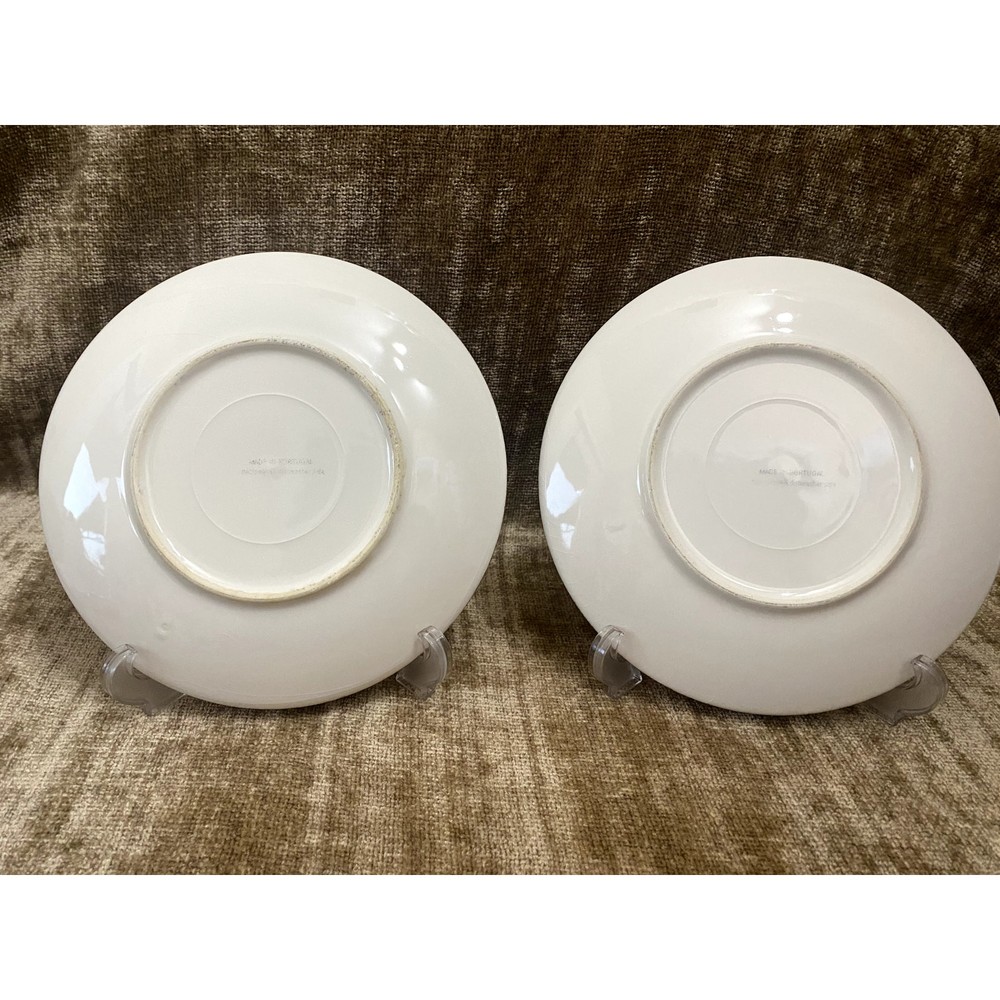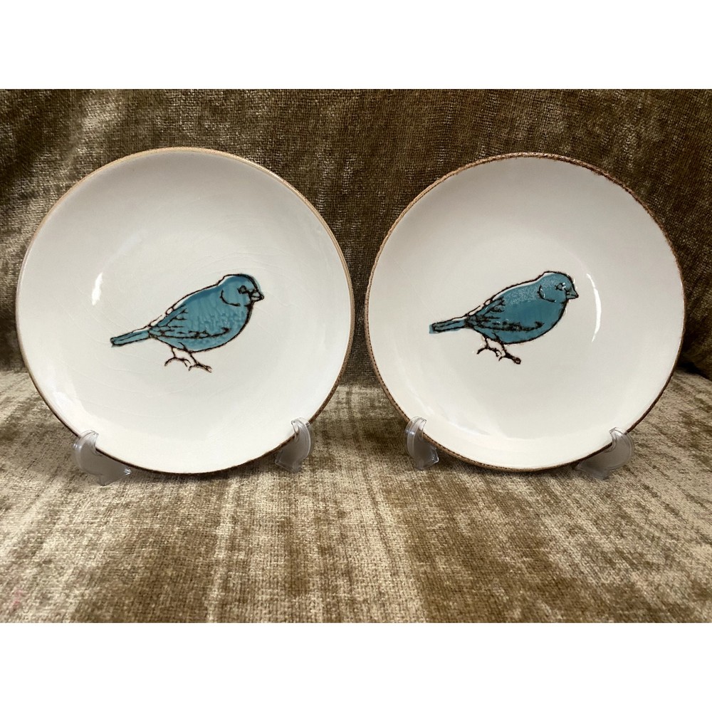 - Product: V4C4 Bird Center Dinner Plates by Value Ceramic - Dimensions: Each plate measures 8.5 inches in diameter - Design: Elegant off-white color with smooth, coupe style - Decoration: Features a charming bluebird in the center and brown trim on the rims - Origin: Crafted in Portugal, showcasing exceptional European craftsmanship - Set Includes: Two plates - Status: Discontinued model - Production Period: Circa 2014 - 2023 - Condition: Handpicked; great condition; few to no discernible flaws but only what's consistent with age-wear; see photos as part of full description/condition; sold as is. Key Features: - Sophisticated design suitable for both casual and formal dining - Unique bird motif adds a touch of nature and serenity to your table setting - Off-white base with brown trim provides a classic, versatile look - Made from high-quality materials for durability and longevity - Perfect for collectors and enthusiasts of unique tableware designs Enhance your dining experience with these beautifully designed plates, ideal for adding a subtle touch of elegance and charm to any meal.