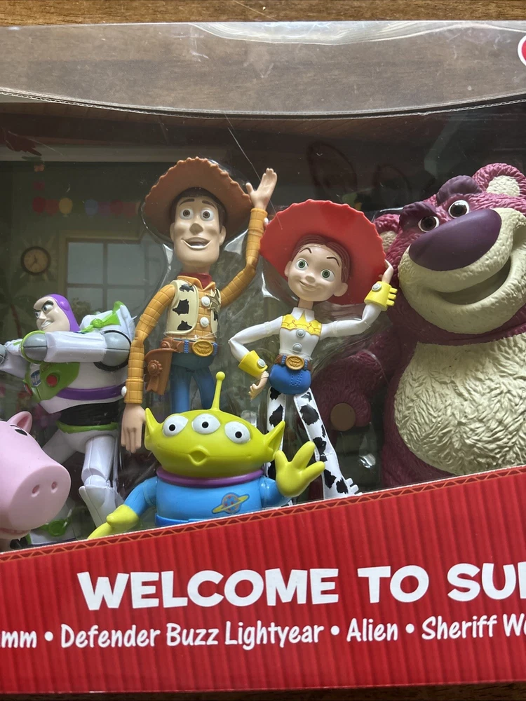 New in package! Rare find! Toy Story “Welcome to Sunnyside” set. Includes Rex, Hamm, Defender Buzz Lightyear, Alien, Sheriff Woody, Jessie, and Lotso.