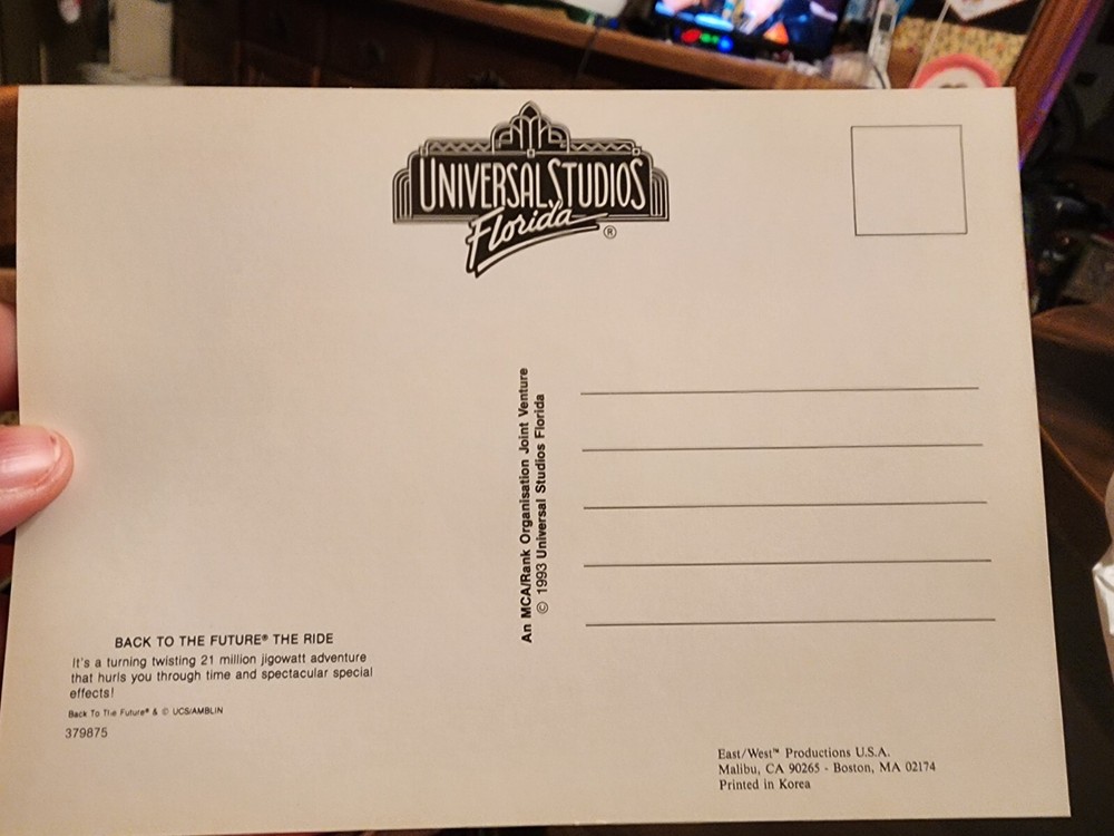 RARE AND UNUSED The product is a vintage postcard from 1993 featuring back to the future the ride at UNIVERSAL STUDIOS in Florida. The postcard showcases the theme of universities and is from Hollywood. It is a topographical postcard and is new in condition.