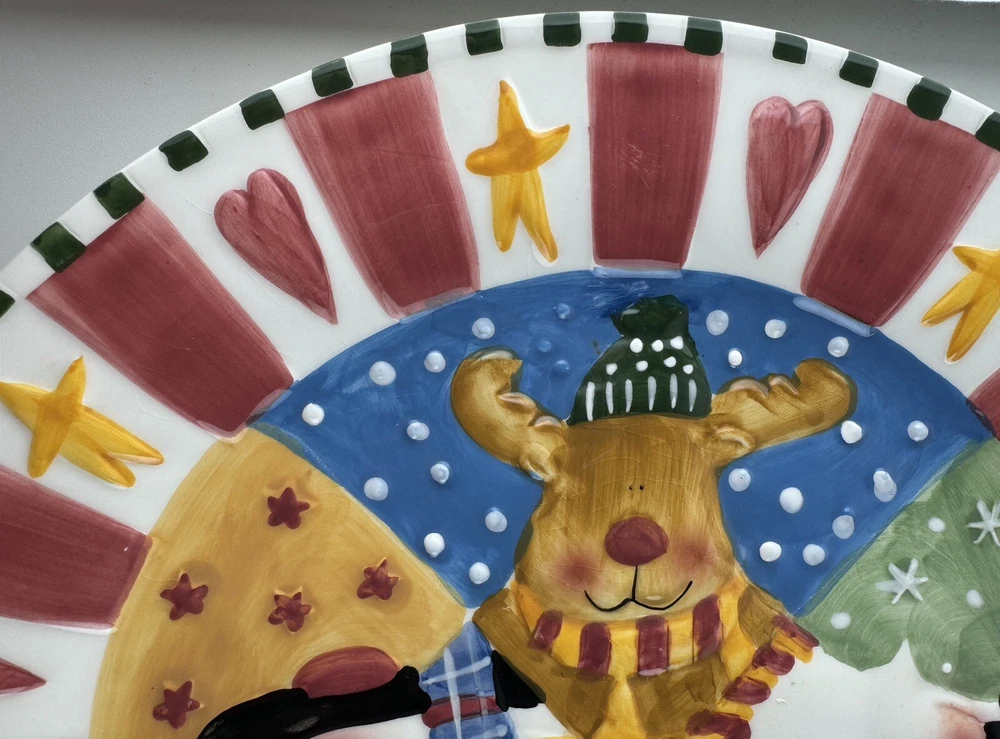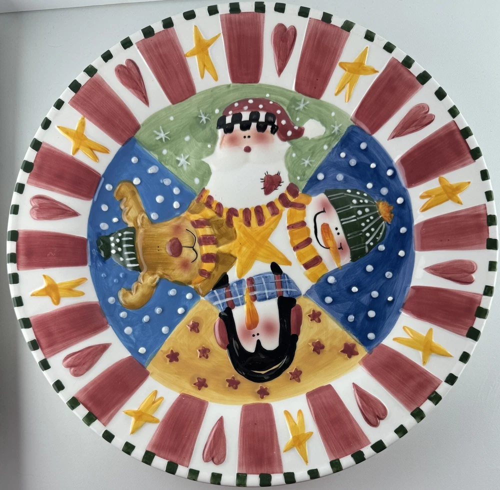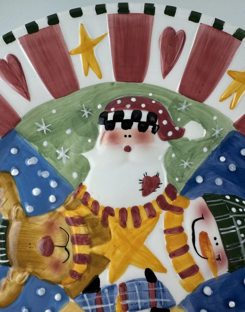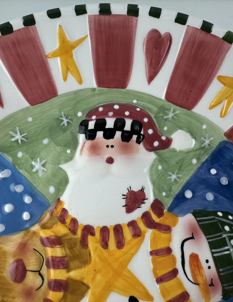 One chip on the underside, pic 2. There is a small crack on Santa’s beard that doesn’t go all the way through the plate, see all photos. Approximately 12” wide.