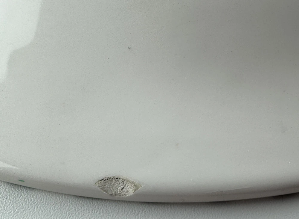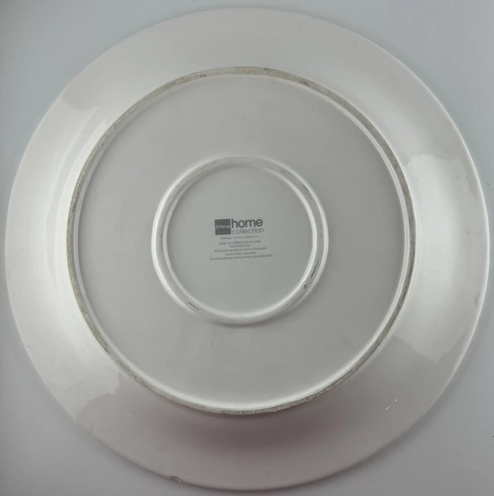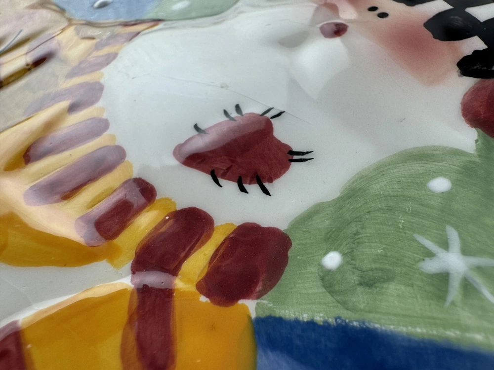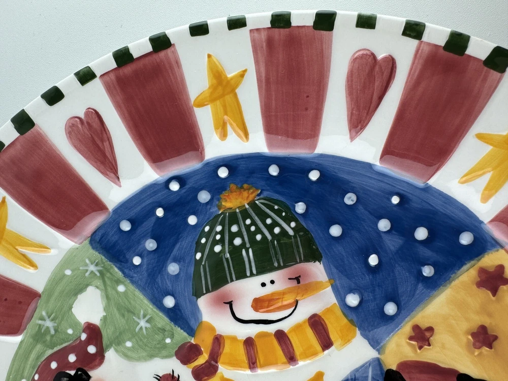 One chip on the underside, pic 2. There is a small crack on Santa’s beard that doesn’t go all the way through the plate, see all photos. Approximately 12” wide.