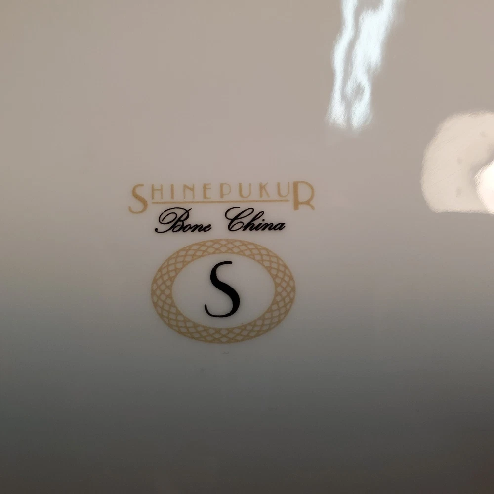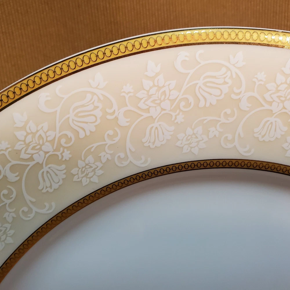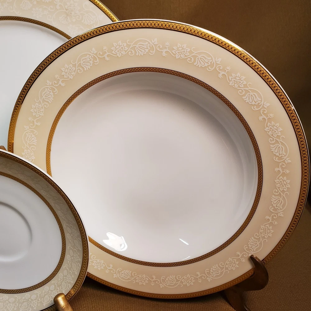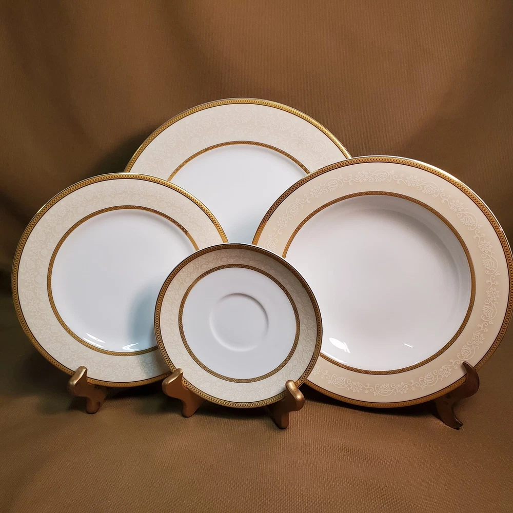 This rare four-piece dinner set from Shinepukur Ceramics is a must-have for collectors and enthusiasts of fine bone china. The set features gold verge and trim, and white floral and swirls on a cream band that add a touch of elegance to any dining table. The set includes a rimmed soup bowl, saucer, salad plate, and dinner plate, all in the Absinthe pattern. This vintage dinner set was manufactured in Bangladesh from 2007-2009 and has a printed backstamp. The lovely set is in excellent condition.