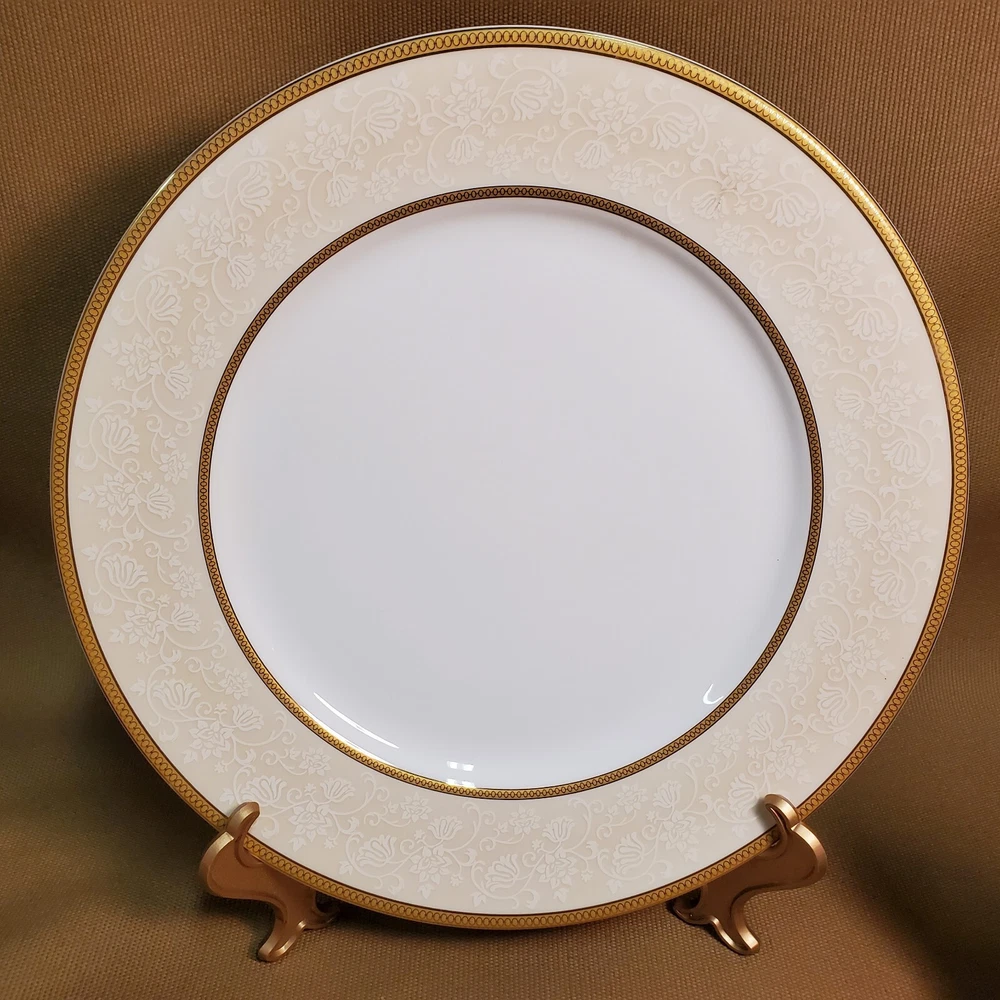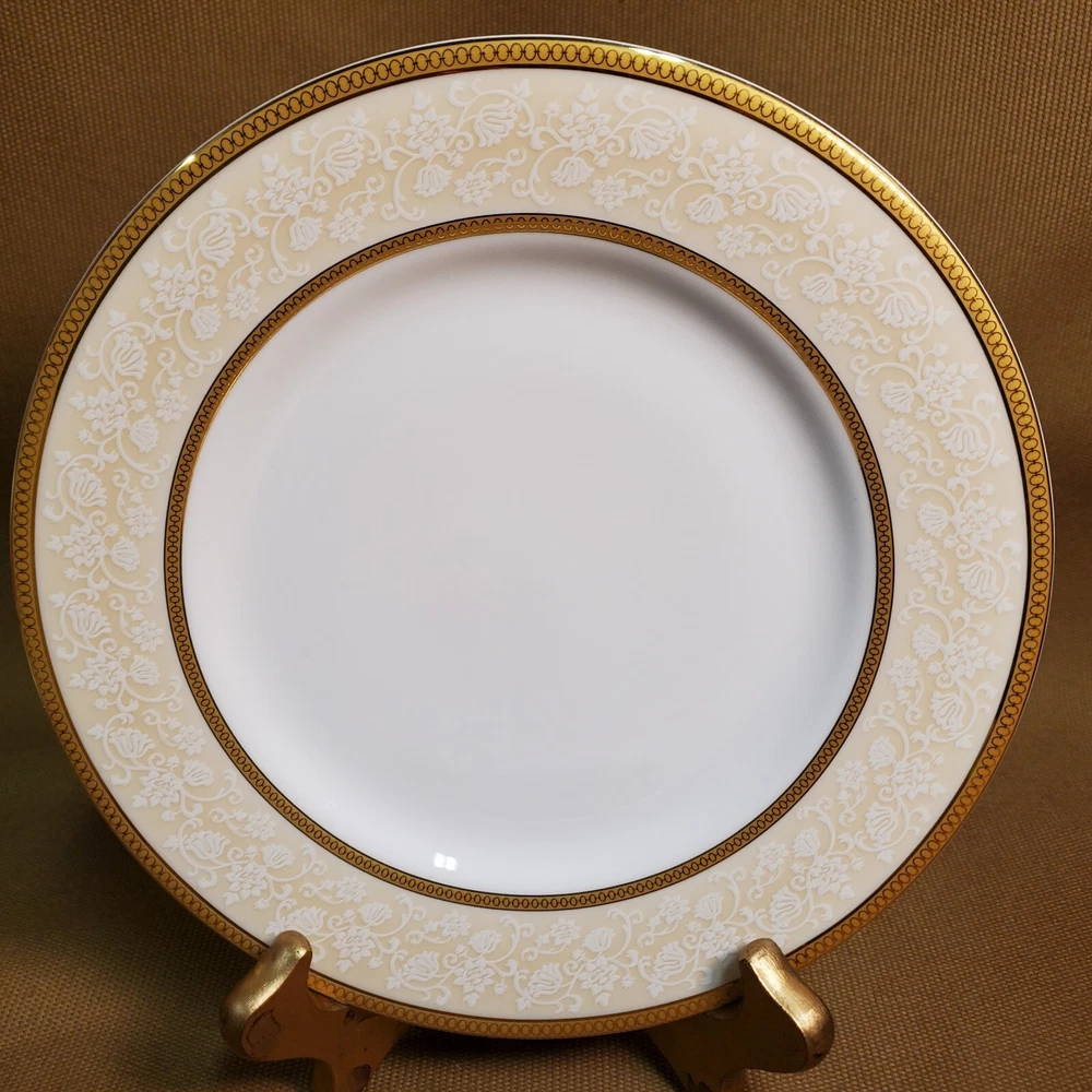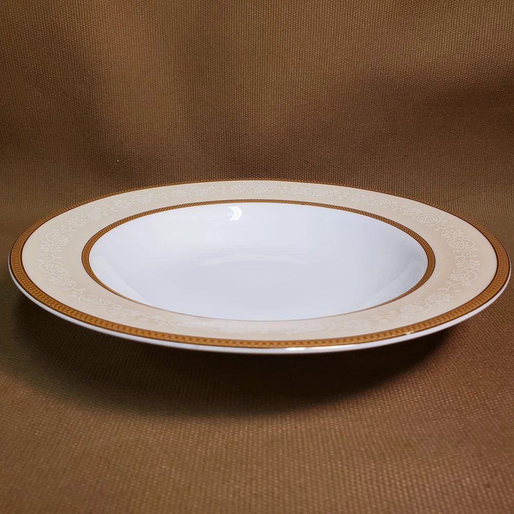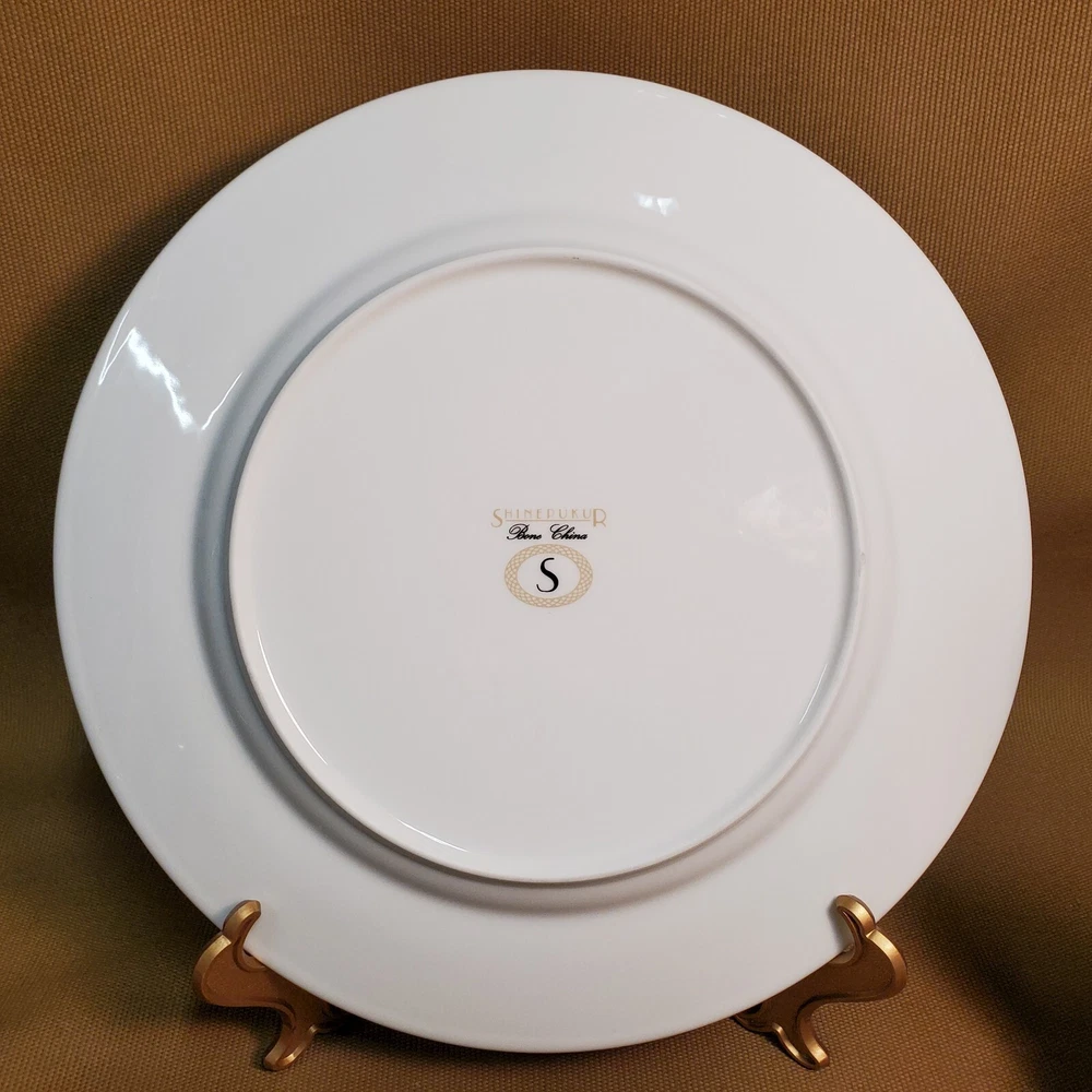 This rare four-piece dinner set from Shinepukur Ceramics is a must-have for collectors and enthusiasts of fine bone china. The set features gold verge and trim, and white floral and swirls on a cream band that add a touch of elegance to any dining table. The set includes a rimmed soup bowl, saucer, salad plate, and dinner plate, all in the Absinthe pattern. This vintage dinner set was manufactured in Bangladesh from 2007-2009 and has a printed backstamp. The lovely set is in excellent condition.