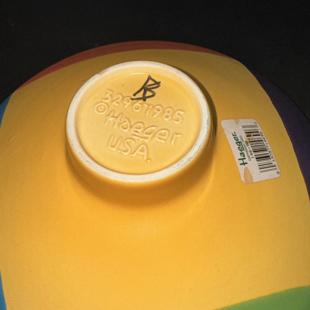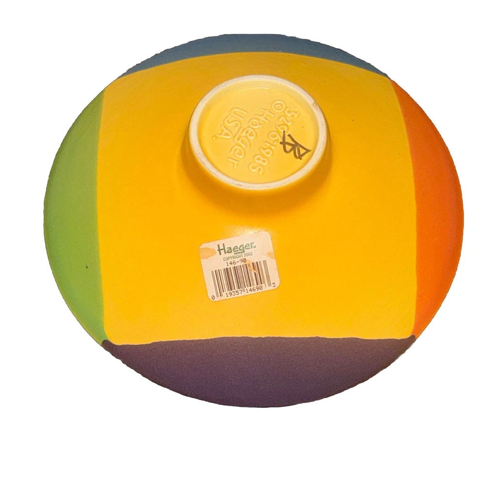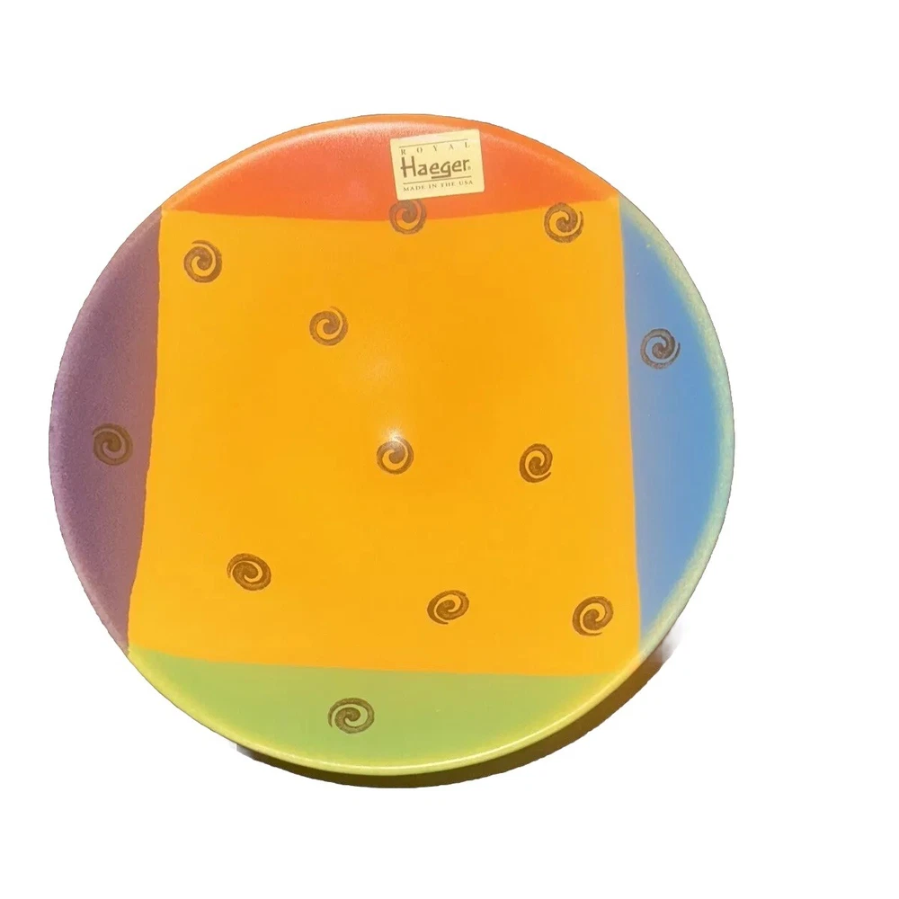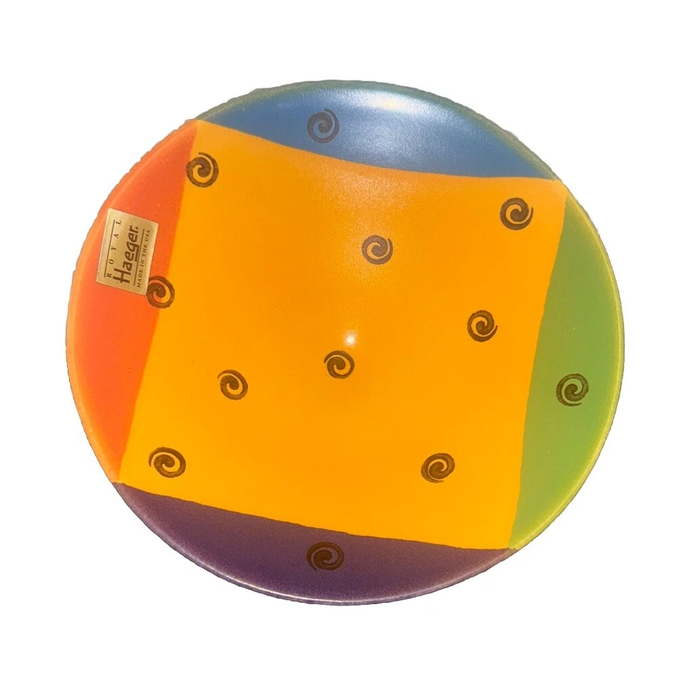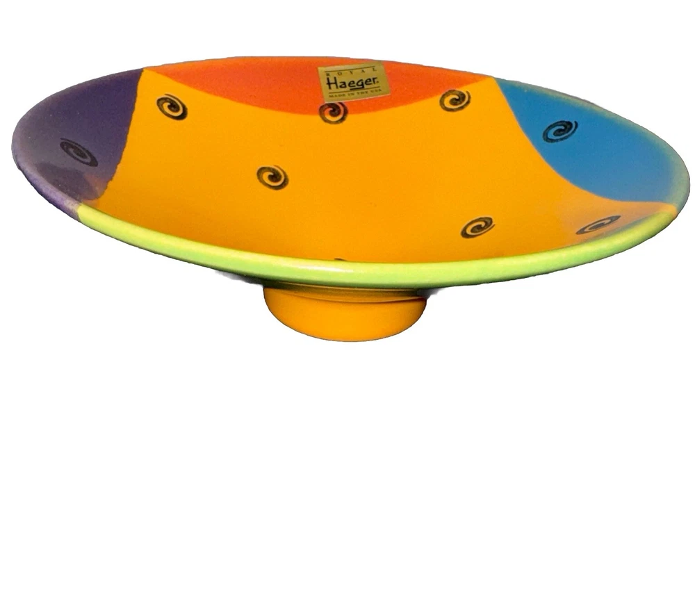 Add a touch of charm to your table with this rarely seen, signed, and hand-painted footed/Pedestal round bowl from Royal Haeger Potteries. The 8" bowl features a beautiful and unique abstract spiral design in multicolor. Made in 2003 Please feel free to contact me with any questions you have
