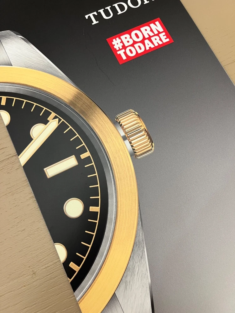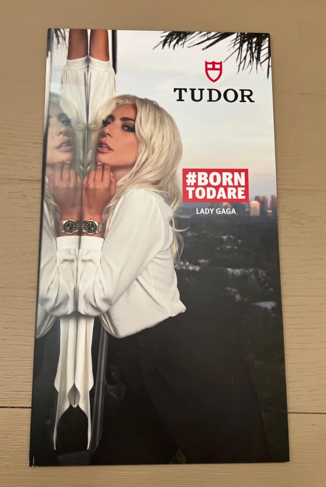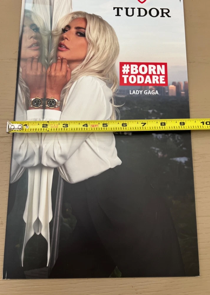 RARE TUDOR Watch Lady Gaga Black Bay Store Counter Display Sign Ad Born to Dare LARGE TWO-SIDED. First image is just. Side by side to you can see what it looks like from the front and the back. The sale is for only 1 sign. Great! Collectors! Please review pictures for any signs of wear from storage. Please review all pictures before purchasing as returns are not accepted. Domestic shipping only. Thank you!
