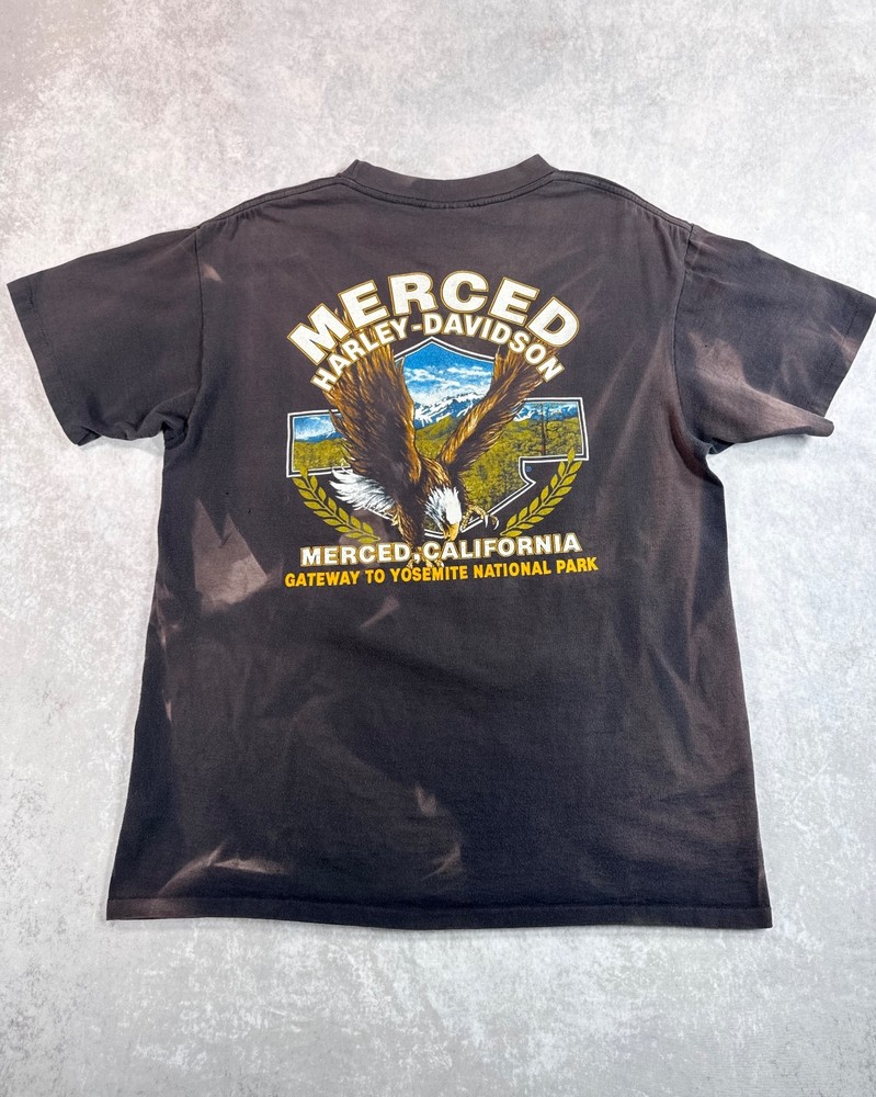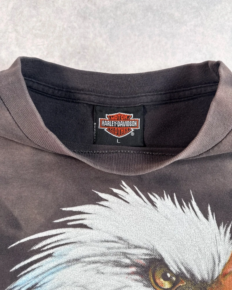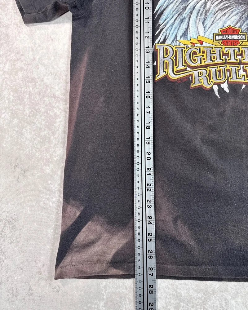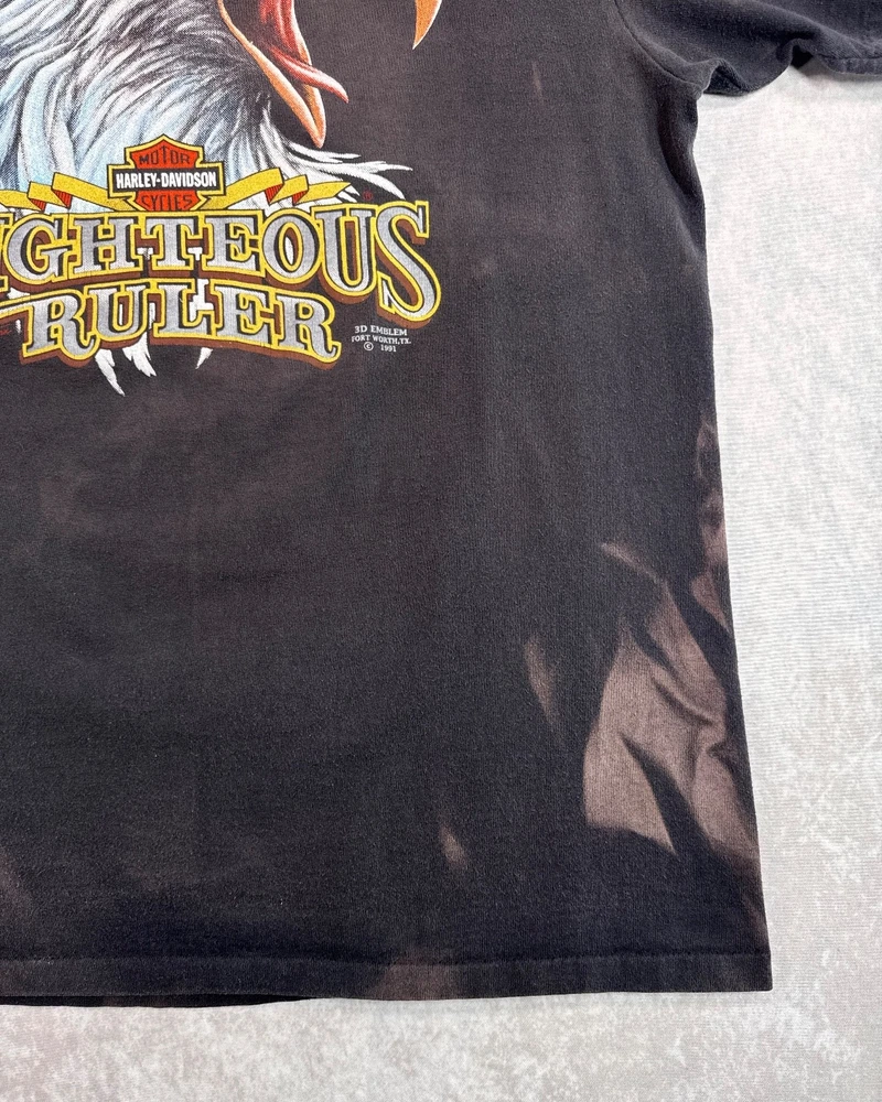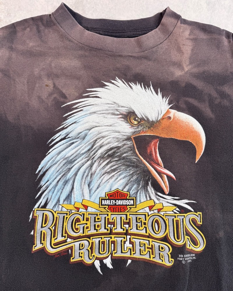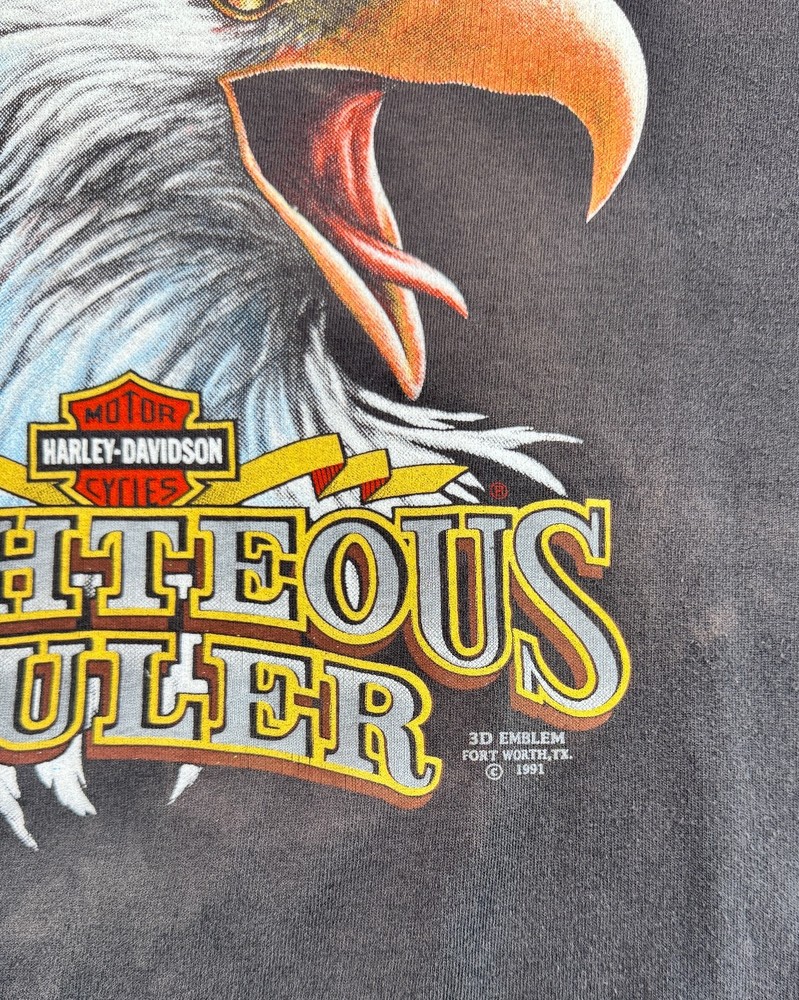 This product is a vintage 1991 Harley Davidson "Righteous Ruler" 3D emblem t-shirt by Harley-Davidson. Made of cotton with a black color, this short sleeve shirt has a crew neck and is machine washable. With a regular fit, this t-shirt is perfect for all seasons - summer, fall, and spring. Size large, this shirt is a unique and collectible piece for any Harley-Davidson enthusiast looking to add a classic touch to their wardrobe. SEE PHOTOS FOR ALL DETAILS AND MEASUREMENTS.