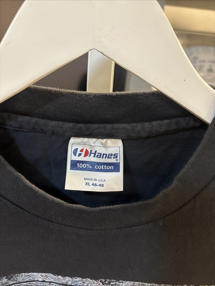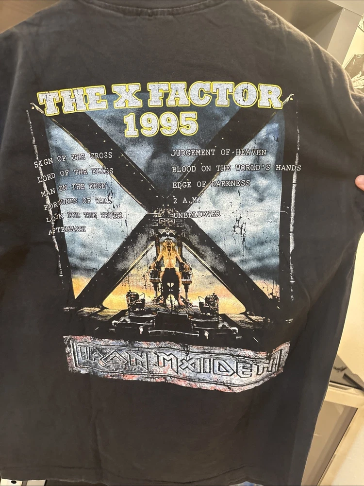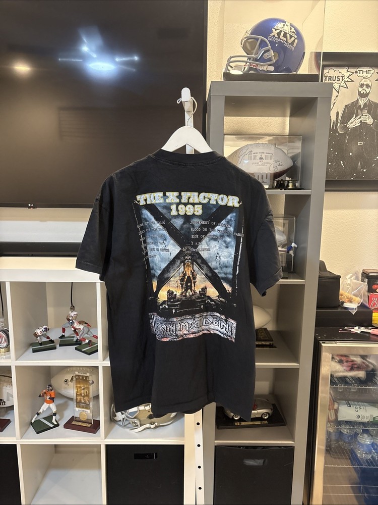 This rare vintage 1995 style single stitch Iron Maiden The X Factor All Over Print (AOP) boot tee is a must-have for any rock music collector or fan of the iconic band. Made of cotton with a crew neck and short sleeves, this black tee features a graphic print of the band's logo on the front and back. The XL size and regular fit make it a comfortable and stylish addition to any wardrobe, perfect for all seasons and easy to care for. Made by Hanes in the United States, this tee captures the essence of 90s rock music and is a unique piece for any fan of Iron Maiden.