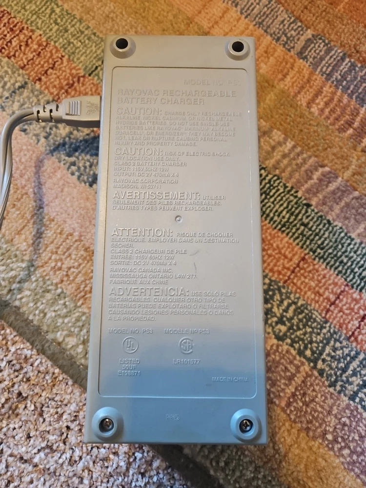 The RAYOVAC Universal Battery Charger PS3 is designed for charging various battery sizes including AA, AAA, C, D, and 9V. It is compatible with both rechargeable alkaline and NiMH batteries with a capacity of up to 8. The charger operates on mains power and has a voltage of 9V. Made in China, this versatile charger is a convenient solution for keeping your electronic devices powered up.