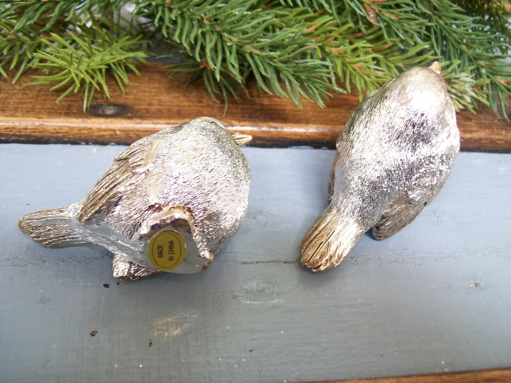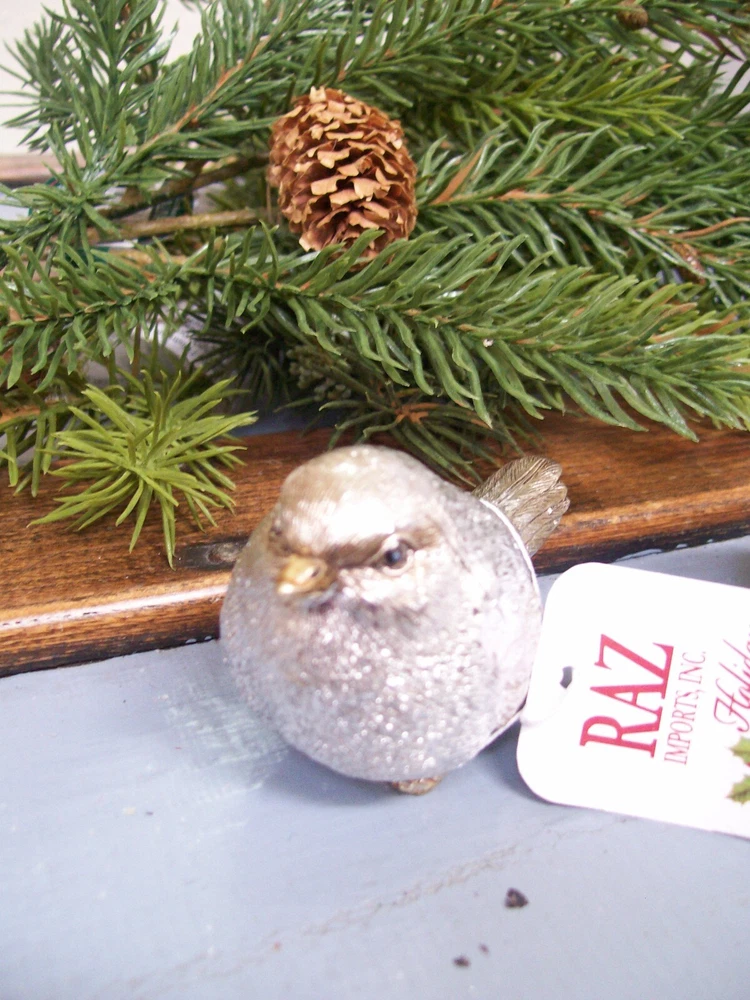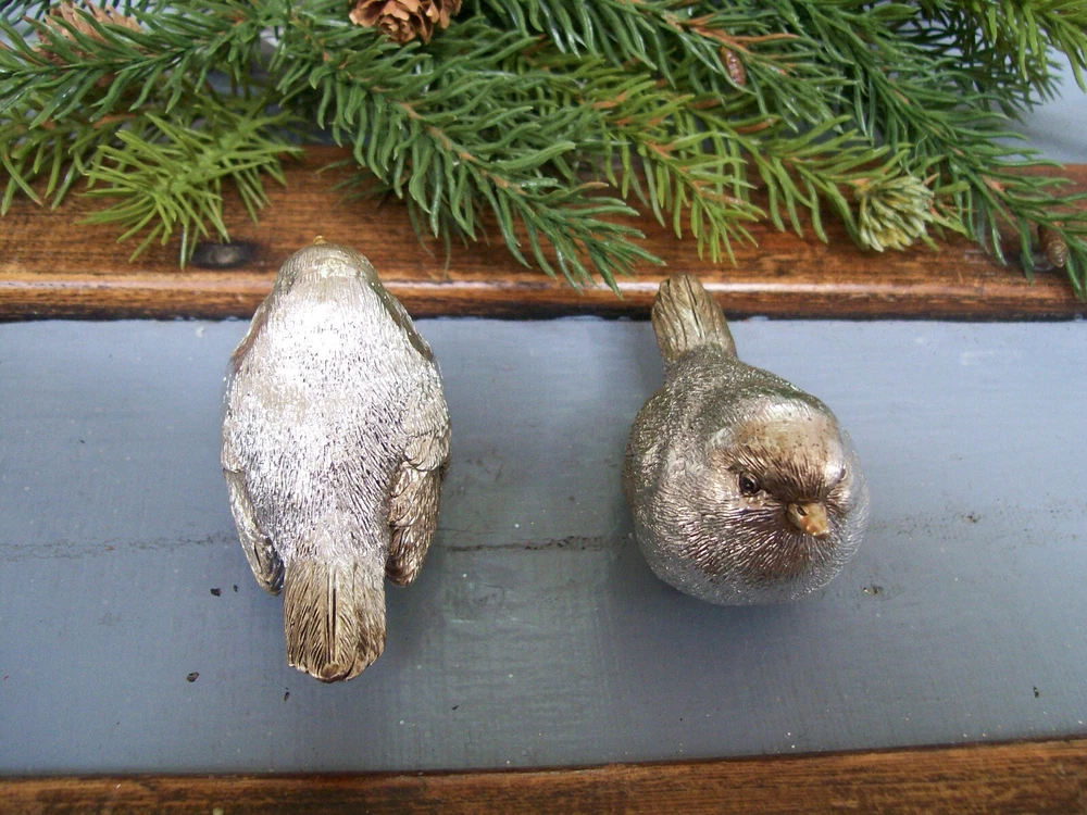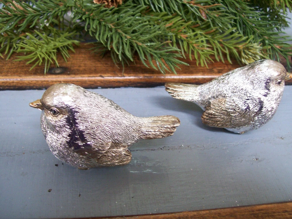 RAZ NWT Set 2 SILVER with GOLD accent Snow BIRD CHRISTMAS Figurine Decorations This listing is for a set of two NEW with Tag SILVER with Gold Accents Snow BIRD Christmas Figurine Ornaments. These adorable bird figurines are each are carefully hand painted and detailed. Each one is very slightly different from the next since they are hand finished. The bodies are shiny silver with gold accented beak and feet with a light gold wash with a touch of antiquing on the face wing and tail feathers. These are gorgeous little birds!! The birds each measure approximately 3" long x 1-1/2" wide x 1-3/4" tall . I do have other bird ornaments available in other listings. Please enlarge the photo's for a better look, and ask any questions before purchase. This would make a fantastic addition to any table or mantel... or tuck them into your Christmas tree or a wreath! MANY possibilities! Thanks for looking! Please also check out my other listings and my ebay store... I will combine shipping whenever possible!! Every buyer gets a MyStoreRewards invitation for cash back Track Page Views With Auctiva's FREE Counter