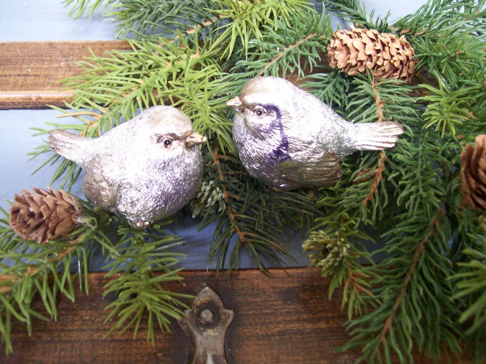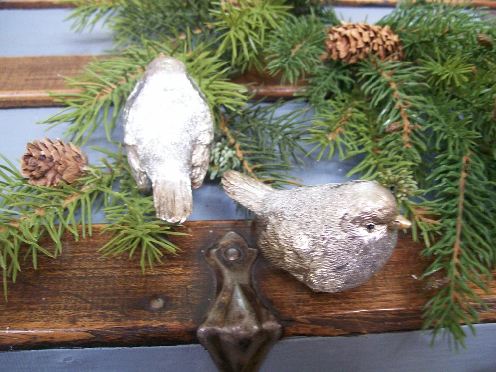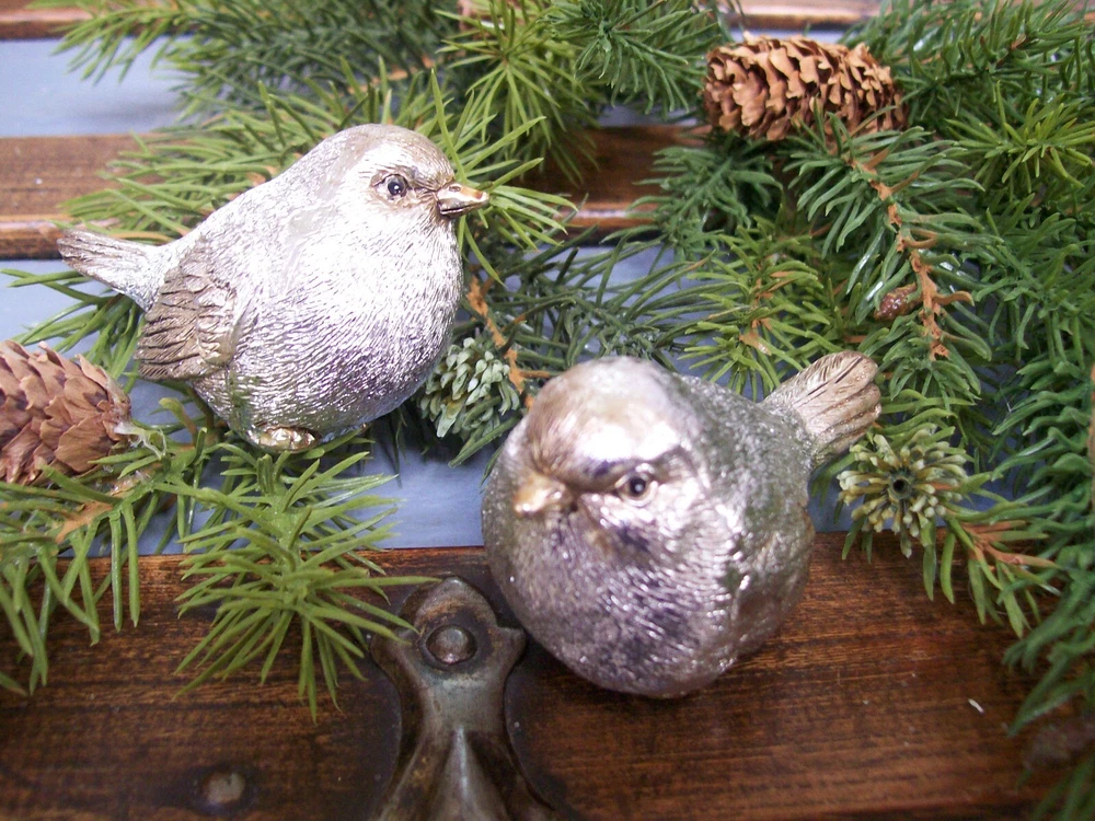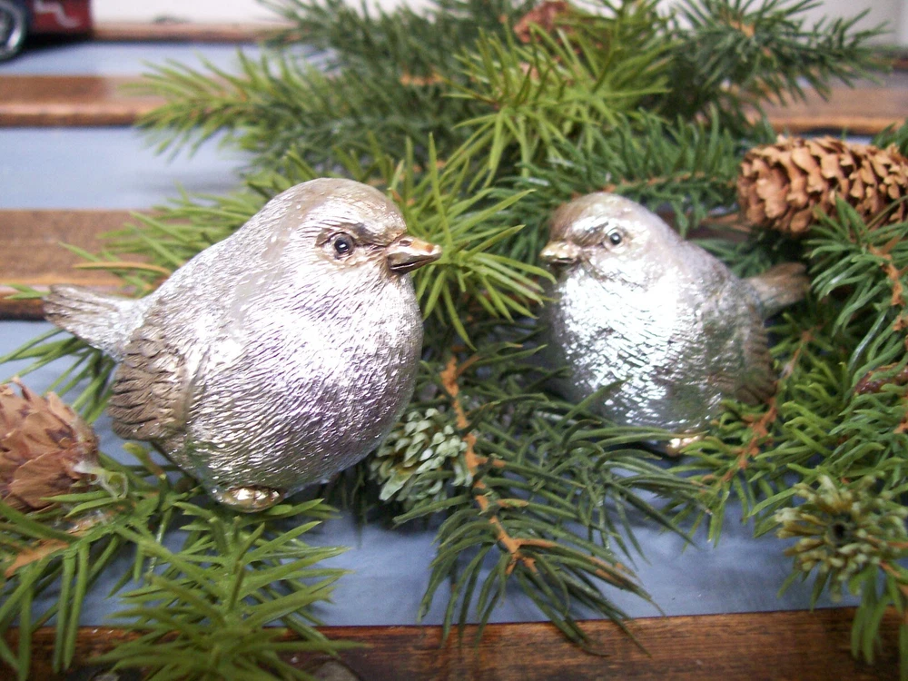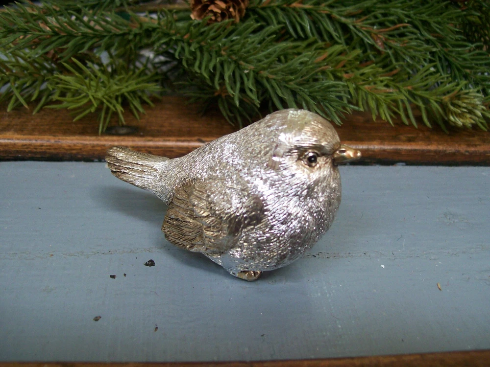 RAZ NWT Set 2 SILVER with GOLD accent Snow BIRD CHRISTMAS Figurine Decorations This listing is for a set of two NEW with Tag SILVER with Gold Accents Snow BIRD Christmas Figurine Ornaments. These adorable bird figurines are each are carefully hand painted and detailed. Each one is very slightly different from the next since they are hand finished. The bodies are shiny silver with gold accented beak and feet with a light gold wash with a touch of antiquing on the face wing and tail feathers. These are gorgeous little birds!! The birds each measure approximately 3" long x 1-1/2" wide x 1-3/4" tall . I do have other bird ornaments available in other listings. Please enlarge the photo's for a better look, and ask any questions before purchase. This would make a fantastic addition to any table or mantel... or tuck them into your Christmas tree or a wreath! MANY possibilities! Thanks for looking! Please also check out my other listings and my ebay store... I will combine shipping whenever possible!! Every buyer gets a MyStoreRewards invitation for cash back Track Page Views With Auctiva's FREE Counter