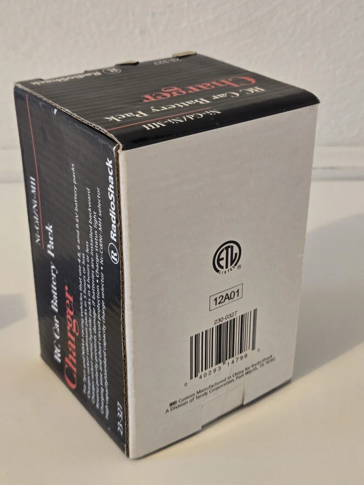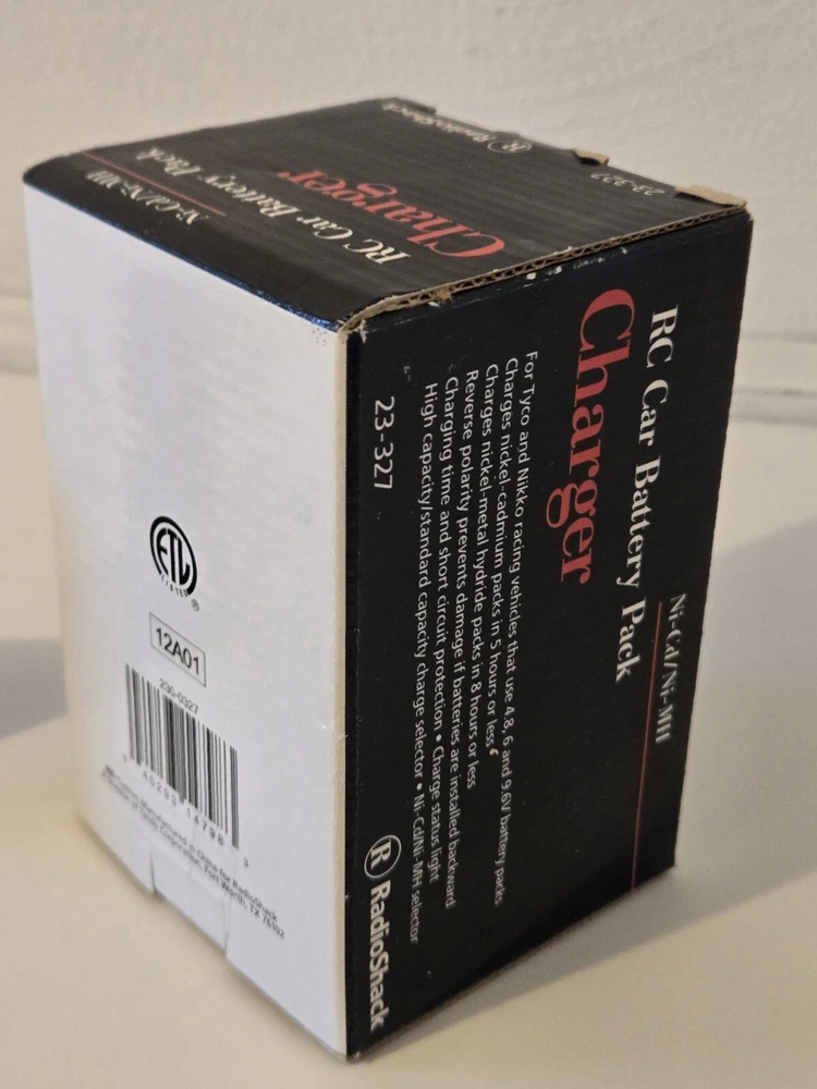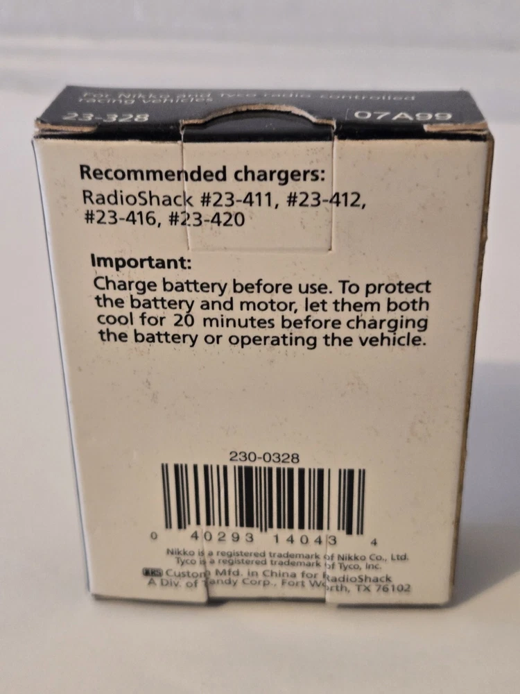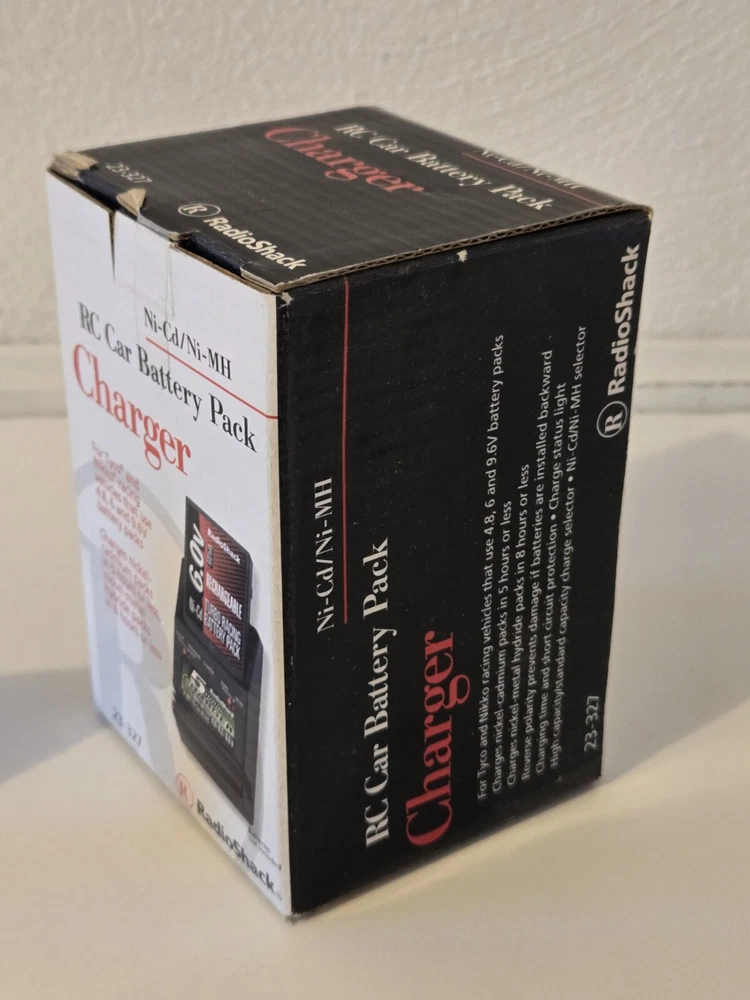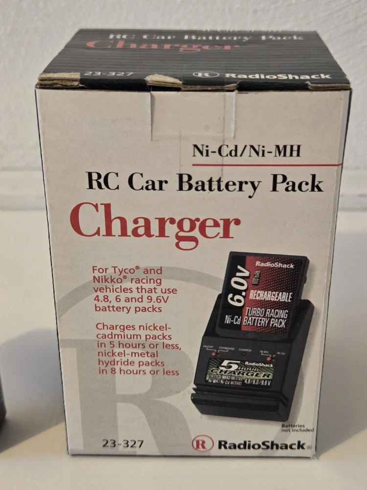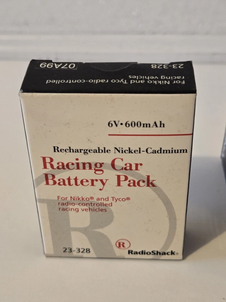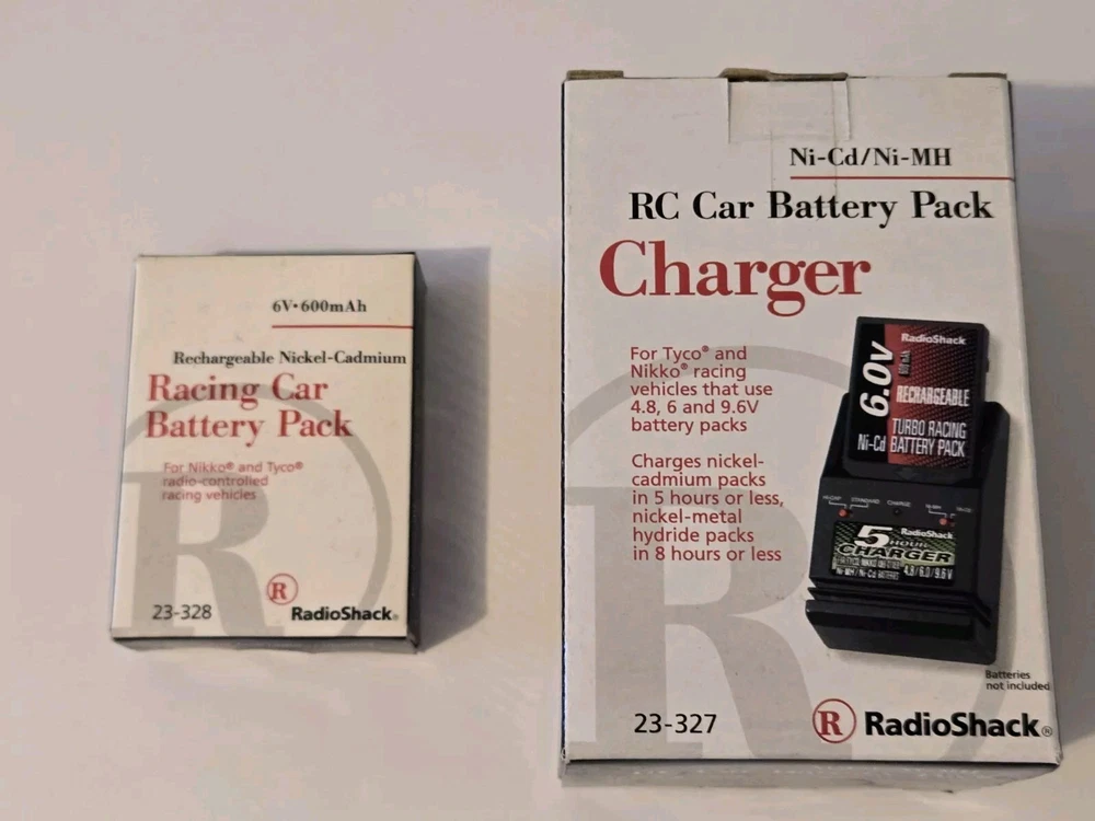 RC 6.0V Rechargeable NiCd Racing Battery Pack (23-328) & Charger (23-327). These are Brand New & Unopened. Radio Shack Brand. Battery is 6V for Tyco & Nikko. The charger is For Tyco & Nikko racing vehicles that use 4.8, 6 & 9.6 battery pack. 5 Hour charger time. Exact Age and Life of batteries is unknown. These are New Old Stock.