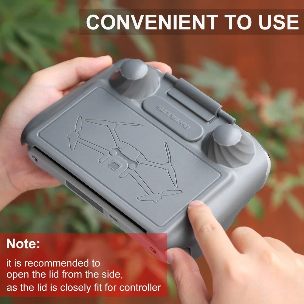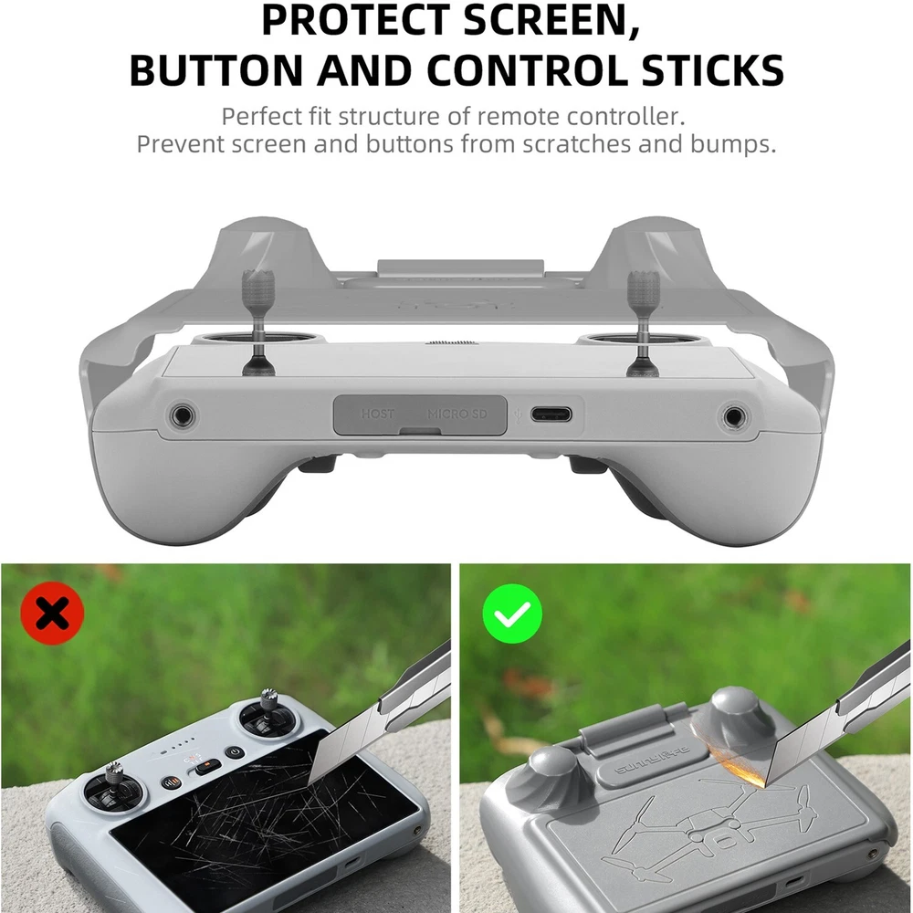 Product Description: Sunnylife 2 in 1 Controller Protector Screen Sun Hood Monitor Control Sticks Guard Cover for DJI RC Mini 3 Pro Features: - Multifunctional Controller Protector & Sun Hood. It became a sun hood after opening the fixable lid. - Protect Screen, Button and Control Sticks. Perfect fit structure of remote controller. Prevent screen and buttons from scratches and bumps. - No Need to Remove Control Sticks. - No Need to Remove The Cover. You can put controller in Sunnylife AQX-1 safety carrying case, controller bag and combo bag, without removing the protective cover. Specifications: Brand: Sunnylife Name: 2 in 1 Controller Protector & Sunhood Applicable Models: for DJI Mini 3 Pro Controller Material: Plastic Color: Gray Packing Size: 176*128*51mm Net Weight: 65g Package Includes: 1 * Sun Hood 2 * Screws