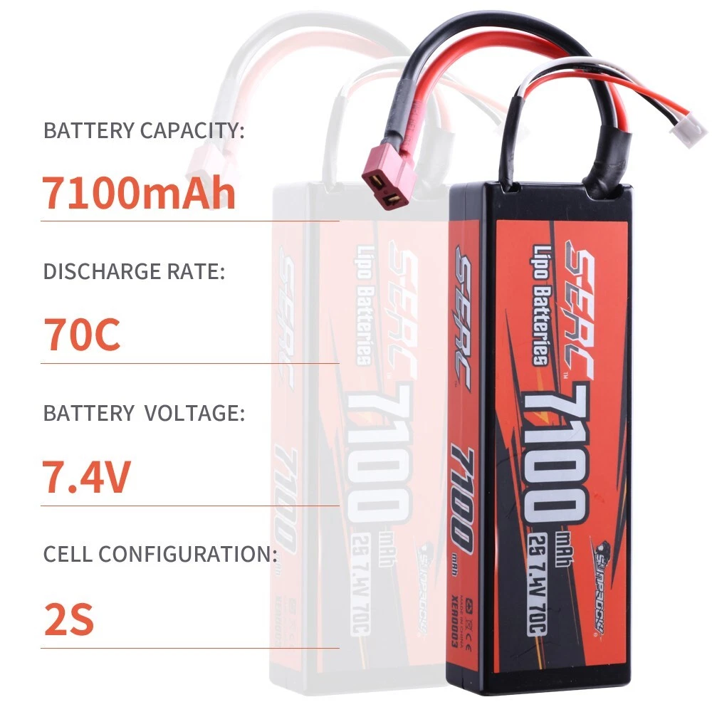 This high-quality RC Lipo Battery with a capacity of 7100mAh is perfect for your RC model vehicle car or truck. It comes with a T plug and a hard case for easy installation and protection. This battery is compatible with 1:8 and 1:10 scales and has a voltage of 7.4v. The battery is made with LiPo chemical composition and has a number of cells of 2S. It is suitable for ages 17 years and up and is manufactured in China. This battery is a great addition to your RC collection and will provide long-lasting power for your vehicle. Material: Lithium polym Capacity: 7100mAh Voltage: 7.4V Configuration: 2S1P Discharge Rate: 70C Plug: Deans T Dimension: 139*47*26mm/5.47*1.85*1.02inch (L*W*H) Approx weight: 315g/0.69lb For: RC vehicles,car,truck,tank,truggy racing model Warm Tips: only the voltage, dimension and the plug match, then it will fit Built-in protection mechanism ensures safe charging and use Don't overcharge more than 4.2V and don't over discharge below 3.2V Never leave battery unattended when charging